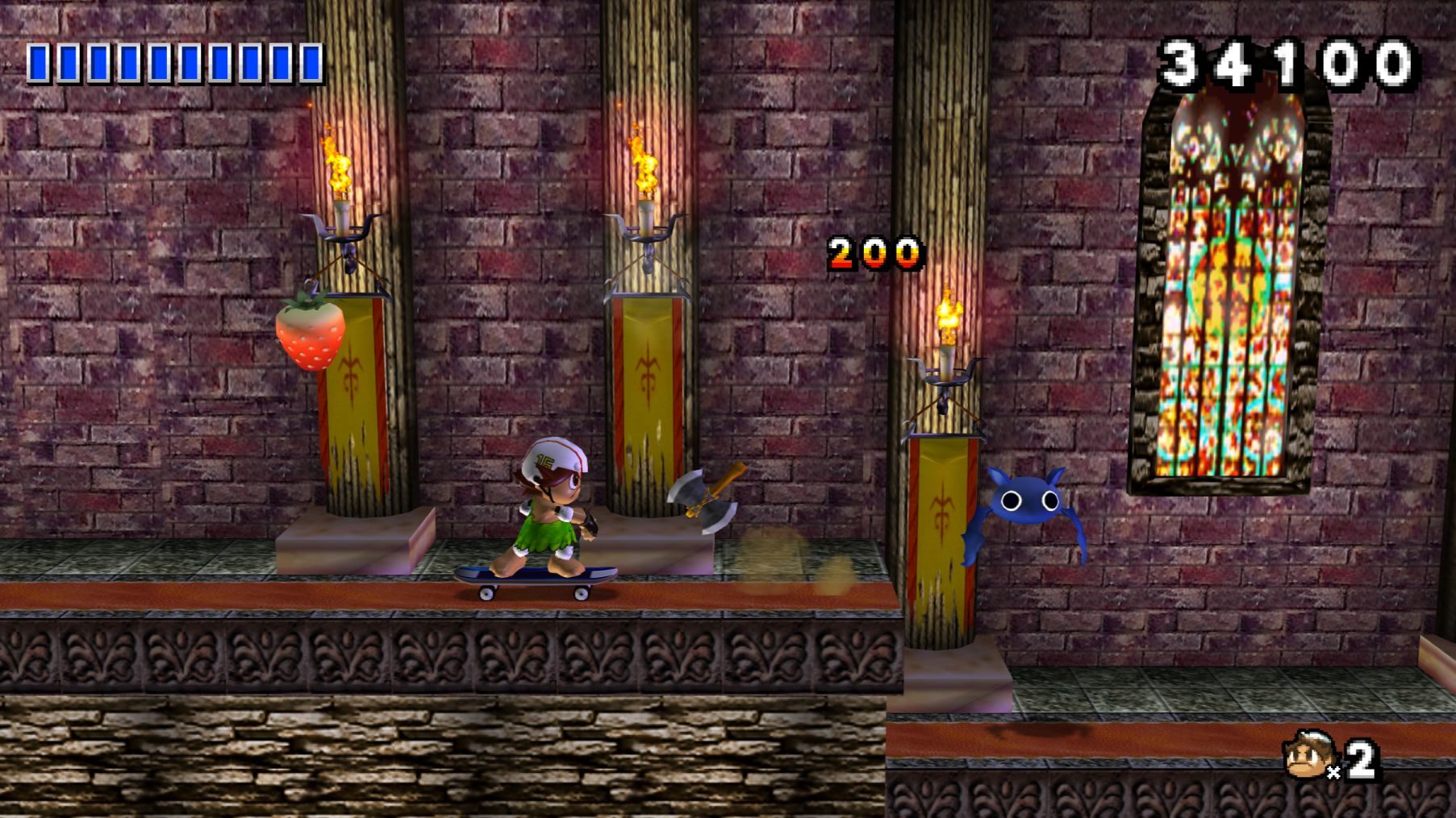 You’ll also collect different weapons, some which move in annoying arcs. These weapons will also destroy different enemies and obstacles, with the fireball blasting through nearly every obstacle. You can also collect a skateboard which does give you an additional hit. If you manage both the fireball and skateboard and get a good flow, it can be rewarding, but losing everything results in a big disappointment.