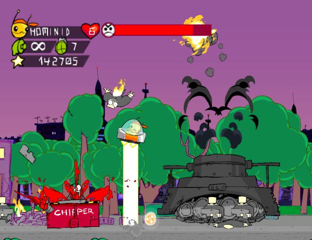 With this originally being a flash game, you can only shoot forwards or upwards – no diagonal shooting. Enemies either exploded in giant explosions or large fishes of blood. This covers up enemies and bullets, so you’ll constantly get hit by stuff you can’t see. Which is quite a significant problem when you die in one hit.