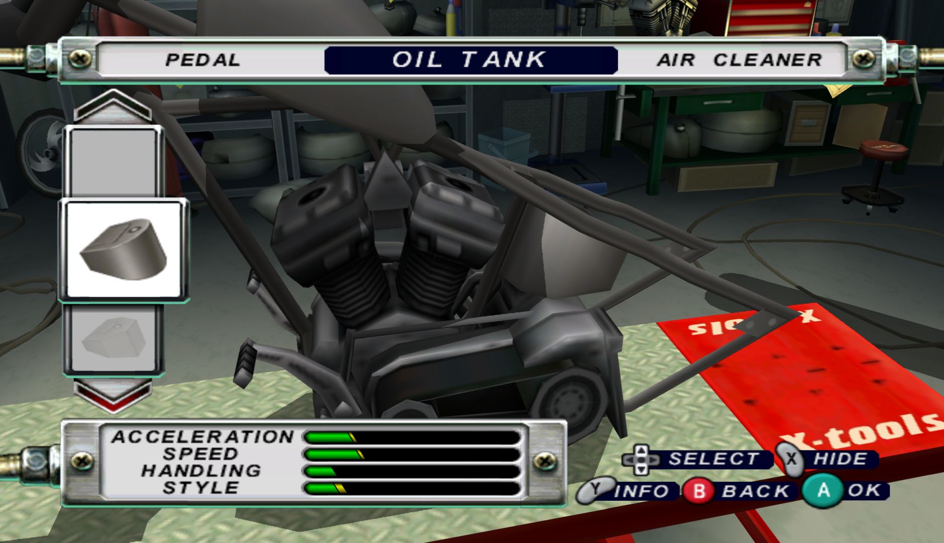 Naturally, the video game has very little focus on designing your own bike. At the stat of the game, you only have one option in most categories (and none in others), so all you can do is add a bit of colour to those parts (no freedom to create actual imagery). You unlock parts extremely slowly, and you’ll pretty much just want to use your latest unlocks to get better stats. In short, the creation side may as well not exist.