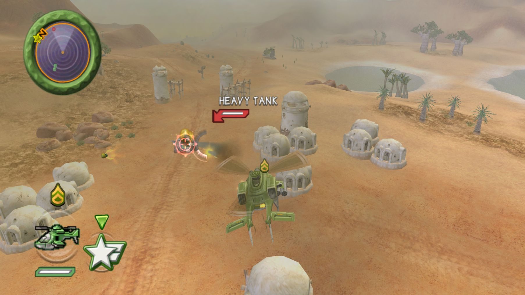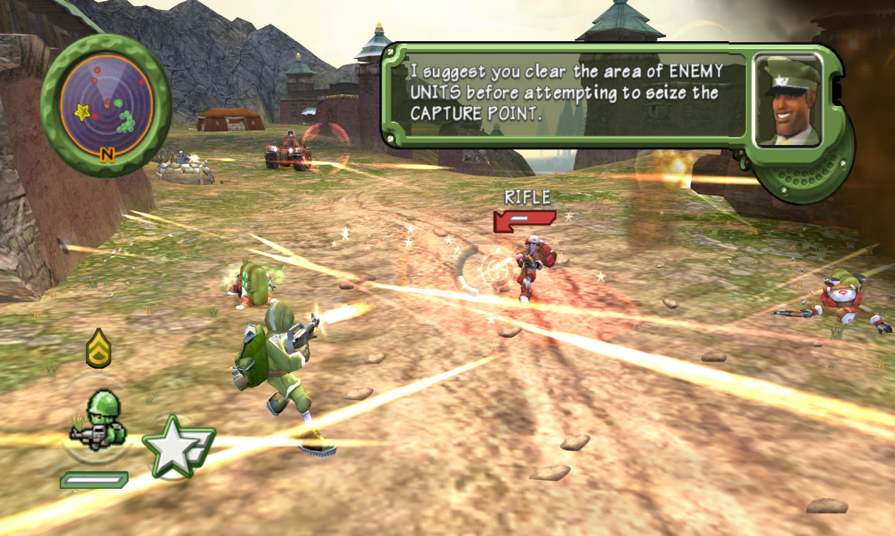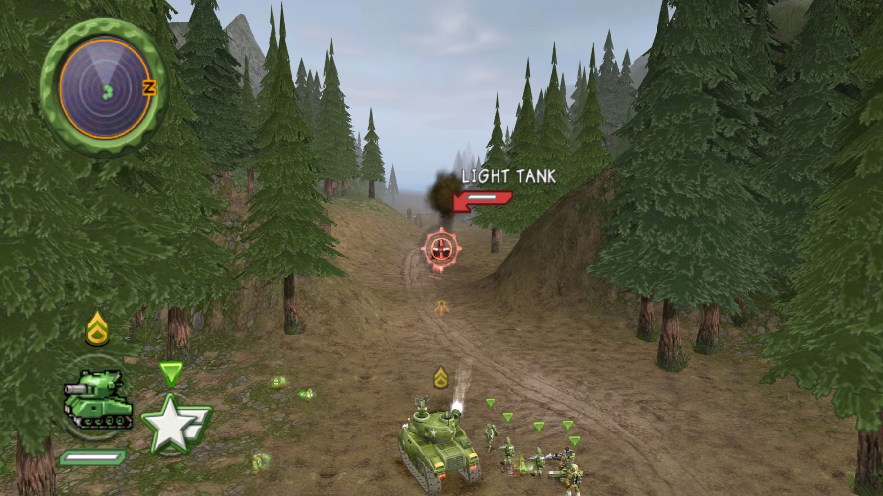 You control one unit and can move and shoot, with a lock-on to help target enemy units. You don’t have dual analogue control (which I’m not a fan of) as the C-stick is used to select between different unit types (or even individual units) to order them to stand guard, follow you or attack your target. The D-pad is only used to swap between two camera angles, so I feel like the D-pad would be better to select with full camera control on the C-stick. However, the most important part of this is the Z button.