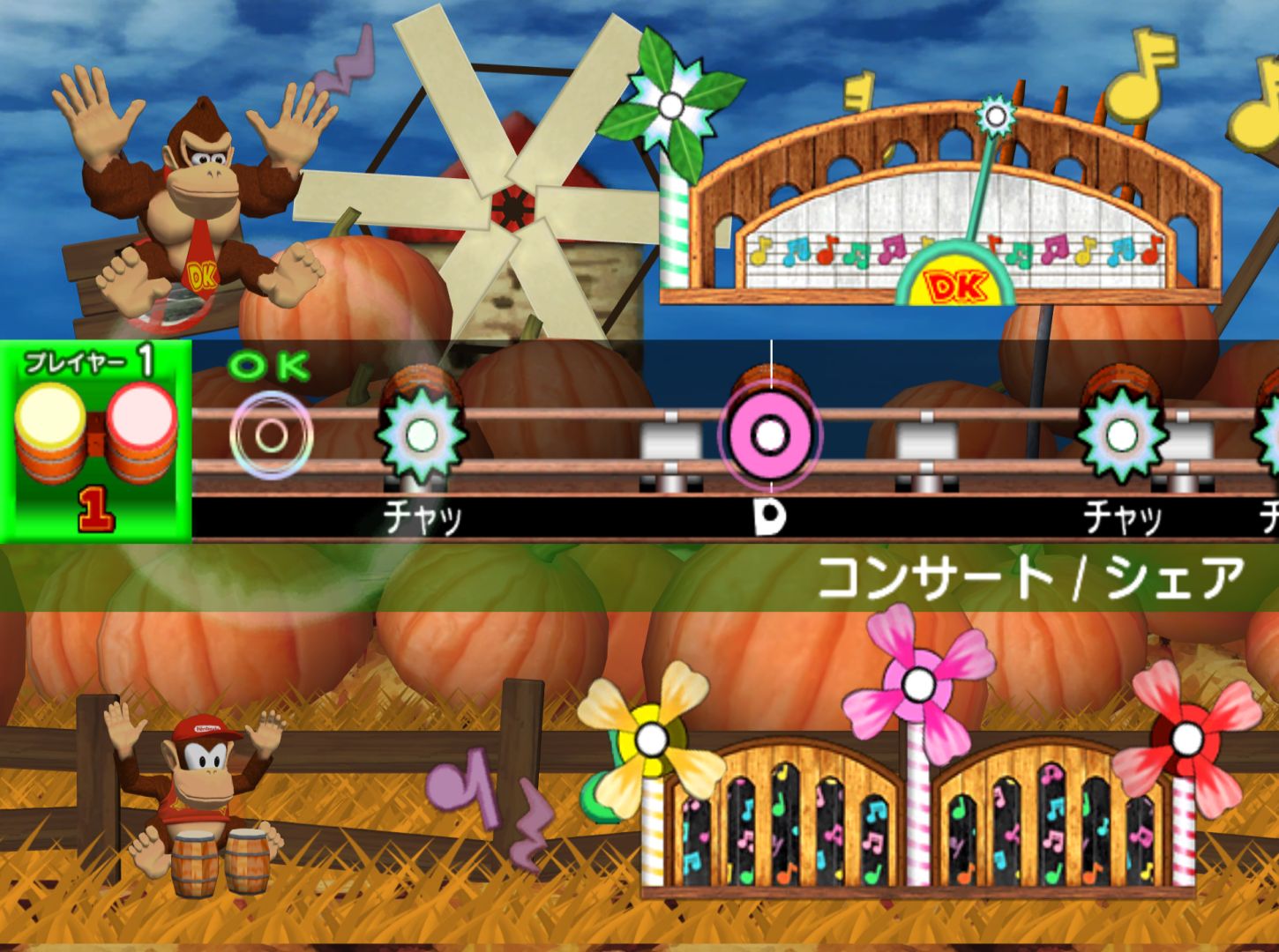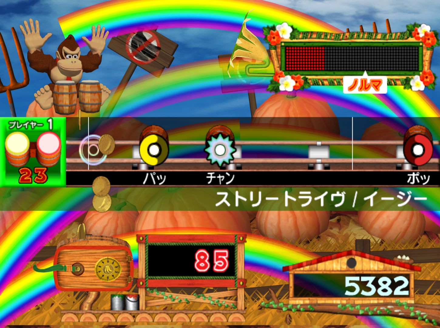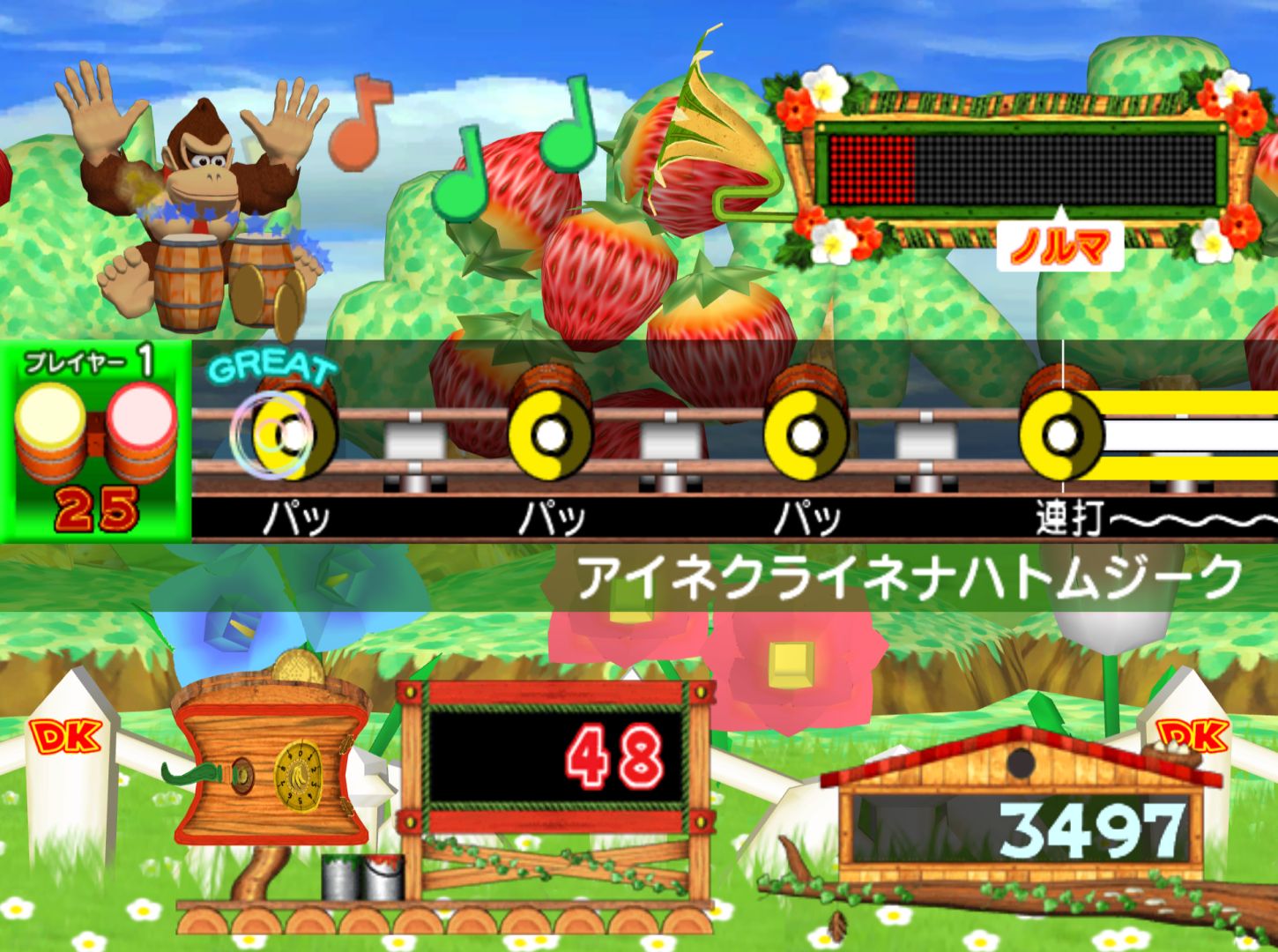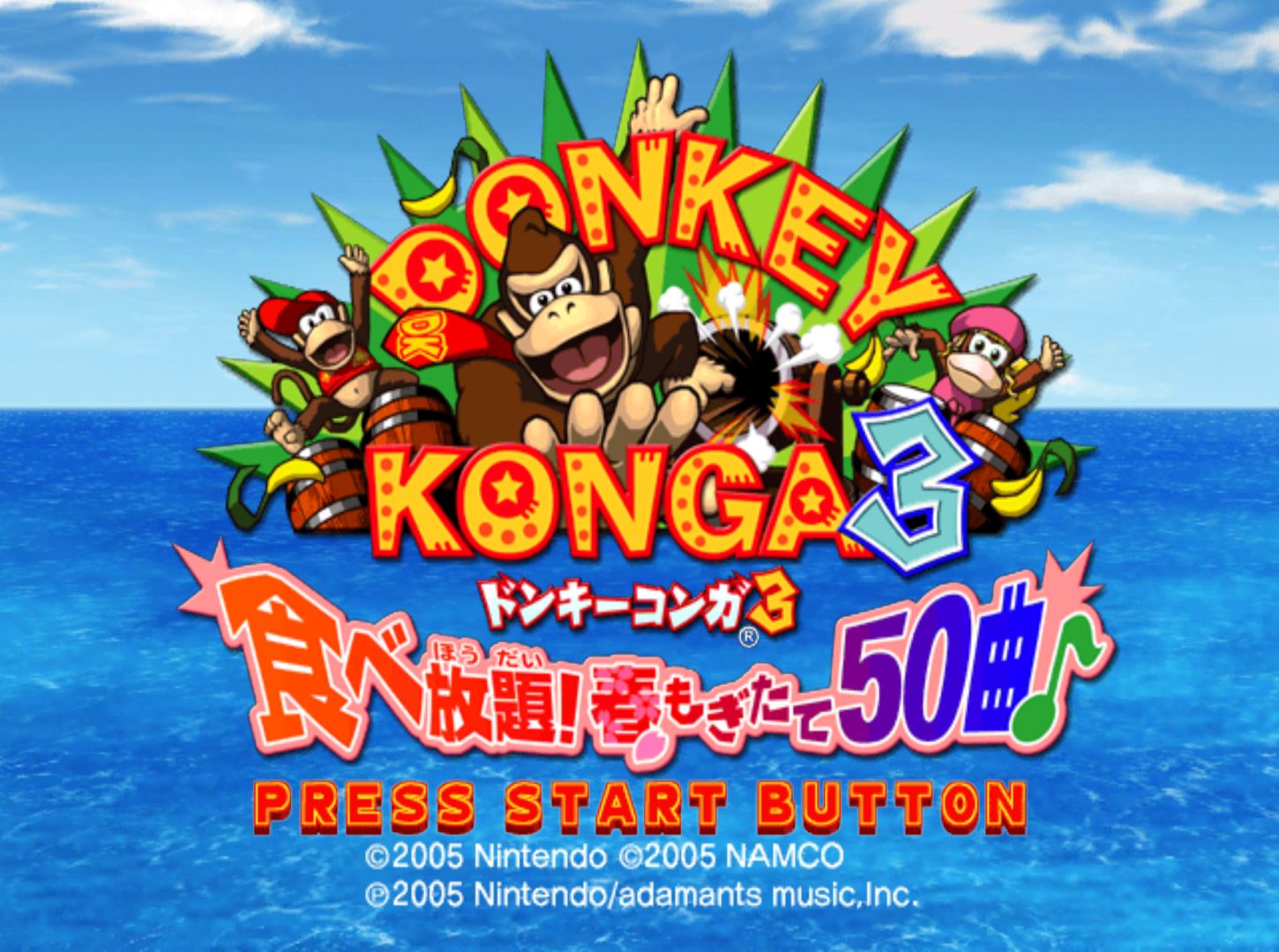 This has a similar selection of songs as the previous Japanese Donkey Konga games, with lots of J-Pop and anime themes, with some nursery rhymes and classical music (this time a lot more funky). There’s a selection of gaming music – including the funky Mona Pizza from WarioWare, a Star Fox theme and the Smash Bros. Melee opening and even a track from Namco’s Katamari Damacy – a shame they never released the game itself on GameCube.