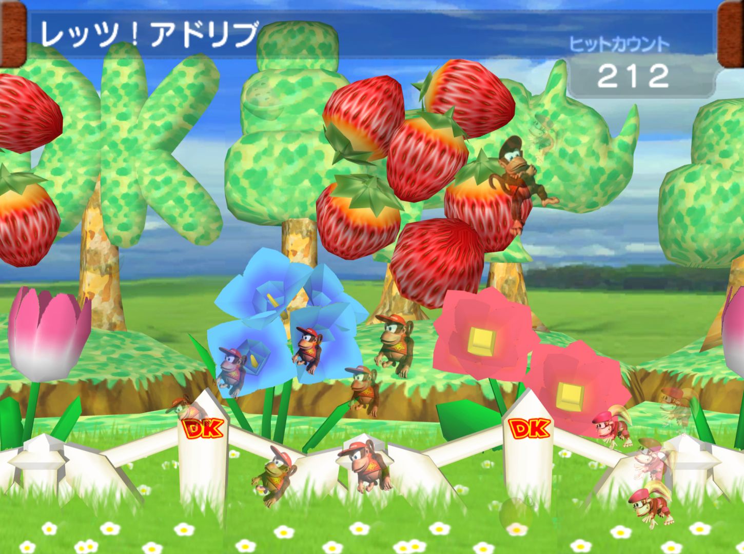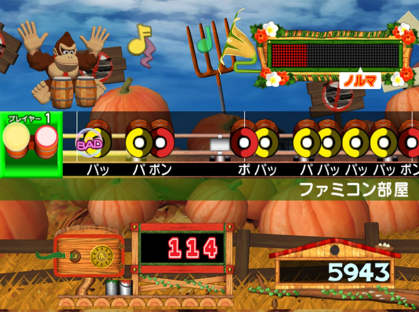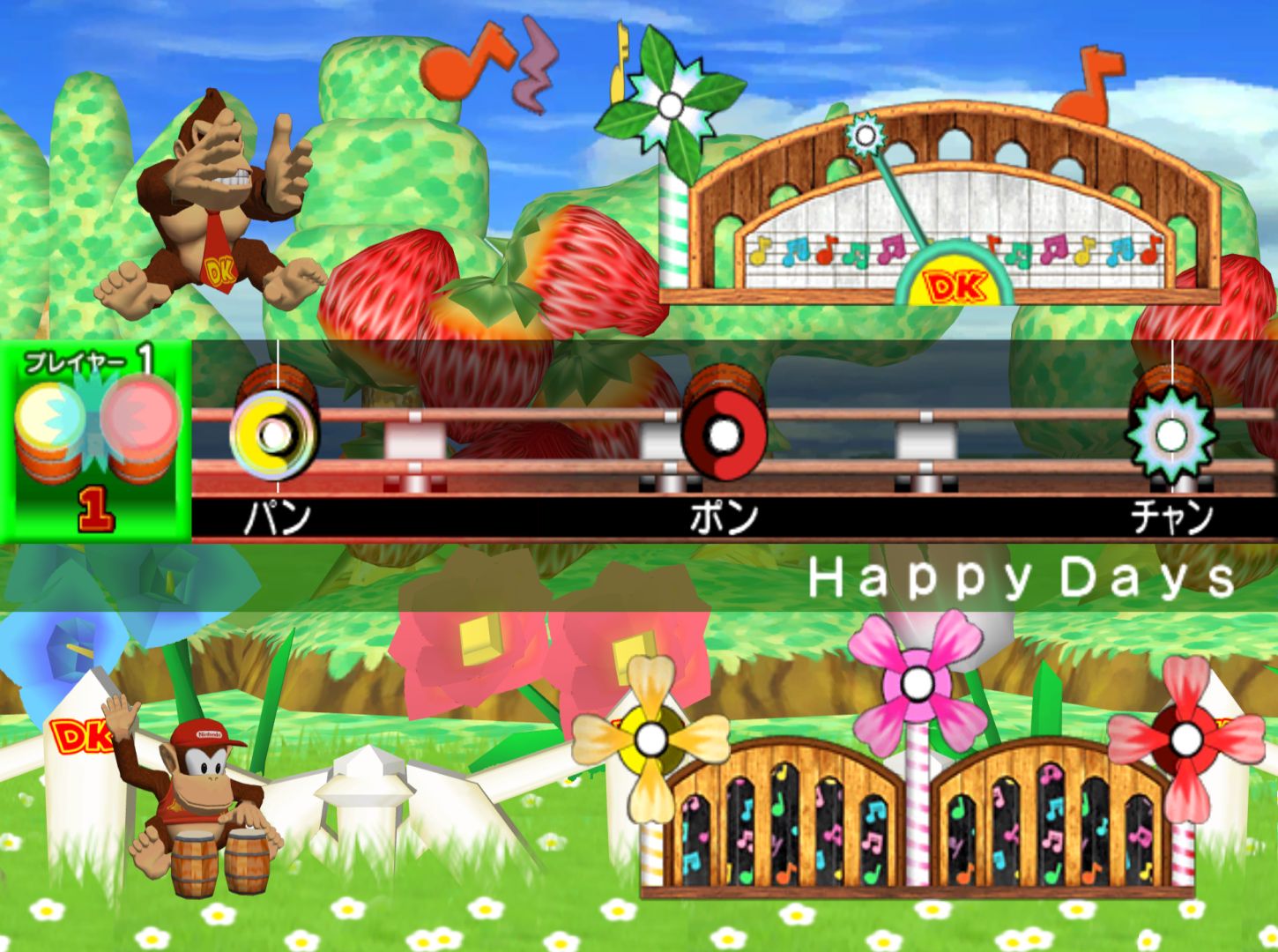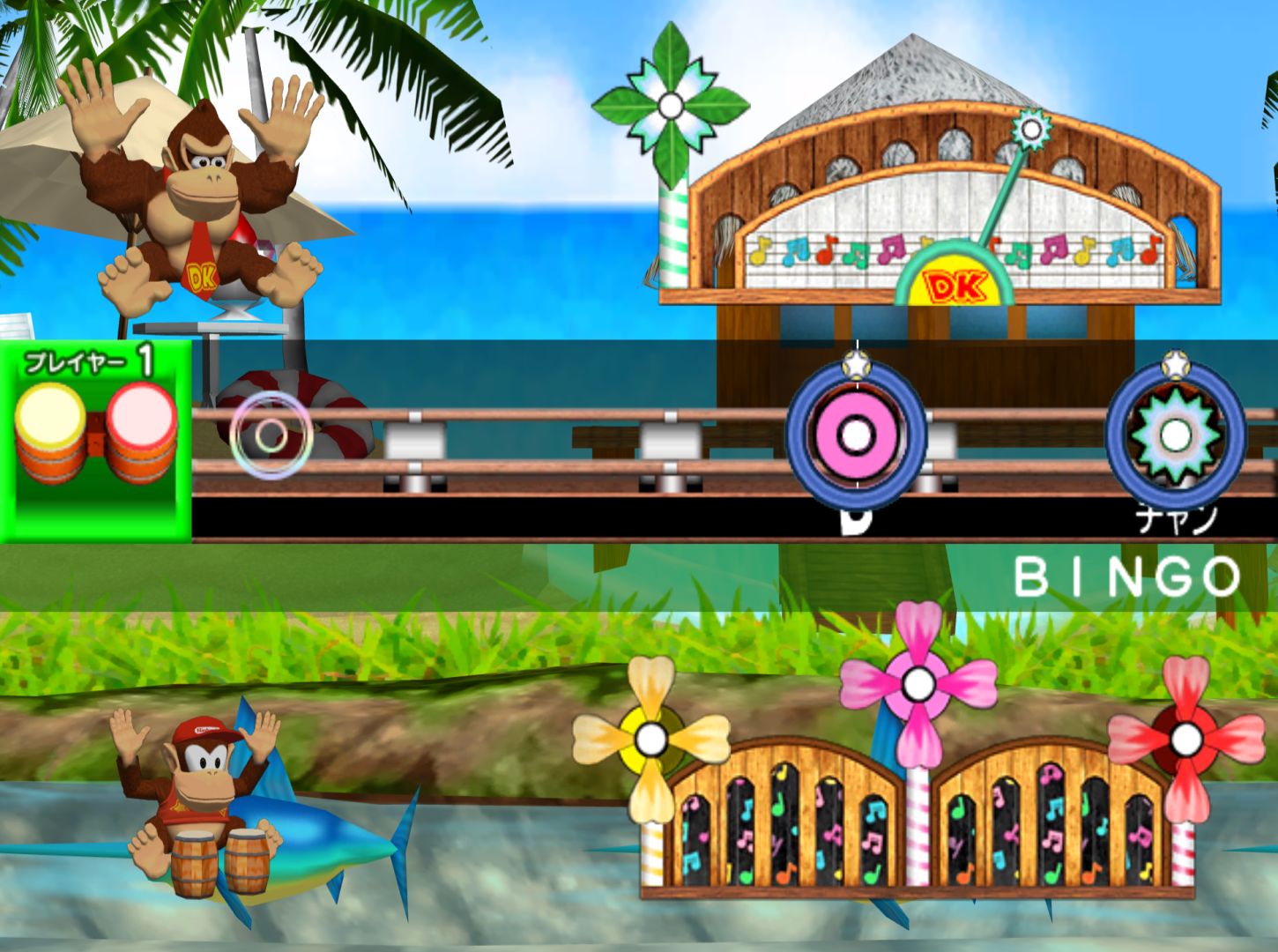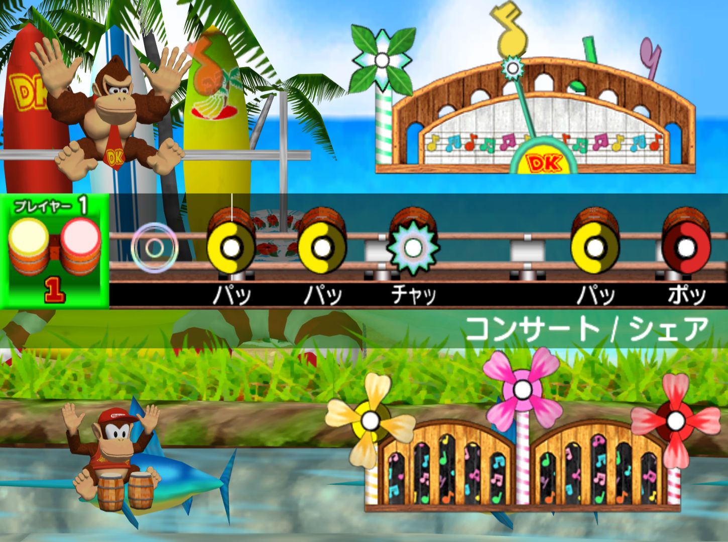 This has a similar selection of songs as the previous Japanese Donkey Konga games, with lots of J-Pop and anime themes, with some nursery rhymes and classical music (this time a lot more funky). There’s a selection of gaming music – including the funky Mona Pizza from WarioWare, a Star Fox theme and the Smash Bros. Melee opening and even a track from Namco’s Katamari Damacy – a shame they never released the game itself on GameCube.