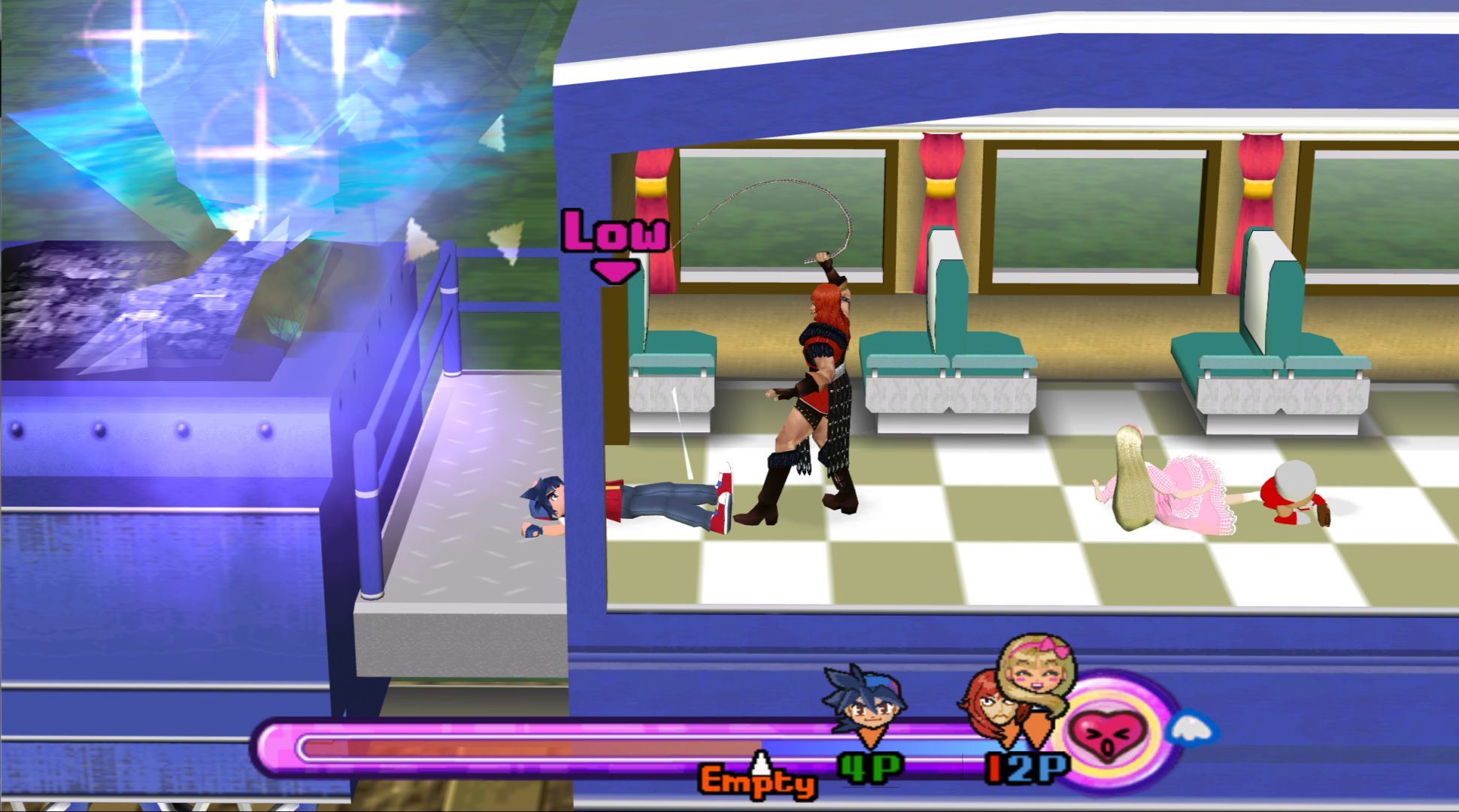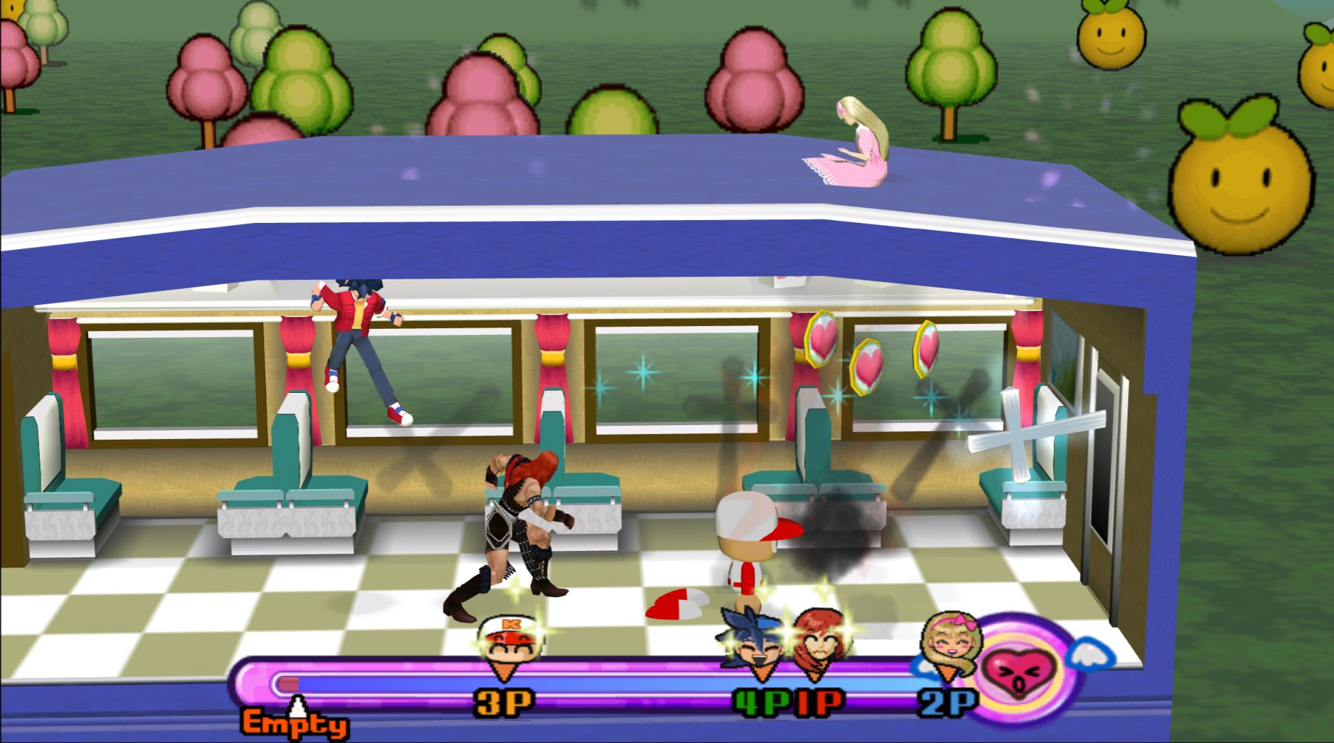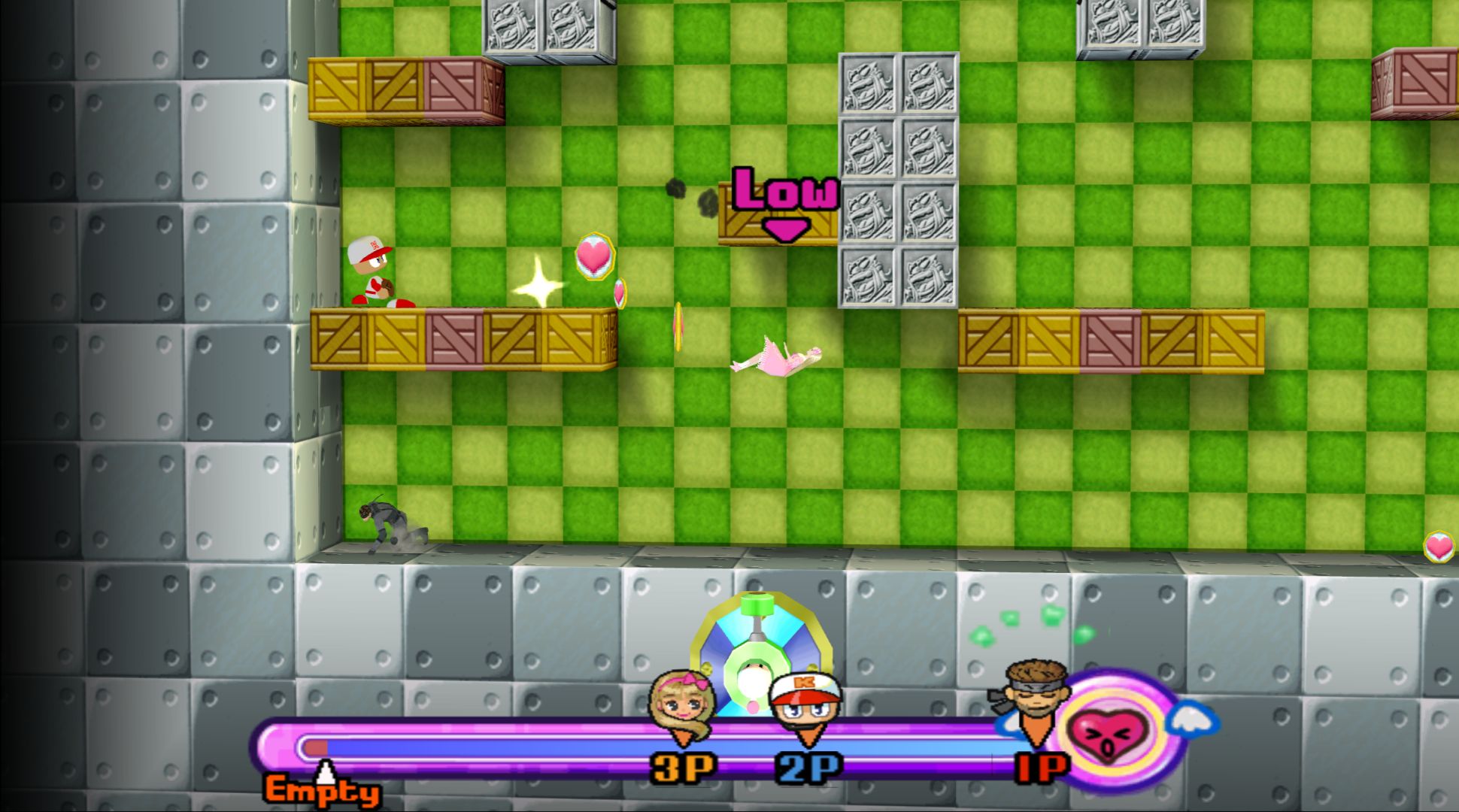 Like Smash, DreamMix didn’t want to have a health bar, but it also couldn’t just copy Smash Bros completely, so it came up with its own system. At the start of a fight, heart tokens get spewn everywhere and everyone scrambles to collect them. When someone takes damage, they lose some of their tokens, which can be collected again. Once someone has lost all their tokens, a large heart will float out of them. If the player manages to collect it back, they can continue fighting, but if another player gets it, they’re eliminated. Although they can still control a miniature version of themselves to mess up the remaining fighters.