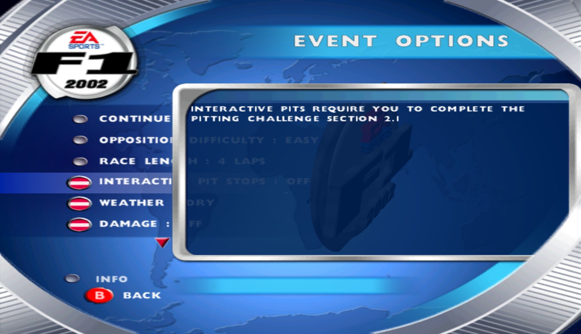 Progression is always a tricky thing to do in a racing game, you want to keep some stuff locked away to encourage playing more, but locking too much away can also be an issue. This is something F1 2002 is very guilty of – you can’t even do a grand prix from the get-go. To unlock the various components of the game, you need to complete tutorial challenges. Completing the basic ones unlocks the grand prix options, but loads of features are still locked away.