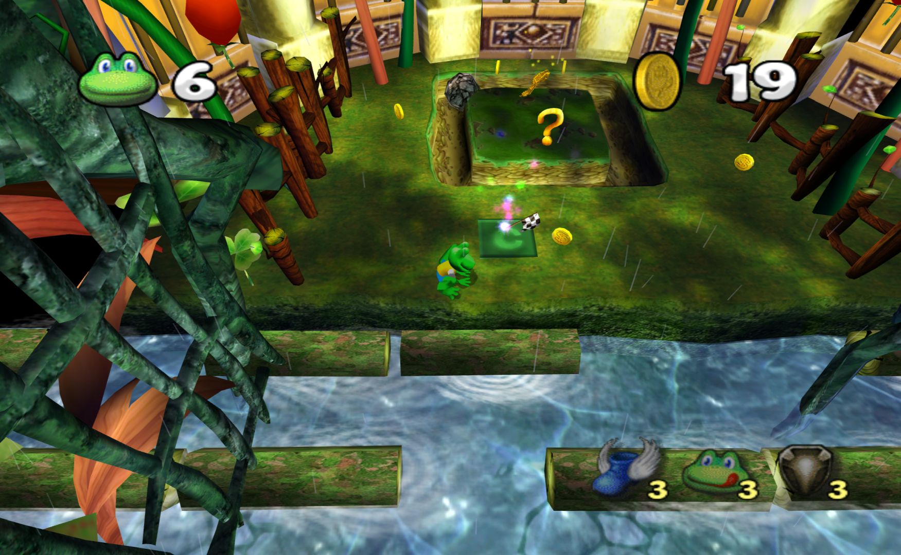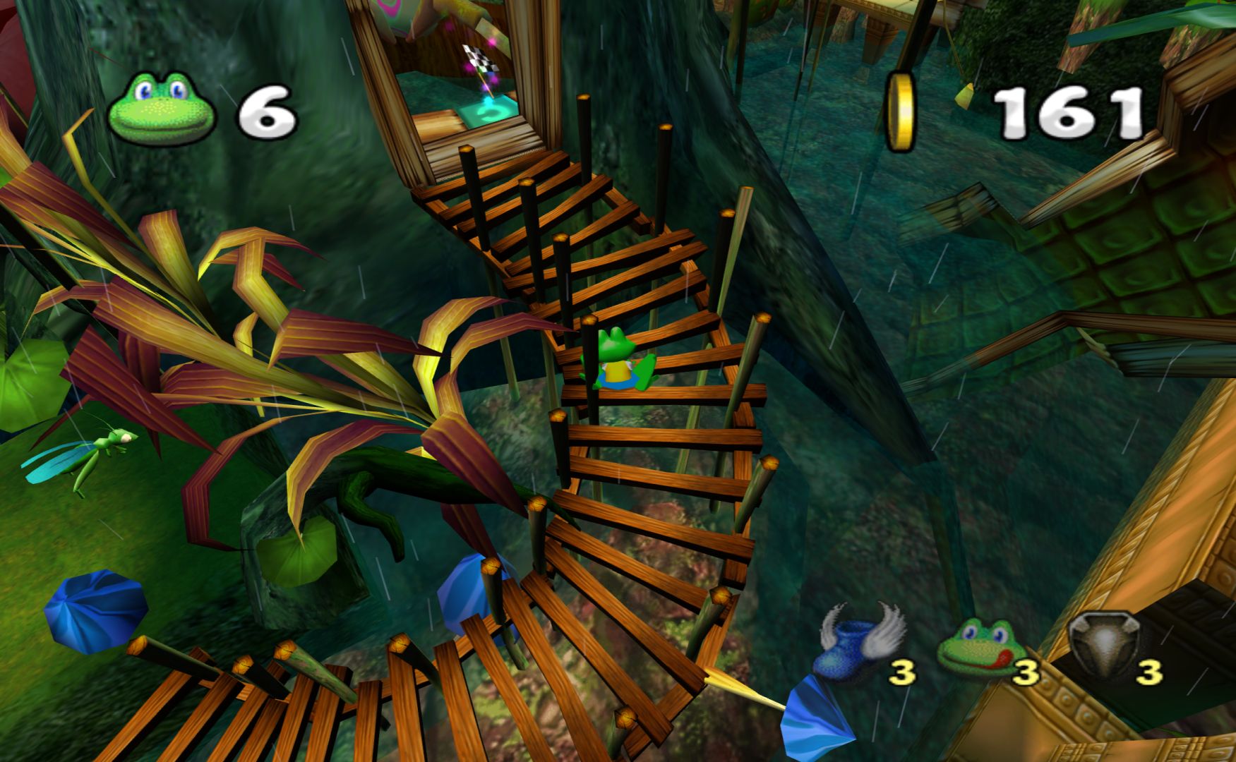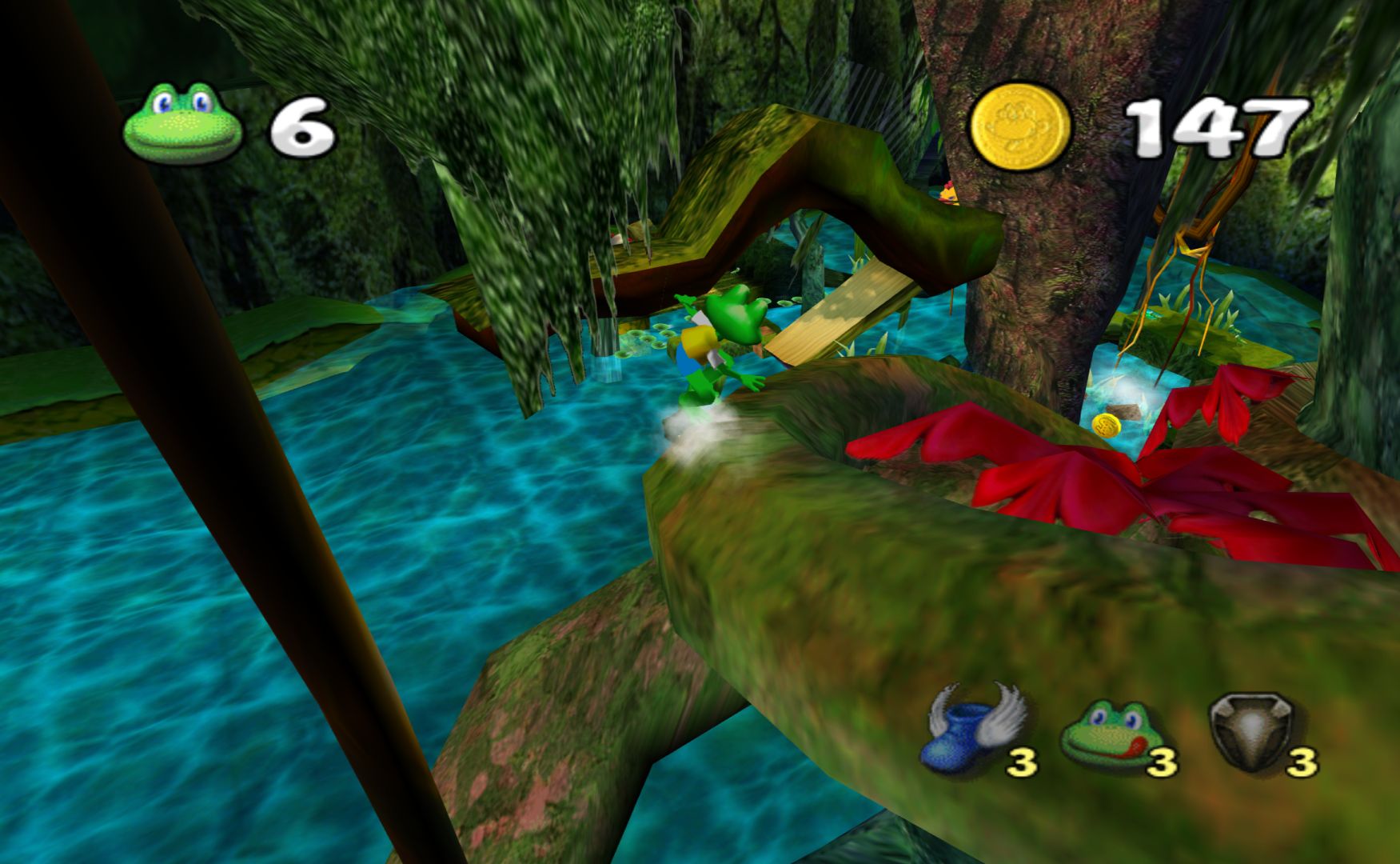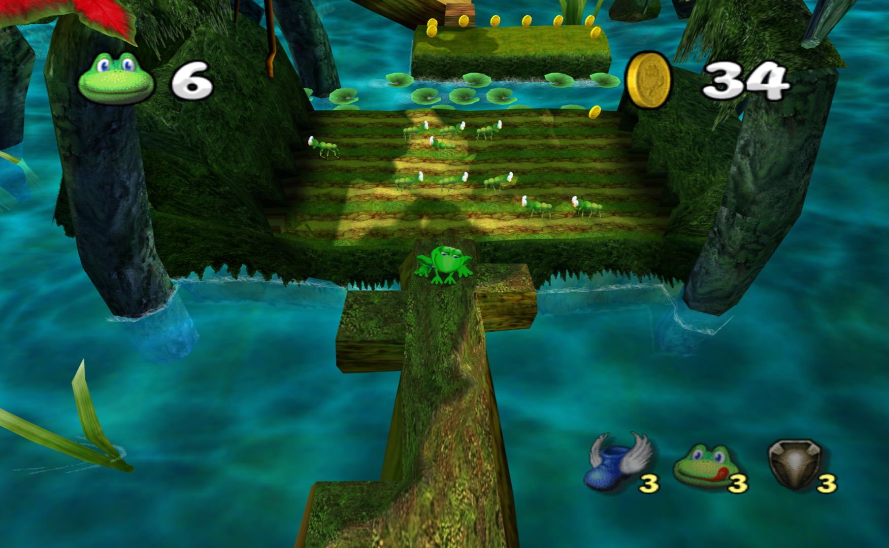 But then the gameplay is just the exact same thing as the PS1 Frogger games, with no new ideas or concepts thrown in, making it less of an improvement than Zapper was. The biggest idea of “new and interesting” the game has is watching Frogger slide down a tree branch to the next section of the generic world. There are also items that you can buy to help you, but these are never used for puzzles and you never need to use a single one to get through the game.