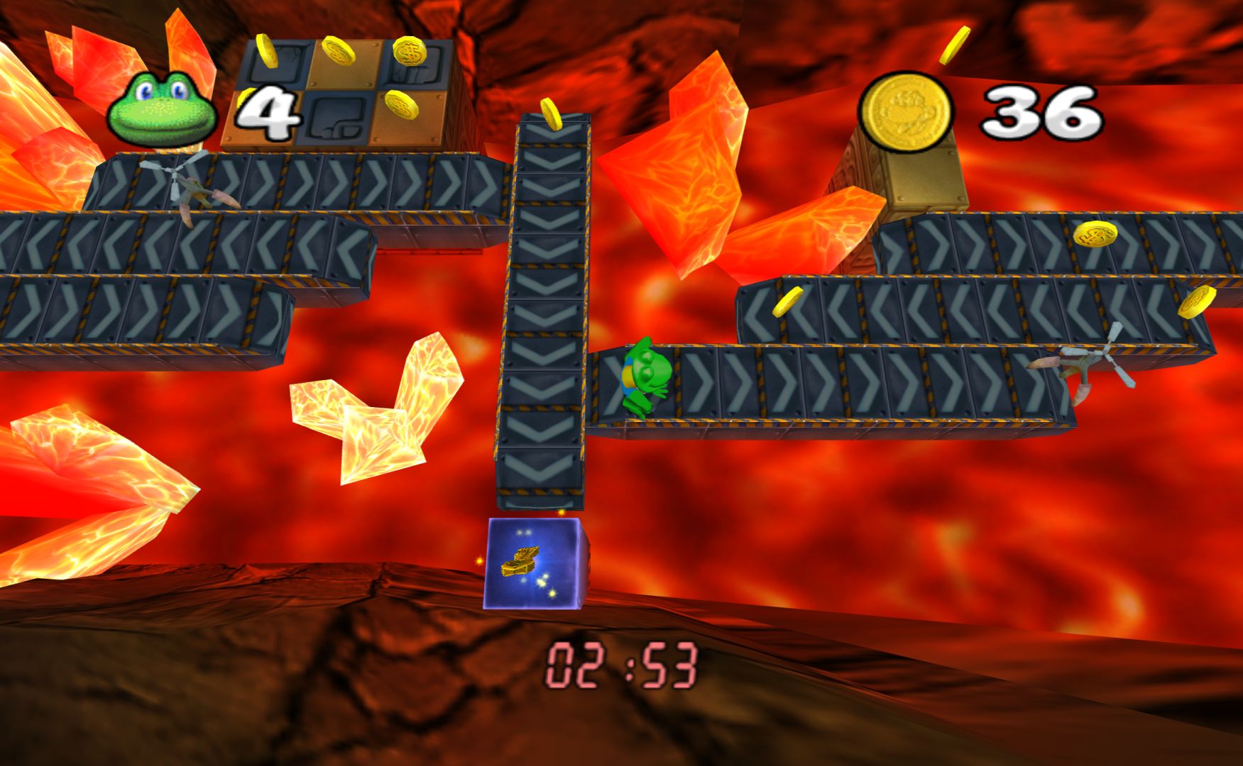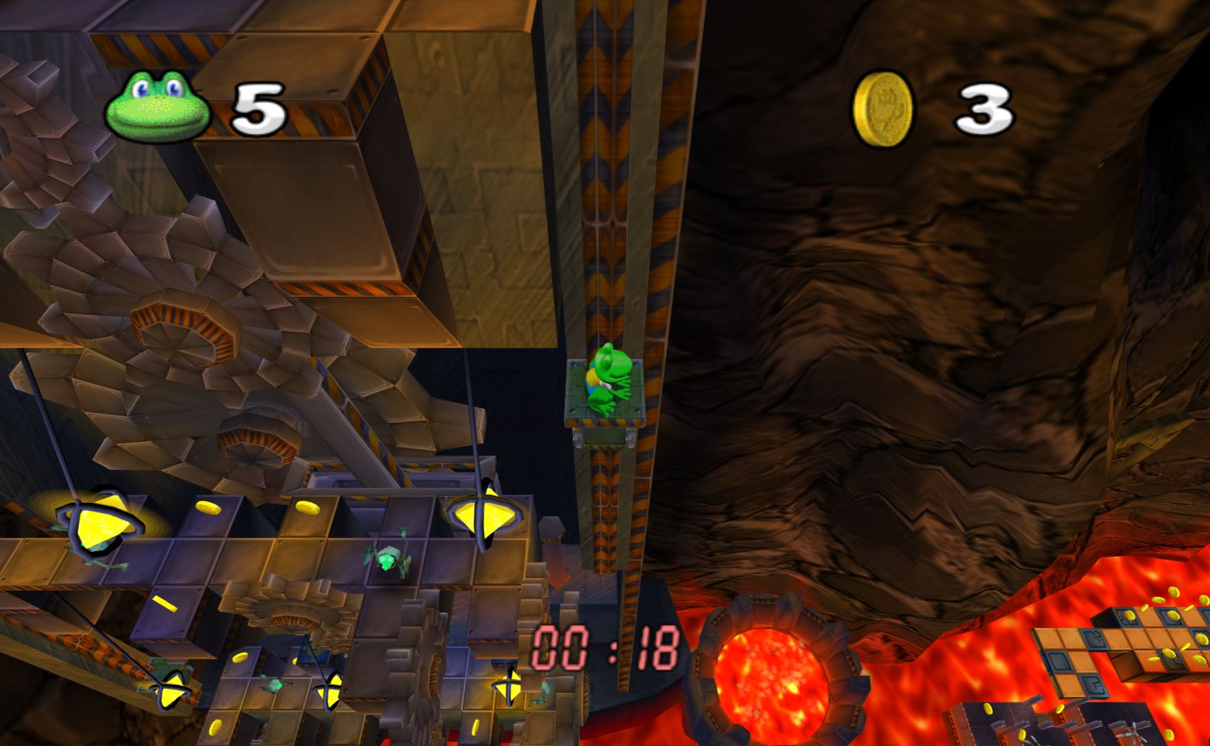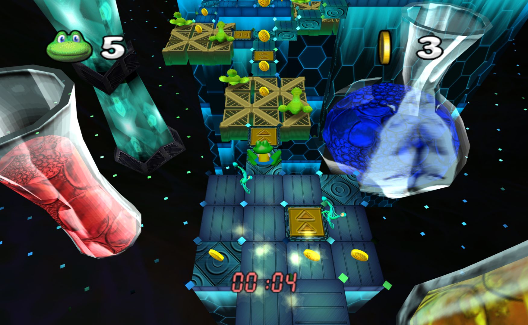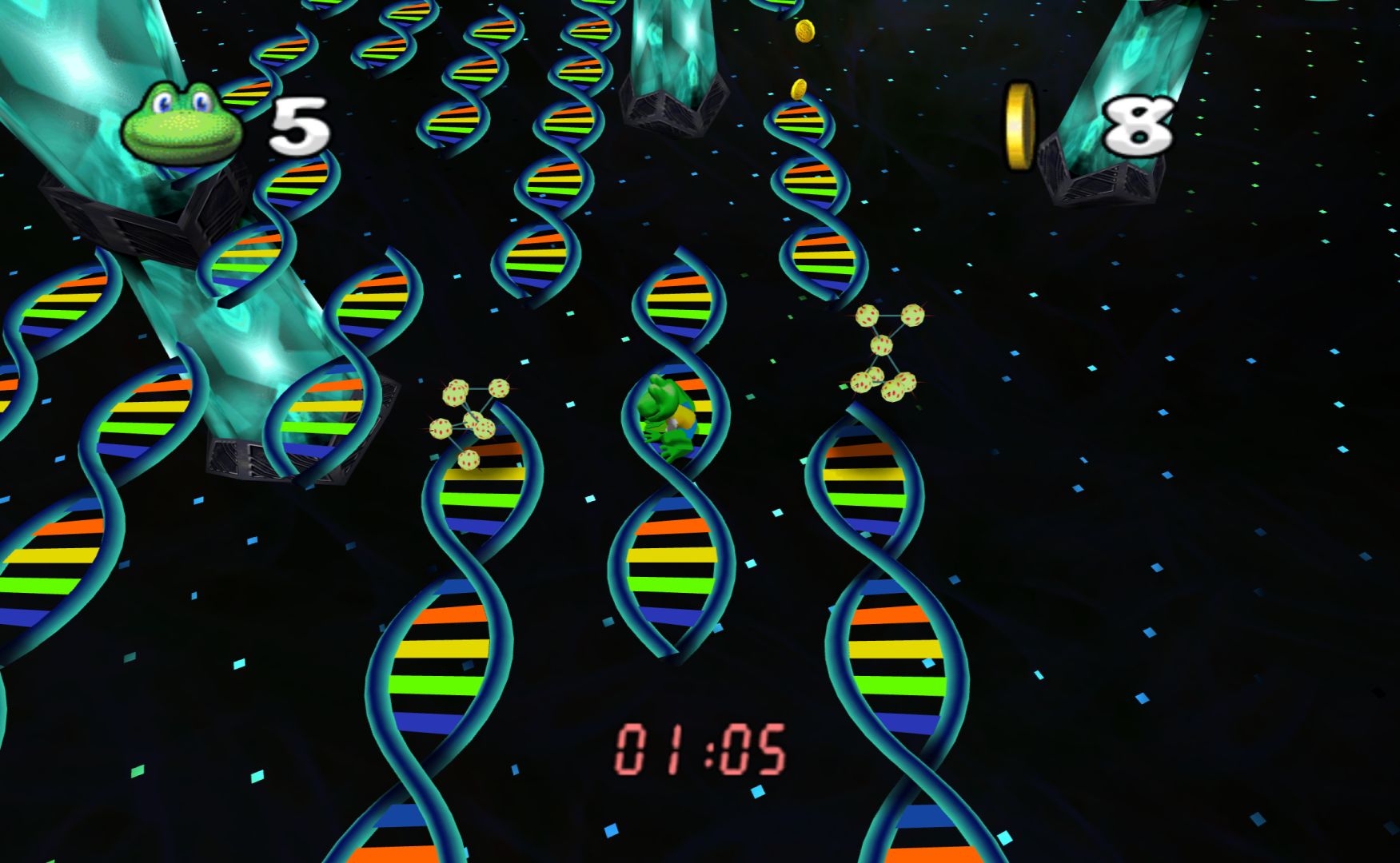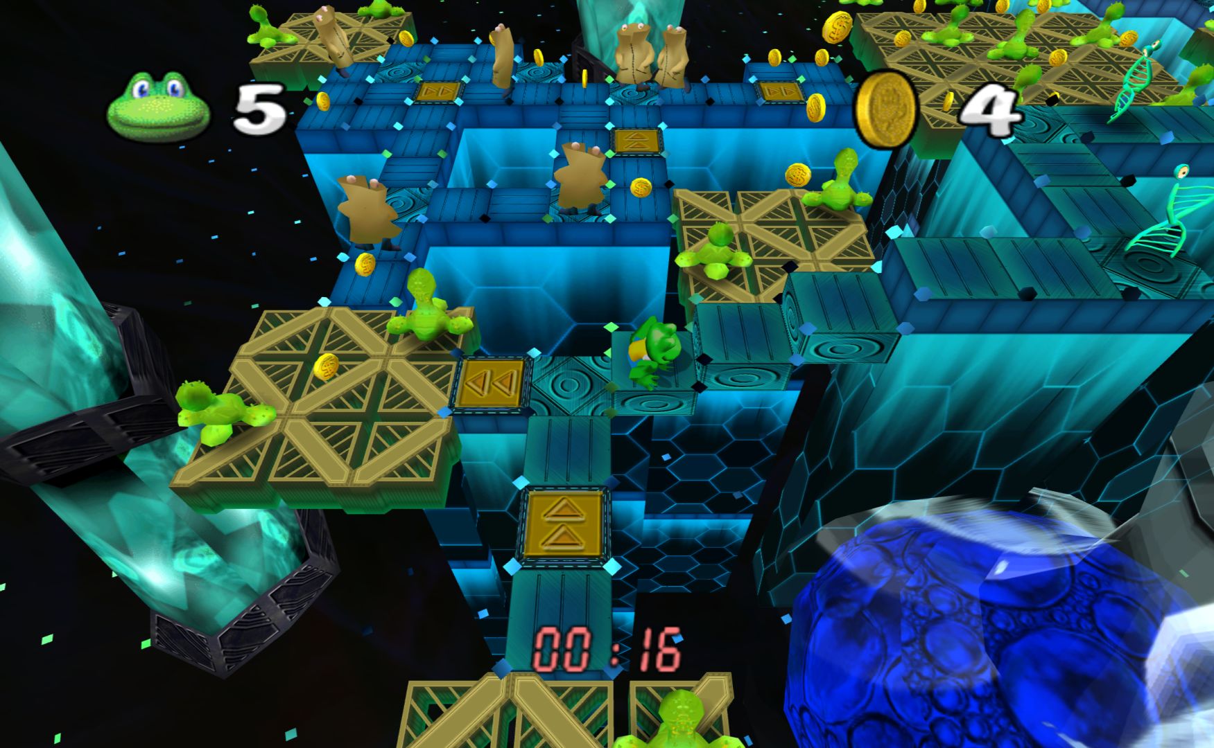Konami ditched the developer of the PS1 Frogger games (Blitz Games, who made Zapper: One Wicked Cricket) in order to develop something brand new in-house. As a result, I was expecting them to have their own great ideas for the franchise. Indeed, Frogger Beyond opens up with a rap followed by some really well made cut-scenes (with voice acting), with the council chamber of the frogs having an otherworldly sci-fi vibe to them. It actually looks quite spectacular.