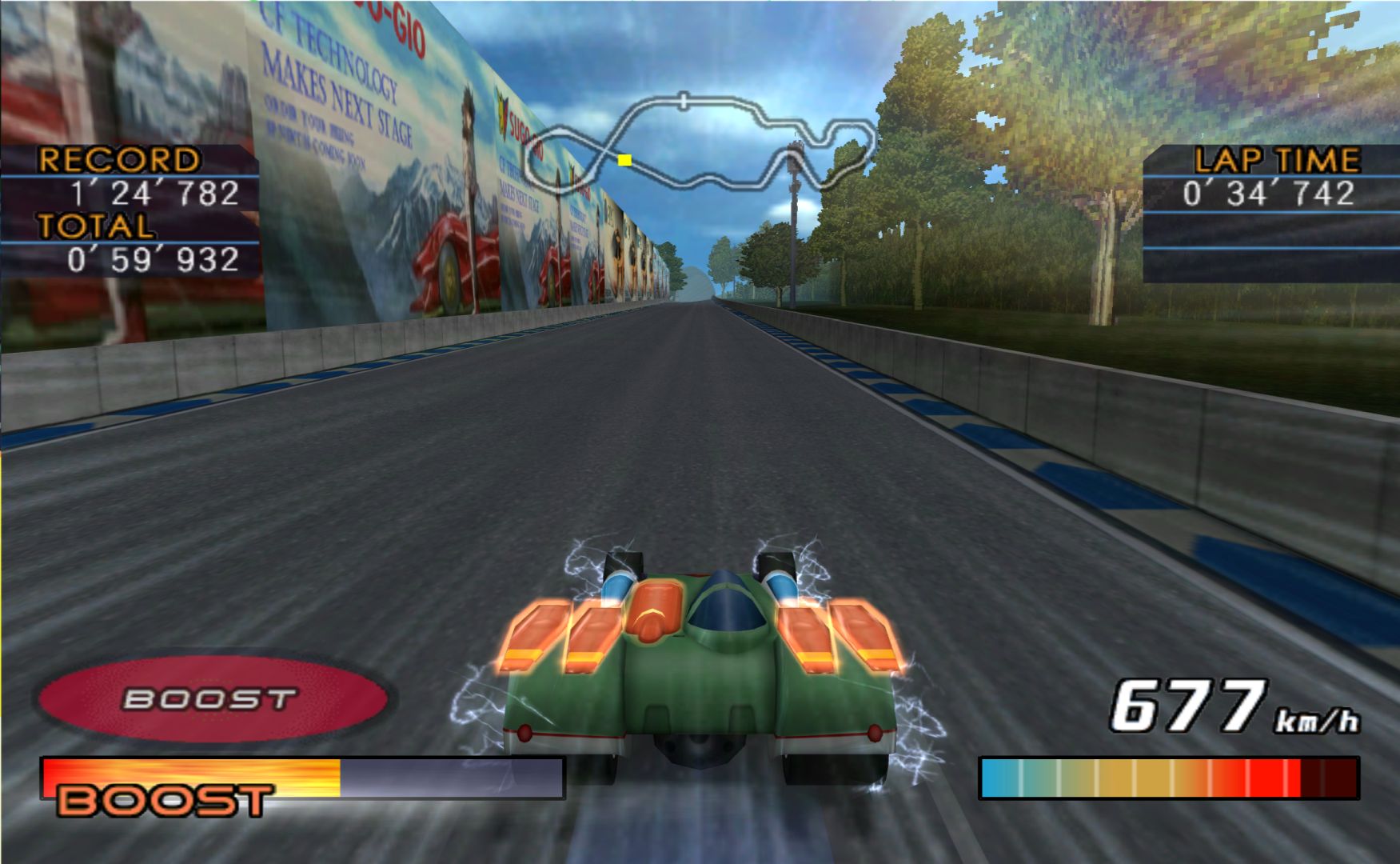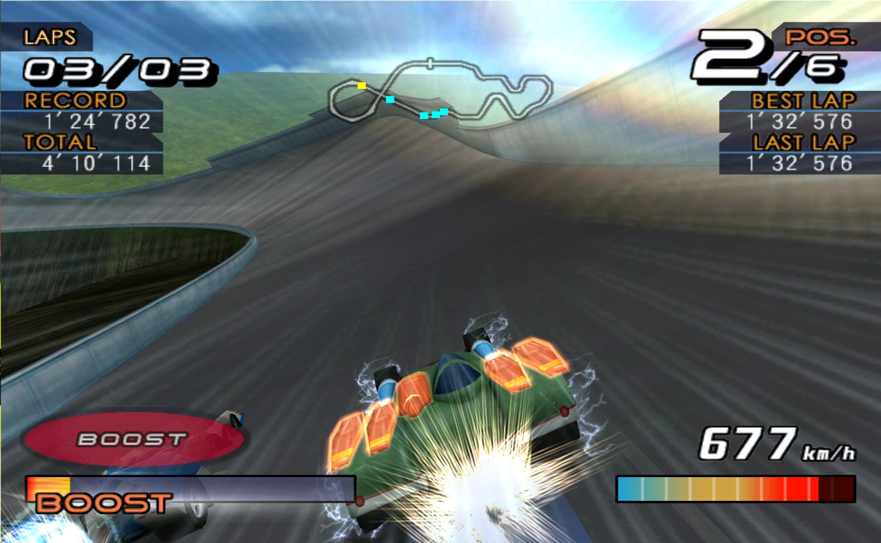 The biggest reason for this is that the game is actually fast, and the handling is also easy enough to cope with manoeuvring at speeds. It doesn’t feel quite as fast as the speedometer claims, but still fast enough. The cars also have different abilities. Aero cars can transformed into a more streamlined straight for a faster boost.