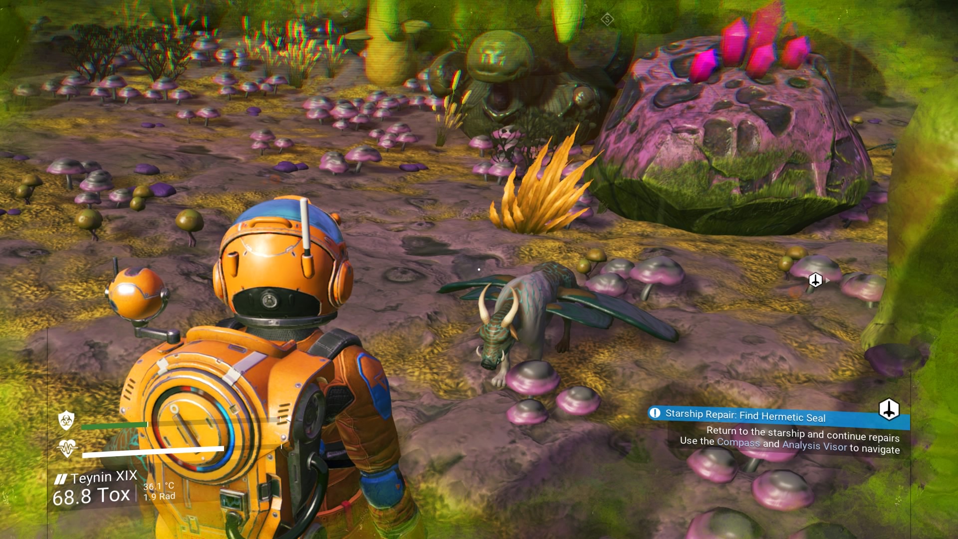 There’s a main story that utilises the procedurally generated objects, and is cleverly done so the game is never missing anything vital in your starting area (which is different in every area). It’s possible to encounter places discovered by other players, but even now it’s a rarity unless you visit featured locations and bases – of which you can build your own vast structures.