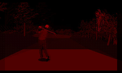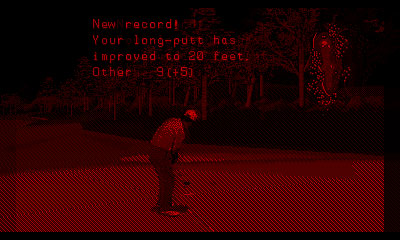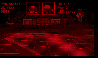 If you were wondering as to why Red Alarm went for a wireframe look instead of having some simple textures, then Golf for the Virtual Boy shows how the system is not suited for that kind of thing. While having a polygonal course on a “handheld” is somewhat impressive, it was a poor choice for this as it’s often difficult to work out what you’re looking at, and the stereoscopic 3D doesn’t help at all. The worst part of the graphics are the red greens (don’t step on them), with a garish texture. The grid for helping to aim often covers the hole when putting as well.