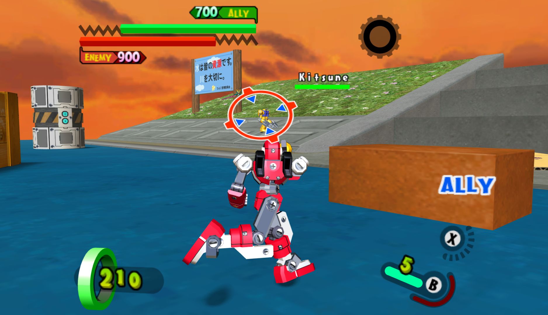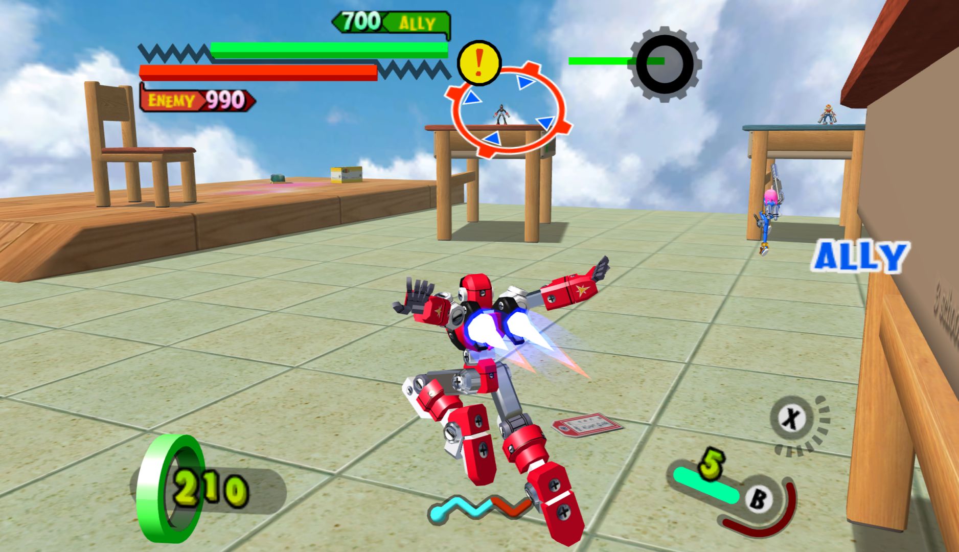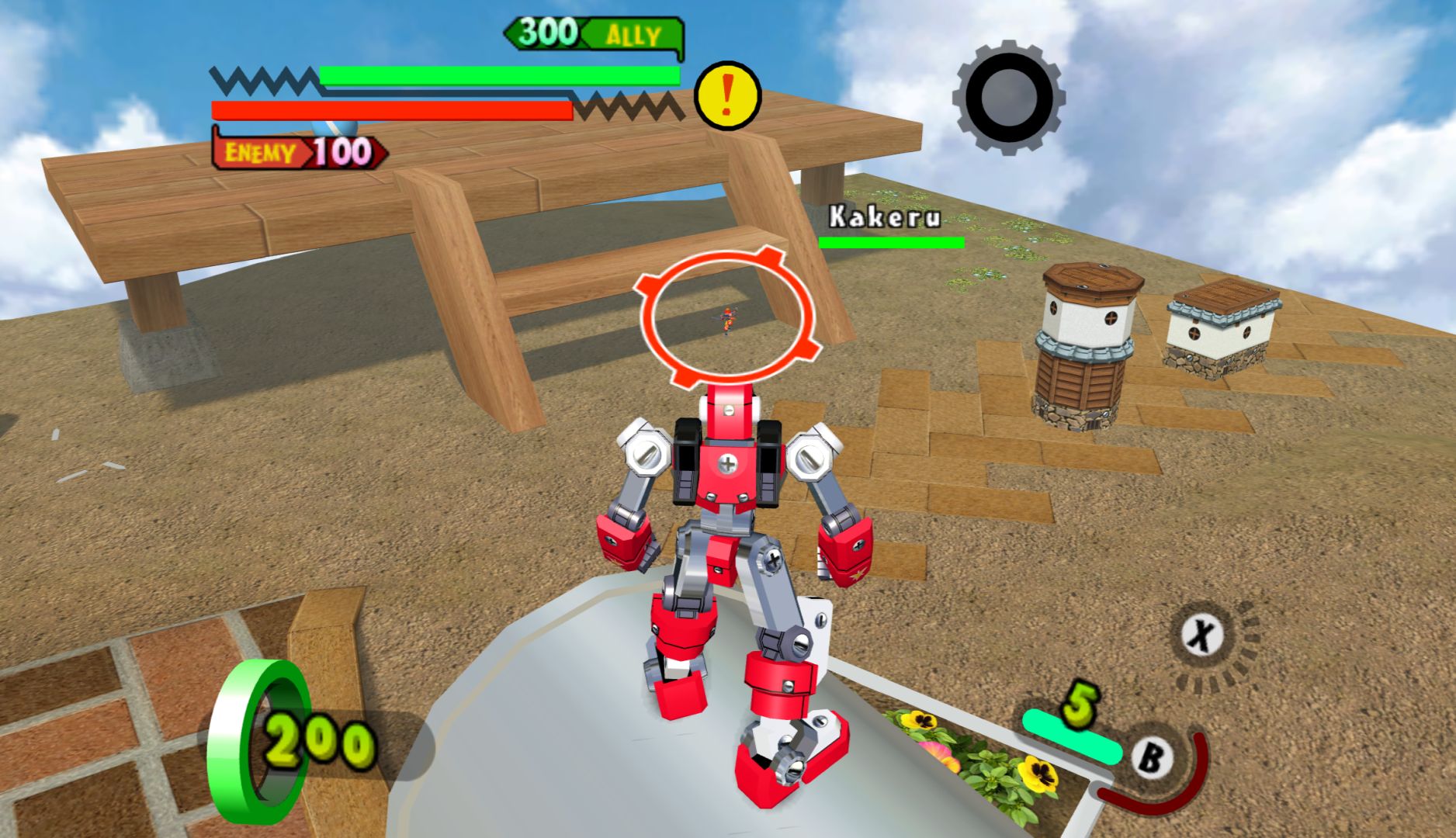 The game consists of lots of battles that take place in giant versions of everyday locations, mainly parks and rooms and take place in a cut out square bit of land, just like Custom Robo. However, the illusion really doesn’t work at all in this, possibly because of the third person camera, and the arenas just look unfinished, or like the draw distance is nom-existent.