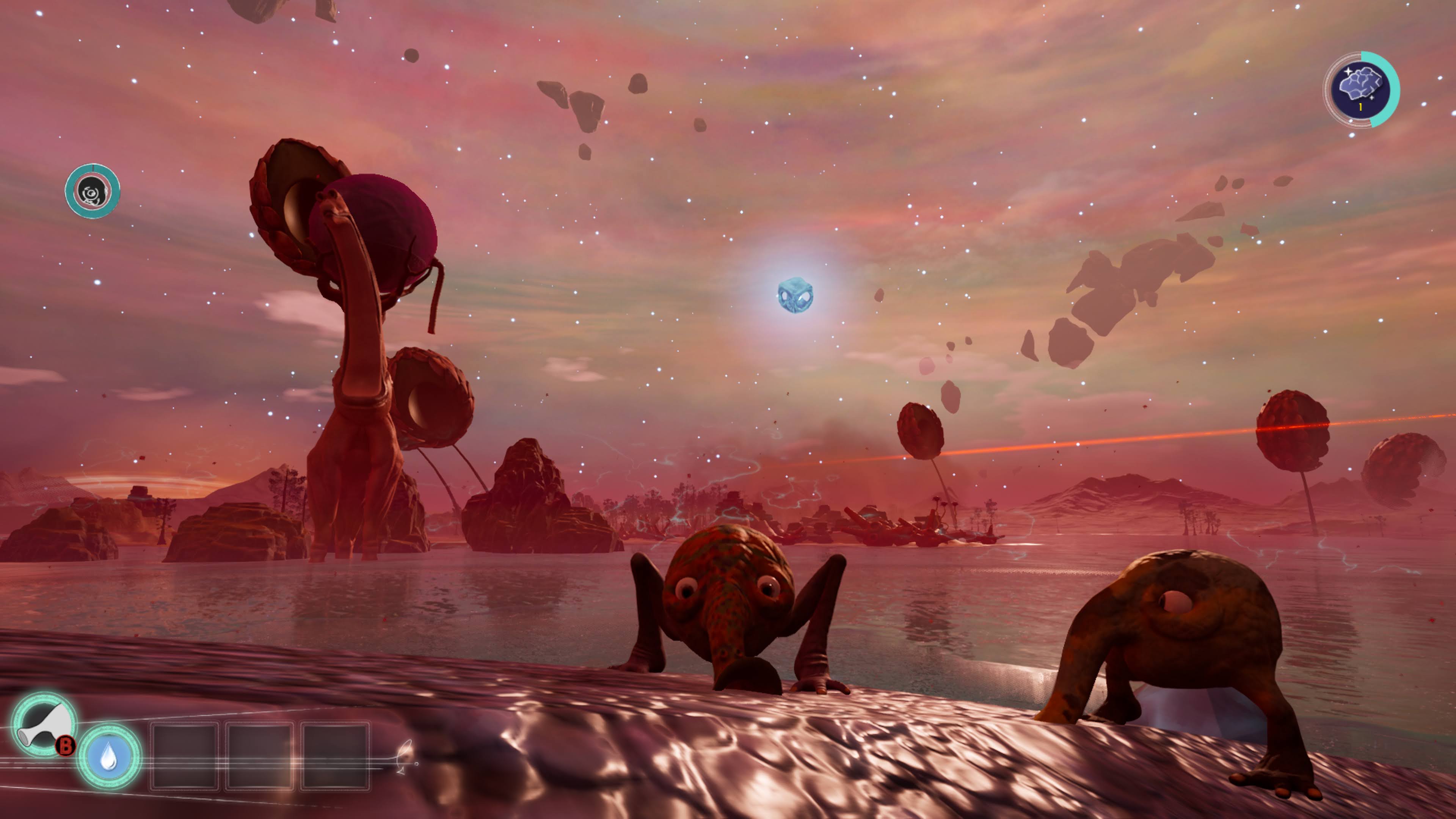 Now, what is a Trebhum? A Trebhum is Q*Bert looking creature. Using it’s nose, it can suck up and store items (in a very limited inventory), which can then be eaten or launched to hit something. Eating is extremely important, as some objects – usually obtained from plants and animals – allow for Trebhum to mutate, gaining new abilities. The first creature you’re likely to encounter will give you the ability to jump higher.