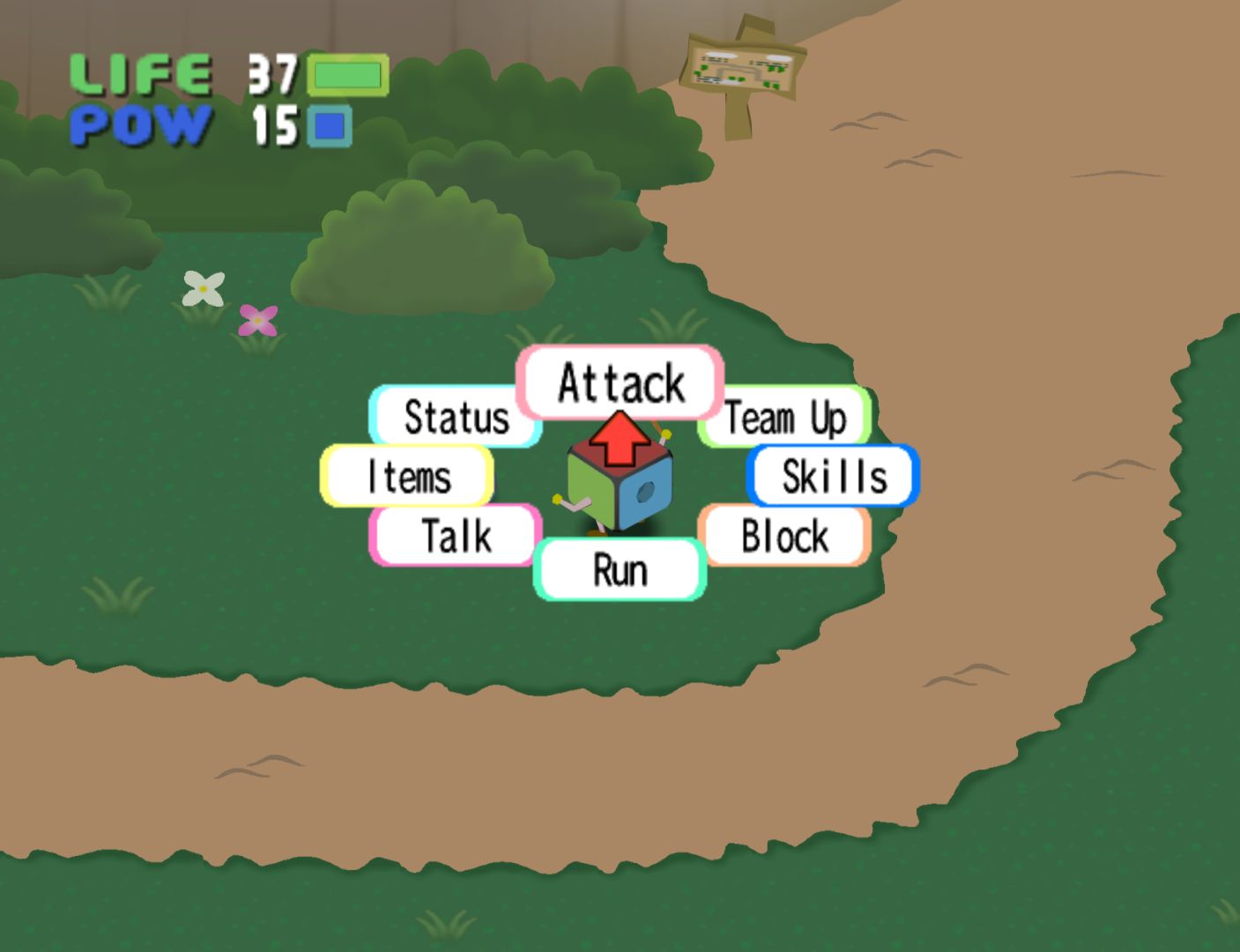 You wander around some lovely looking areas, talking to people around town, buying equipment and so on. Out in the adventuring fields, the gameplay is turn-based but with real time elements. When you bump into an enemy, you’ll start battling there and then (and not get whisked to a different screen) and can choose your attacks, items or defence. You’re locked in place (unless select run, which isn’t always successful) but other enemies are still walking around – if they happen to get close, they’ll join in on the battle as well.