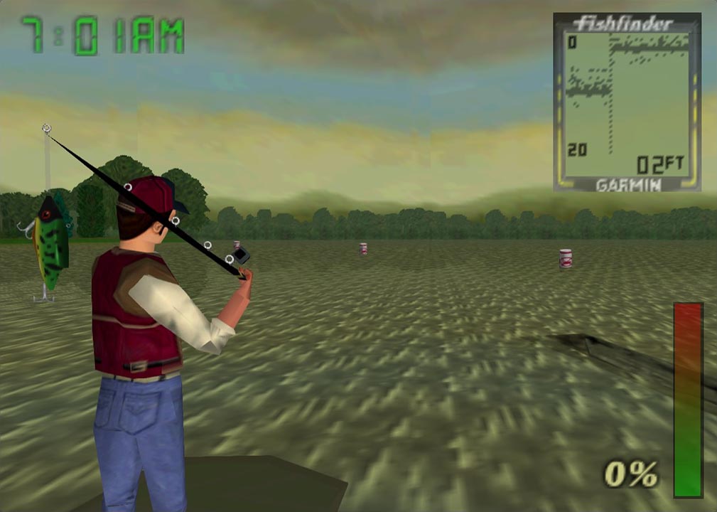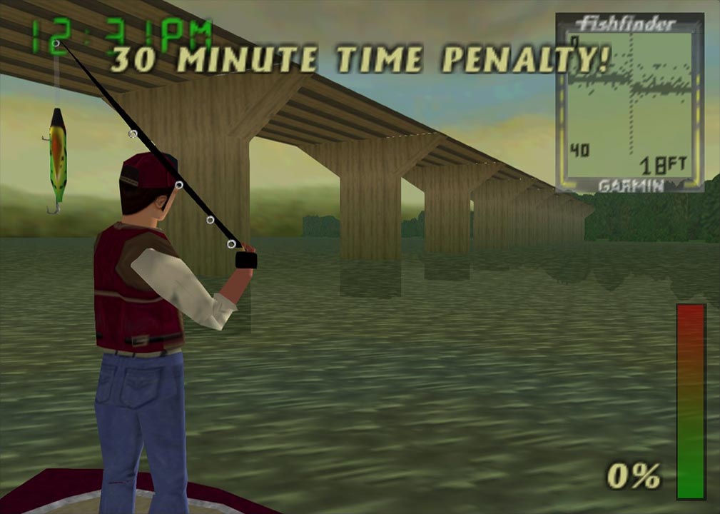 While driving around the lakes in your boat, a Garmin Fishfinder (some kind of sonar device) will help you detect fish. Where the bass are will depend on the year and weather, sometimes preferring shallow waters sometimes hiding out in the deep (the instructions for each tournament will give you an idea), although sometimes you can still drive* around for a very long time before finding something. When you do get some fish markers on your sonar, it’s time to stop and fish.