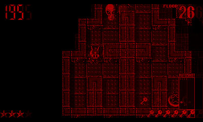 The game plays like a twin stick shooter, with the left D-pad moving and the right D-pad shooting in four directions. It’s very smooth and plays really nicely. Your aim is to make your way through mazes, with each world consisting of multiple floors. There’s a very strict time limit so you’ll need to complete all floors of each world quickly. You also have no health in the game, instead, getting hit will take away precious time.