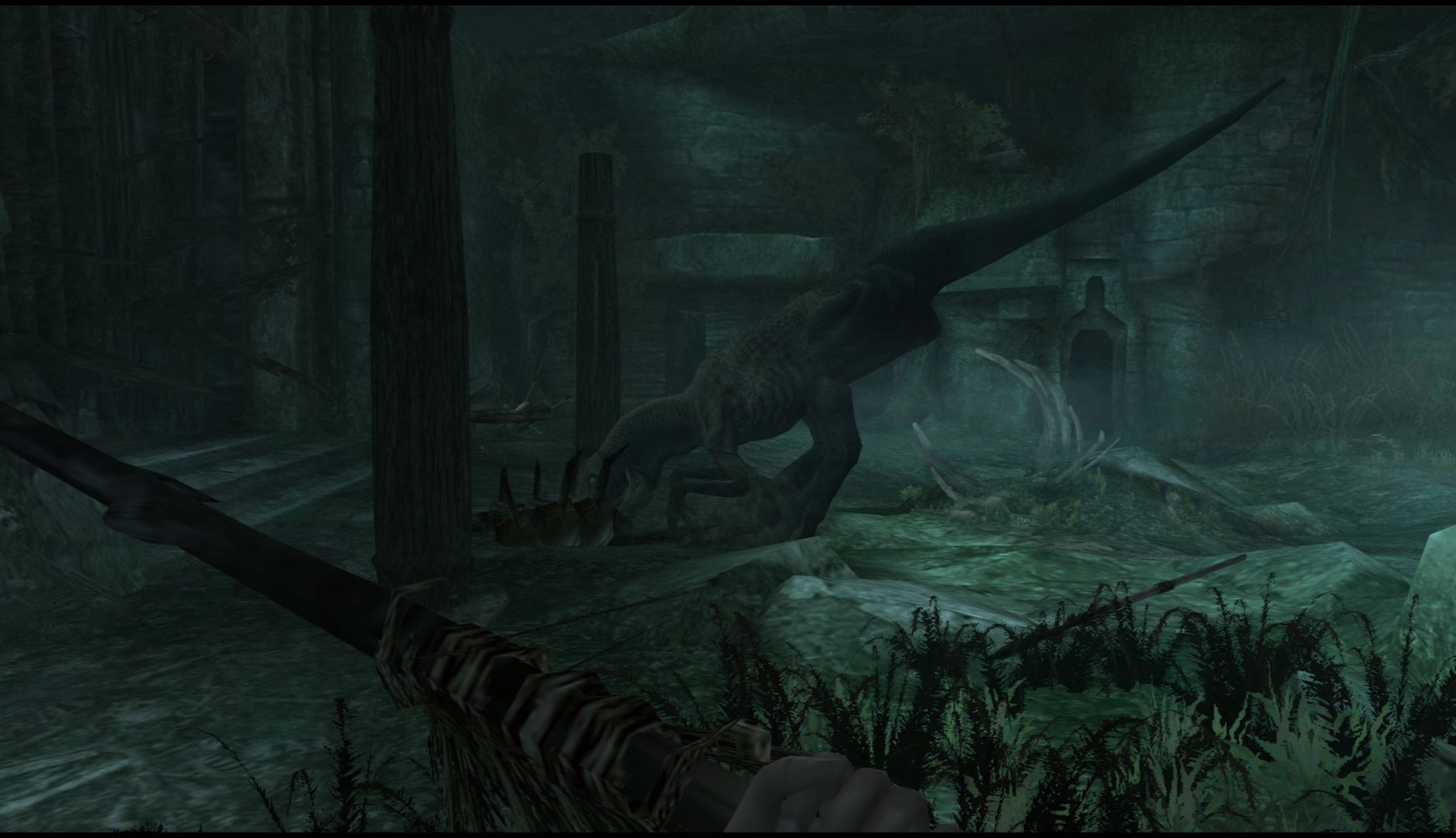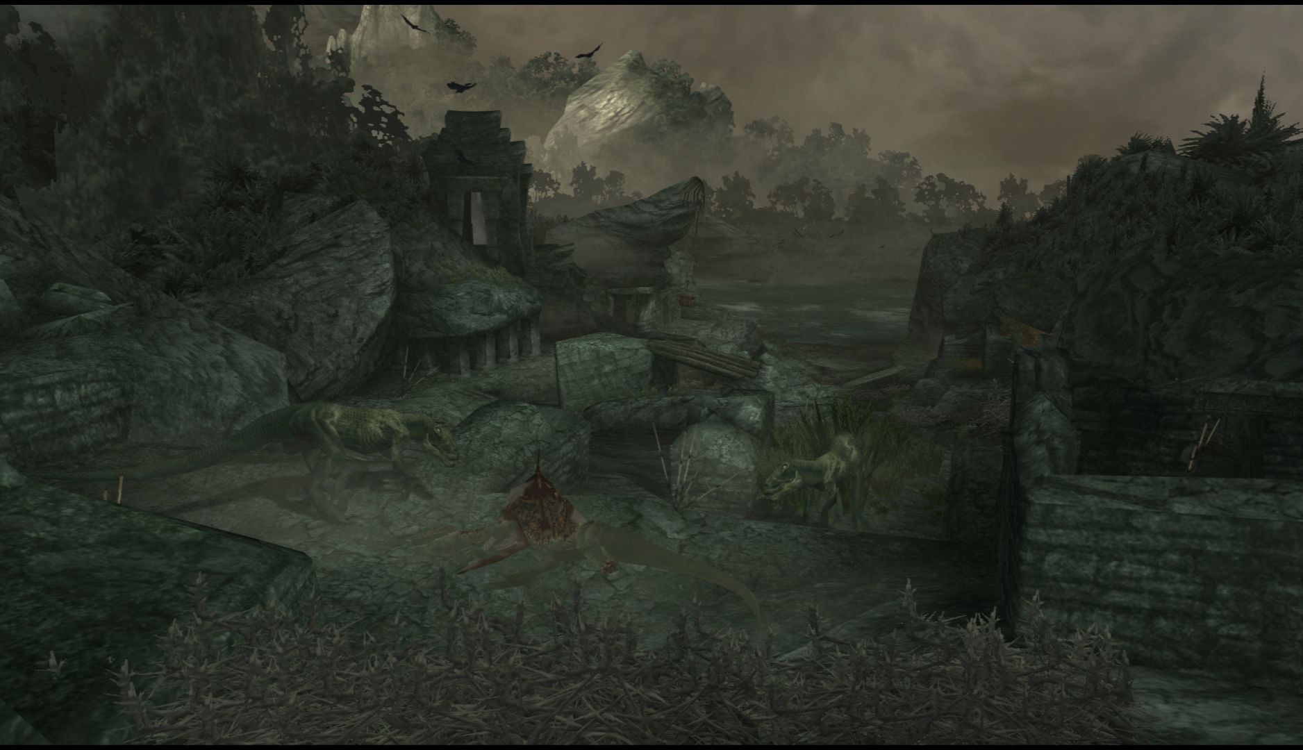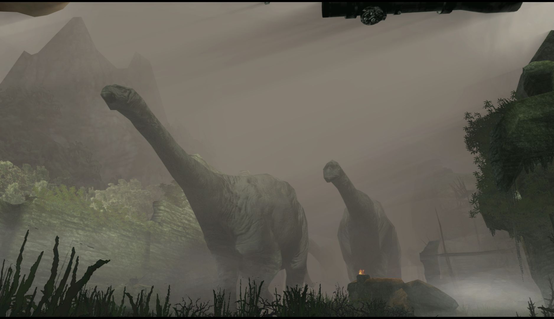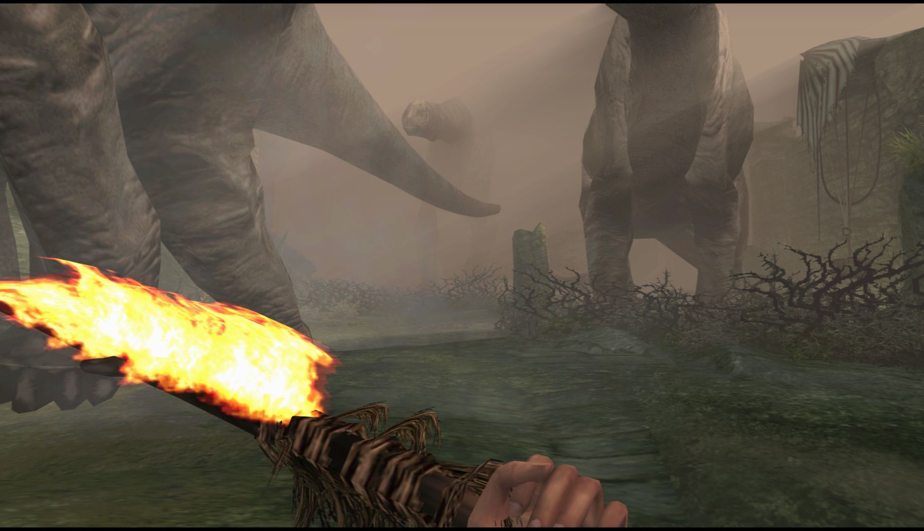 Ammo is quite scarce but there are always spears, bones or sticks for you to use to take care of the many large creatures you’ll encounter. You’ll have to make use of the environment to hide from creatures and work your way around them, waiting for the right moment to strike. When you do find guns, you can only have one at a time so you’ll have to account for what kind of creatures you’ll likely encounter in the current section. It all ends up feeling surprisingly strategic.