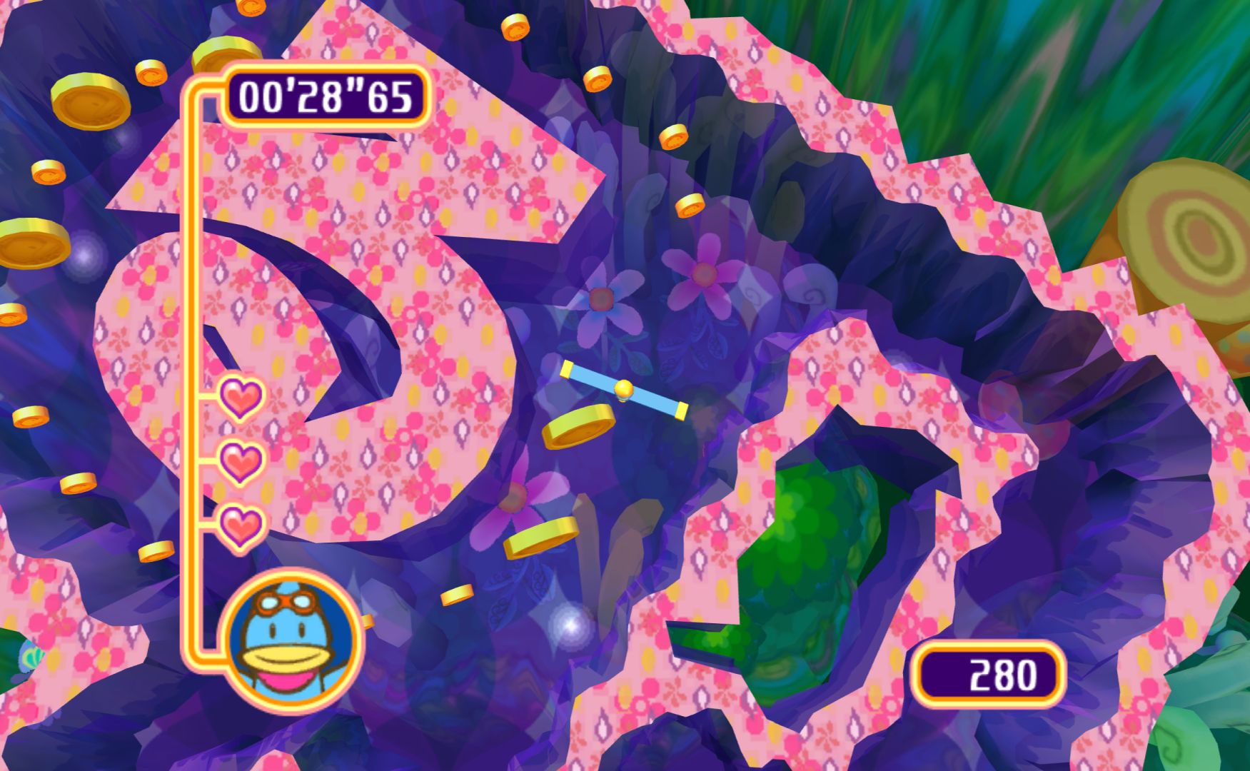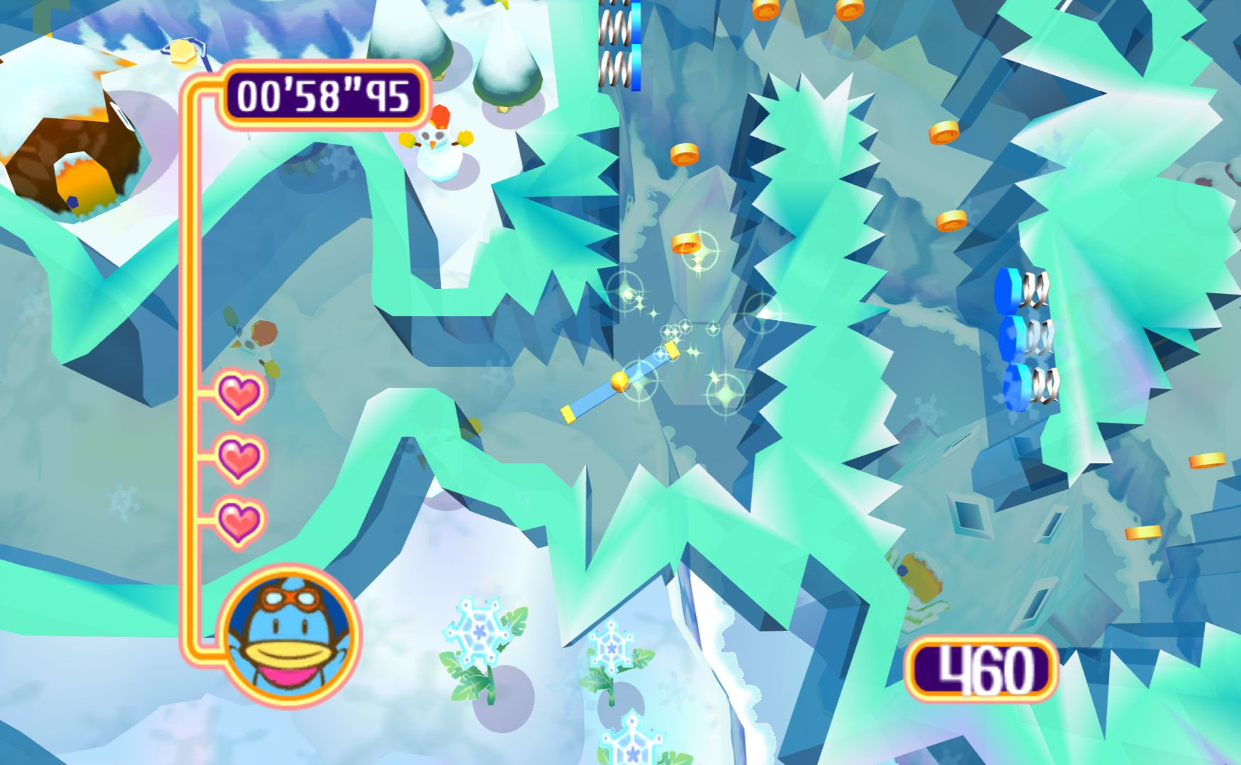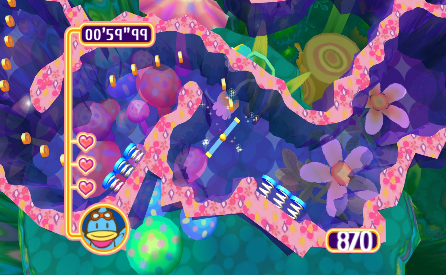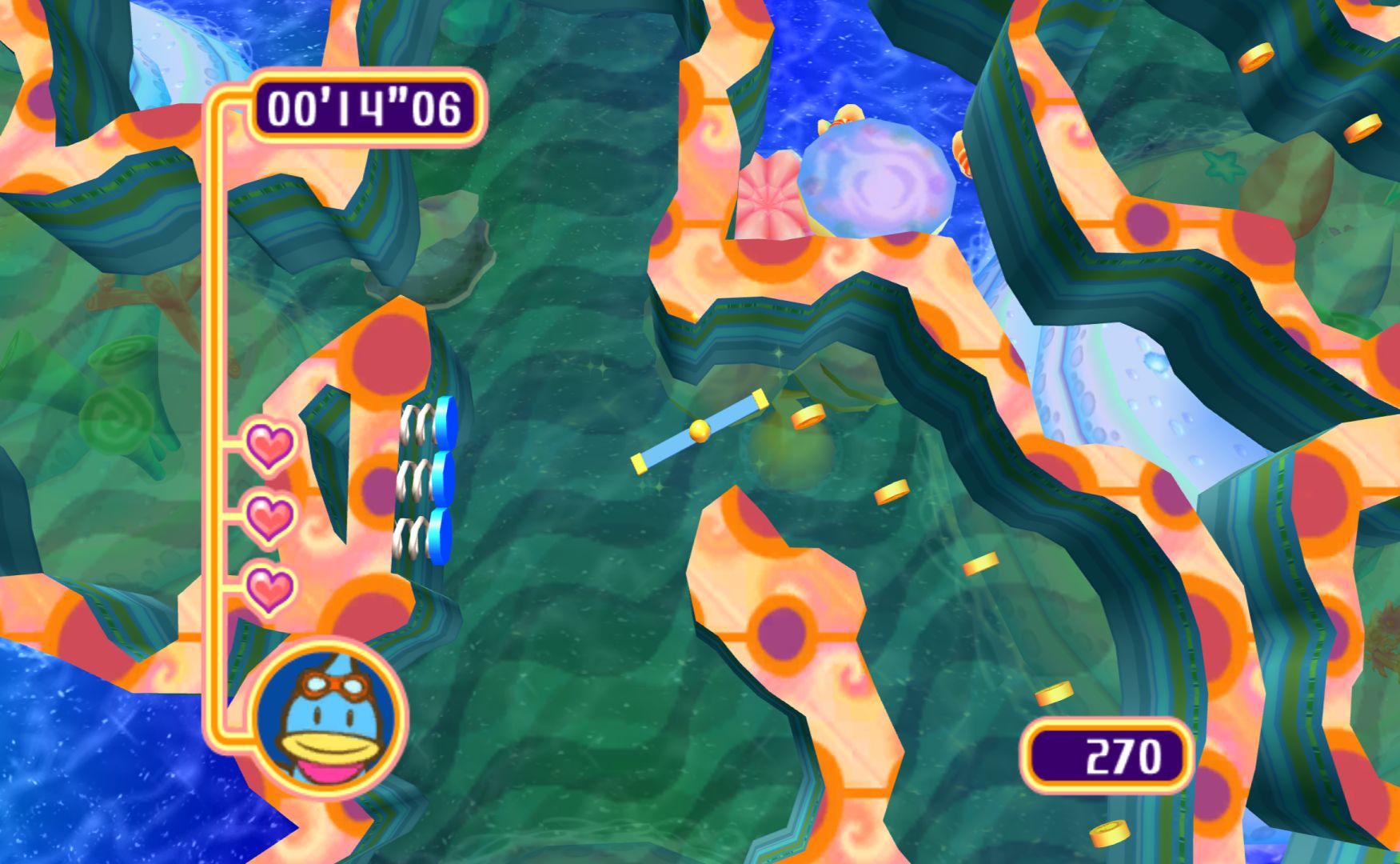 Like the other Kururin games, you control a spinning stick as you navigate mazes. It’s something that sounds simple but is immensely difficult, as the rotation of the stick will alter how difficult certain bends are. Levels have gimmicks to change things up, the simplest one being springs that let you change the direction of the spin.