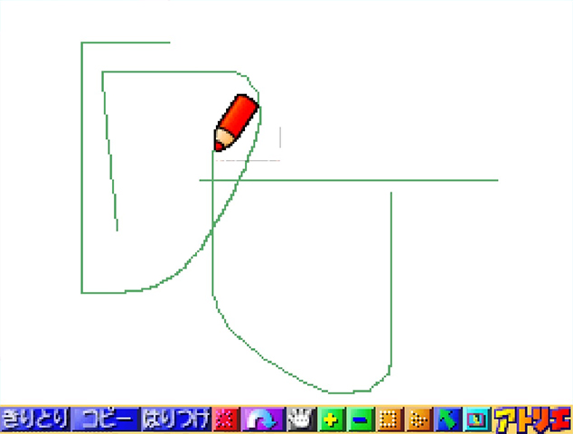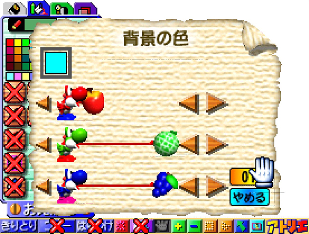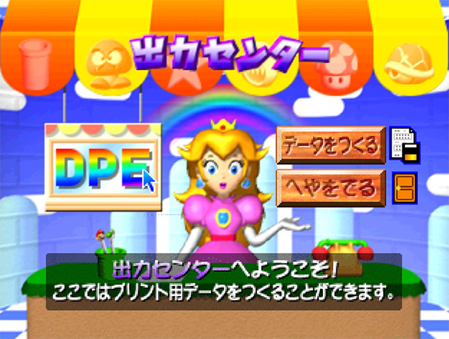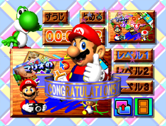 The main part is editor. Here you can load images and manipulate them. You can add different layers, draw and add some renders of characters from Super Mario 64. Some of the menus also use sprites from Yoshi’s Story. Another feature lets you create a slideshow, and another saves your creations in a format to use in Fuji prating machines found in stores.