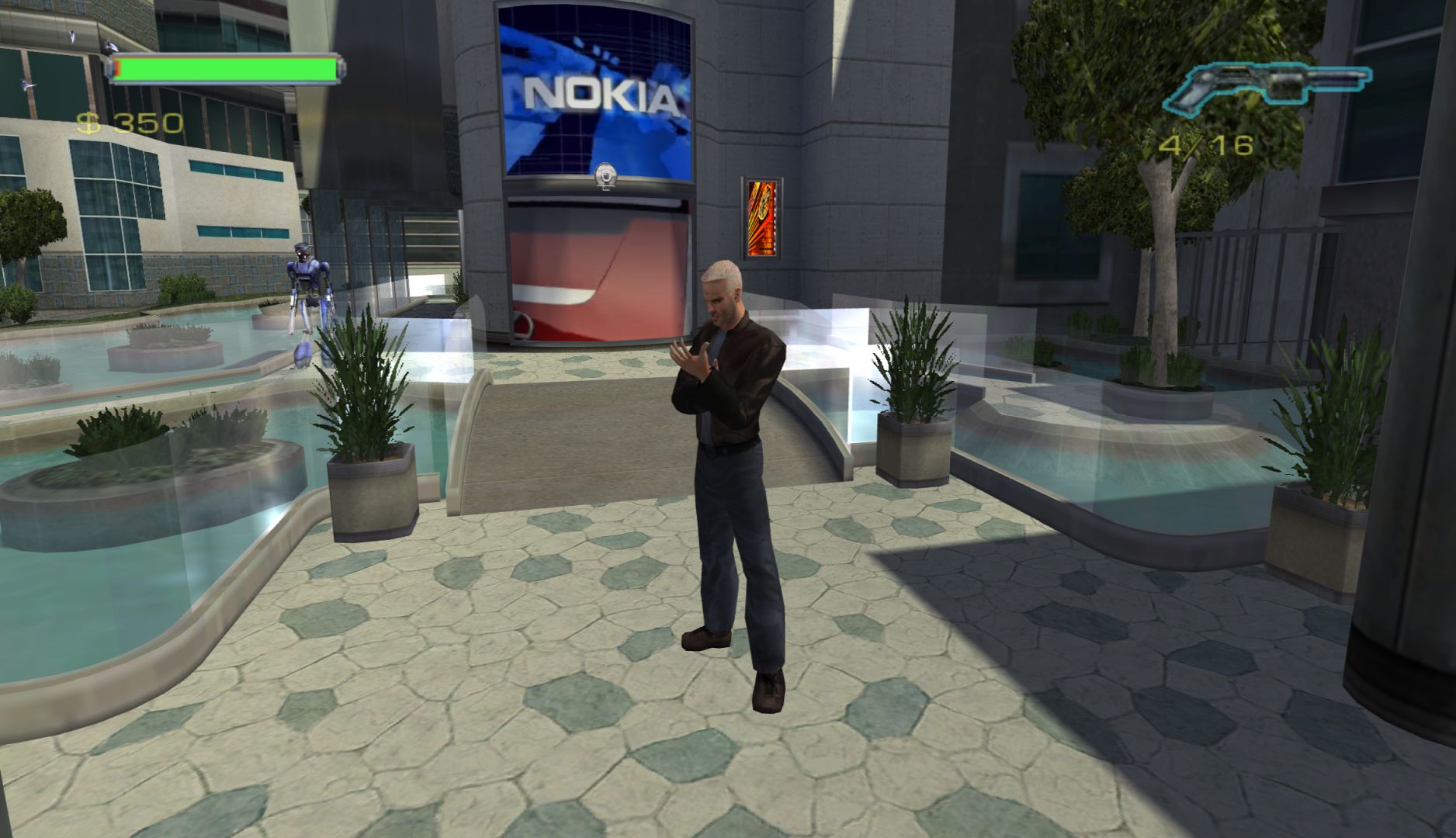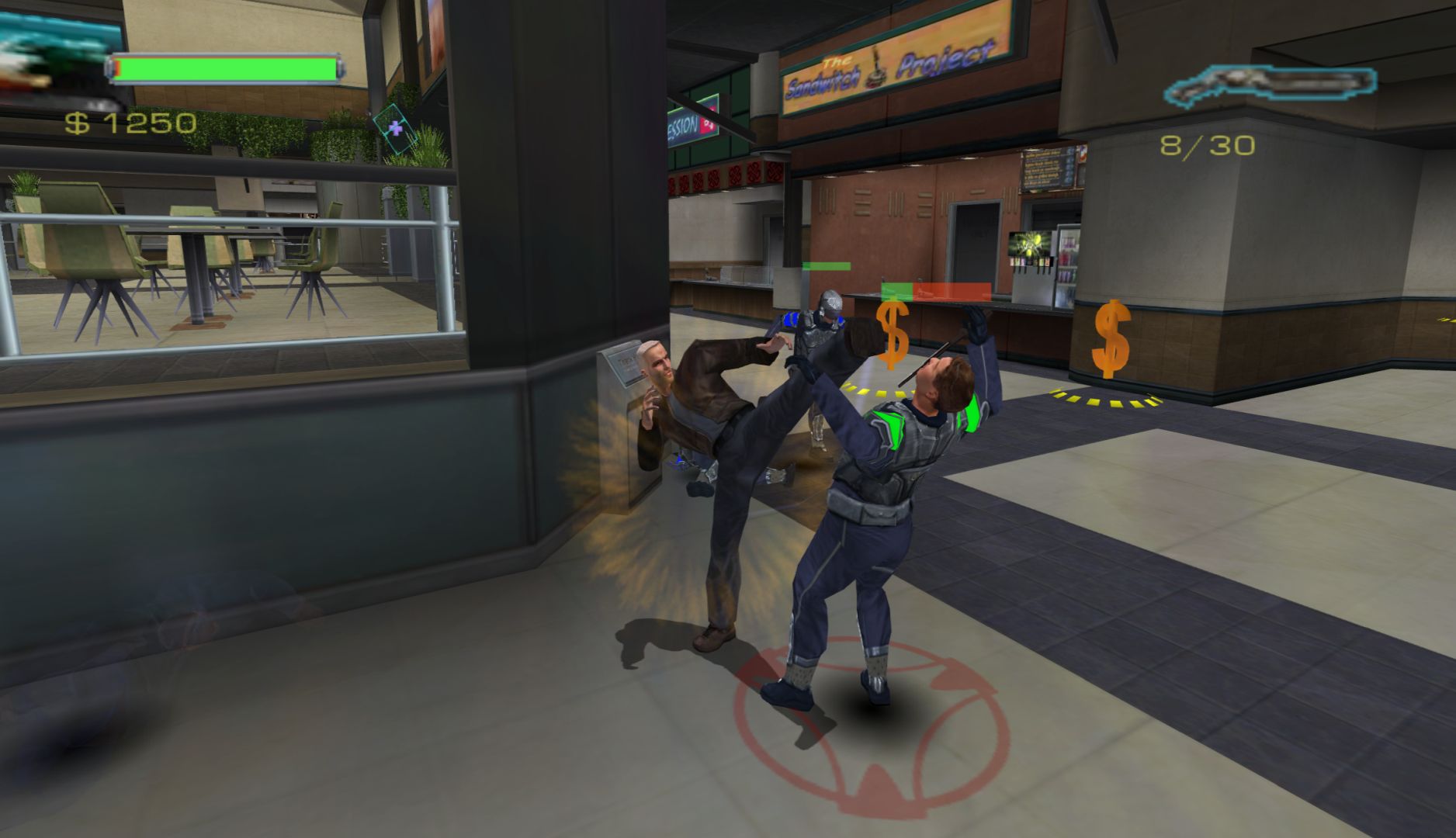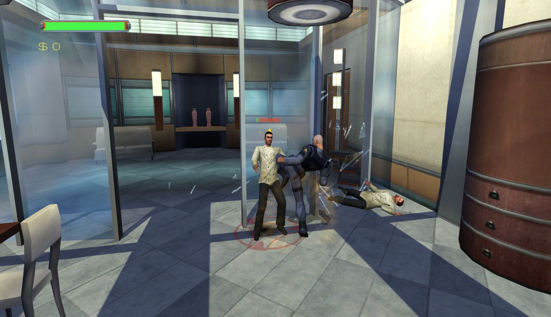 Minority Report is a very basic beat-’em-up game. Just punch and kick the same enemies over and over again. You can also pick up guns, which you can use by locking onto enemies. It’s passable combat, but won’t hold your attention for a while. The levels are also extremely short, sometimes only being a single room, which really disrupts the flow of the game. There is some nice destructible scenery and the ragdoll effects are great to see. You can also pick up enemies after you’ve knocked them out, which is mainly useful for throwing them out of windows or into vats of water and sewage.