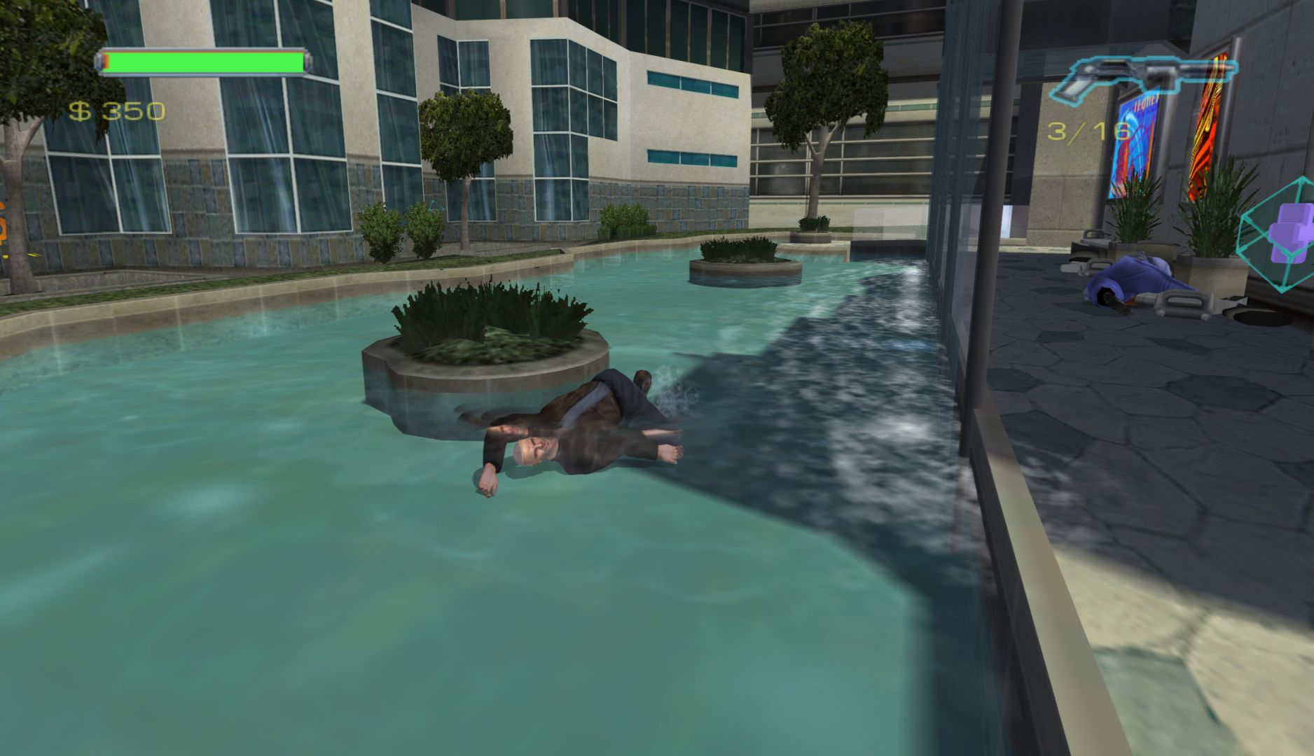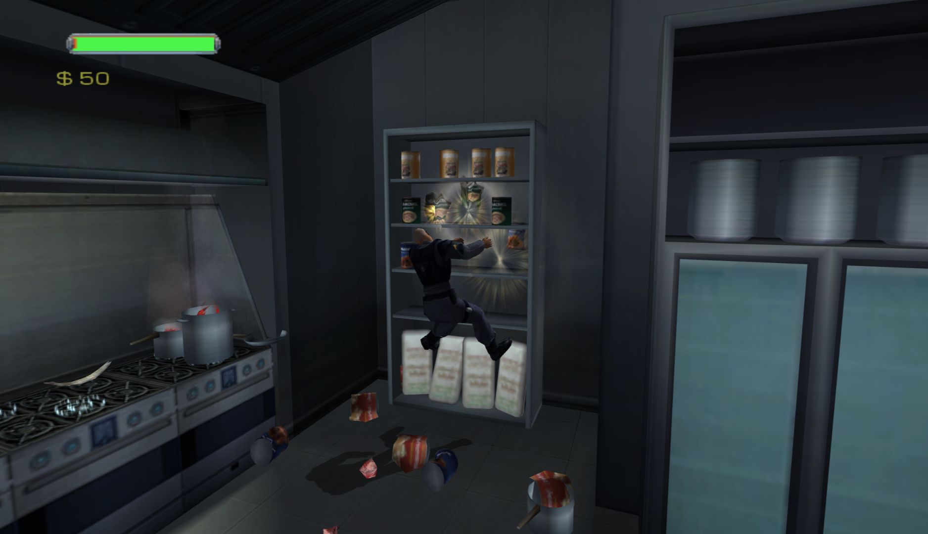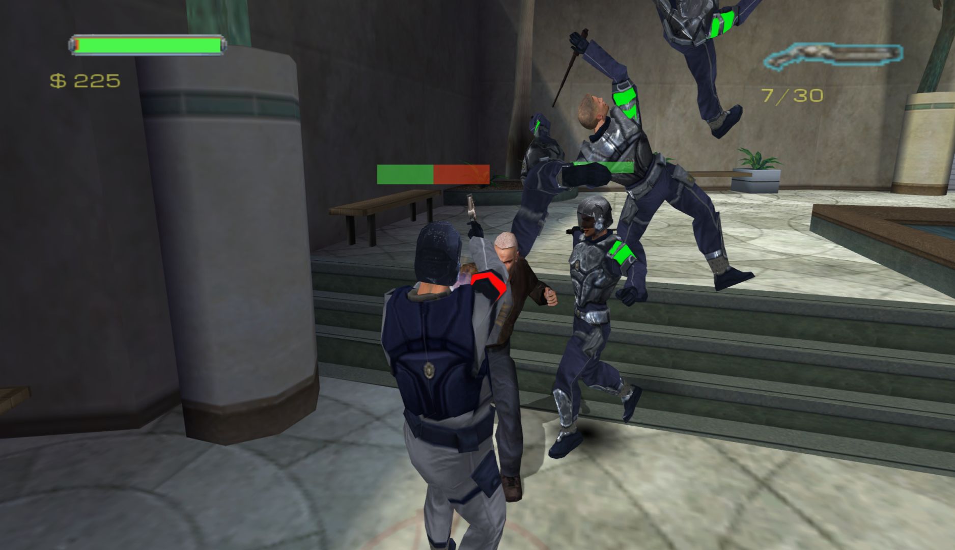 Speaking of ragdoll physics, there’s a cheat that makes Minority Report far more entertaining: one that replaces the crouch button (which is never needed) with a ragdoll button. At any point in the game, you press crouch and the game will make Anderton flop as the physics take over. Playing with this is far more fun than the game itself, especially combined with jumps and destructible scenery. The cheats turn a bog-standard beat-em-up over something silly.