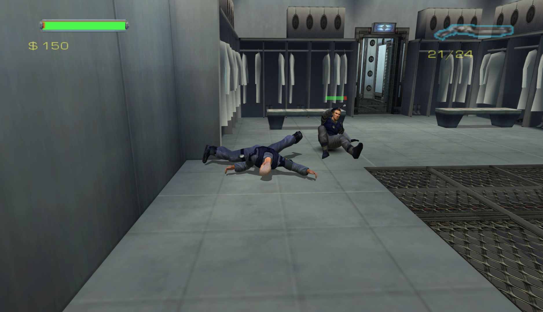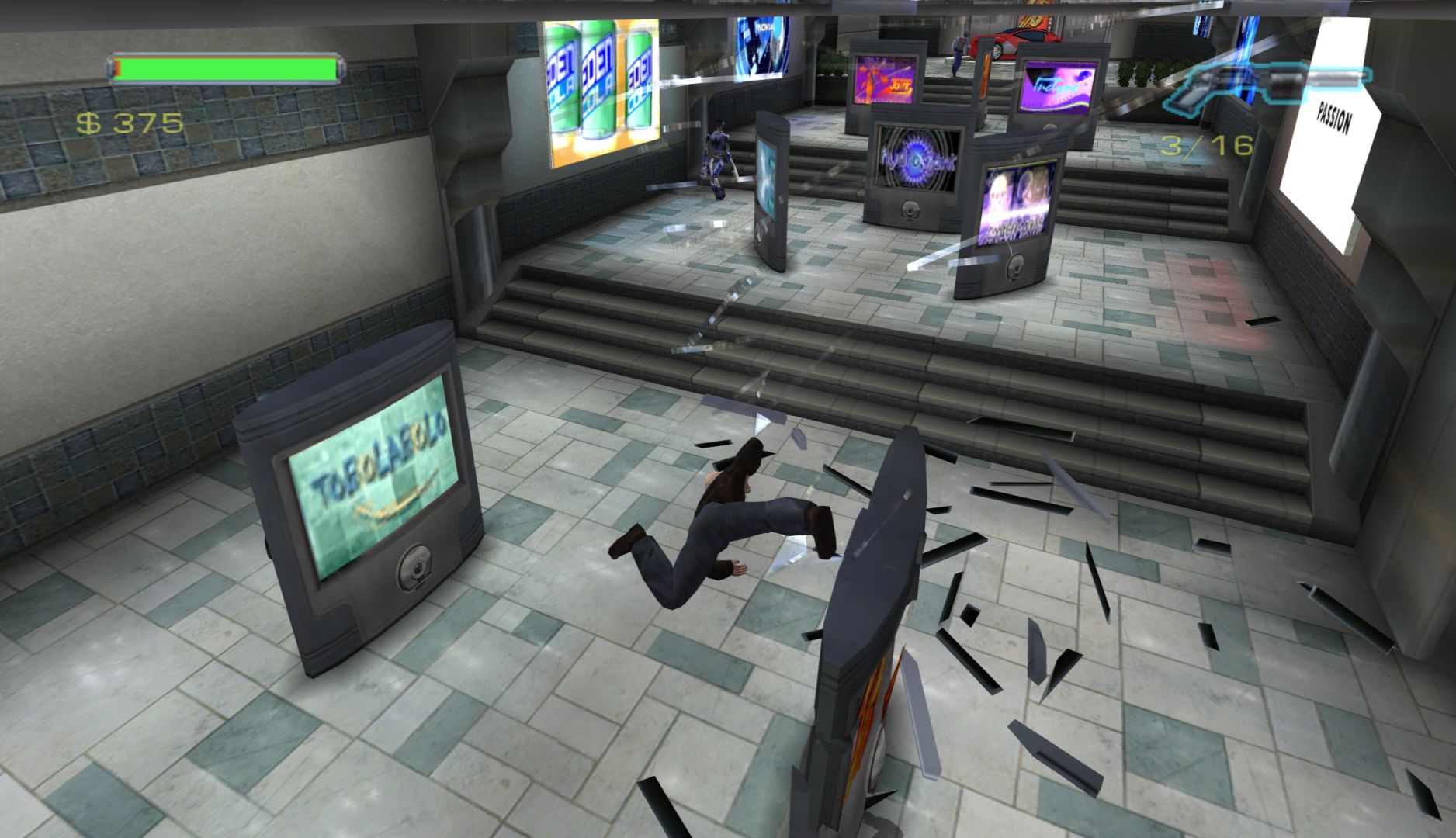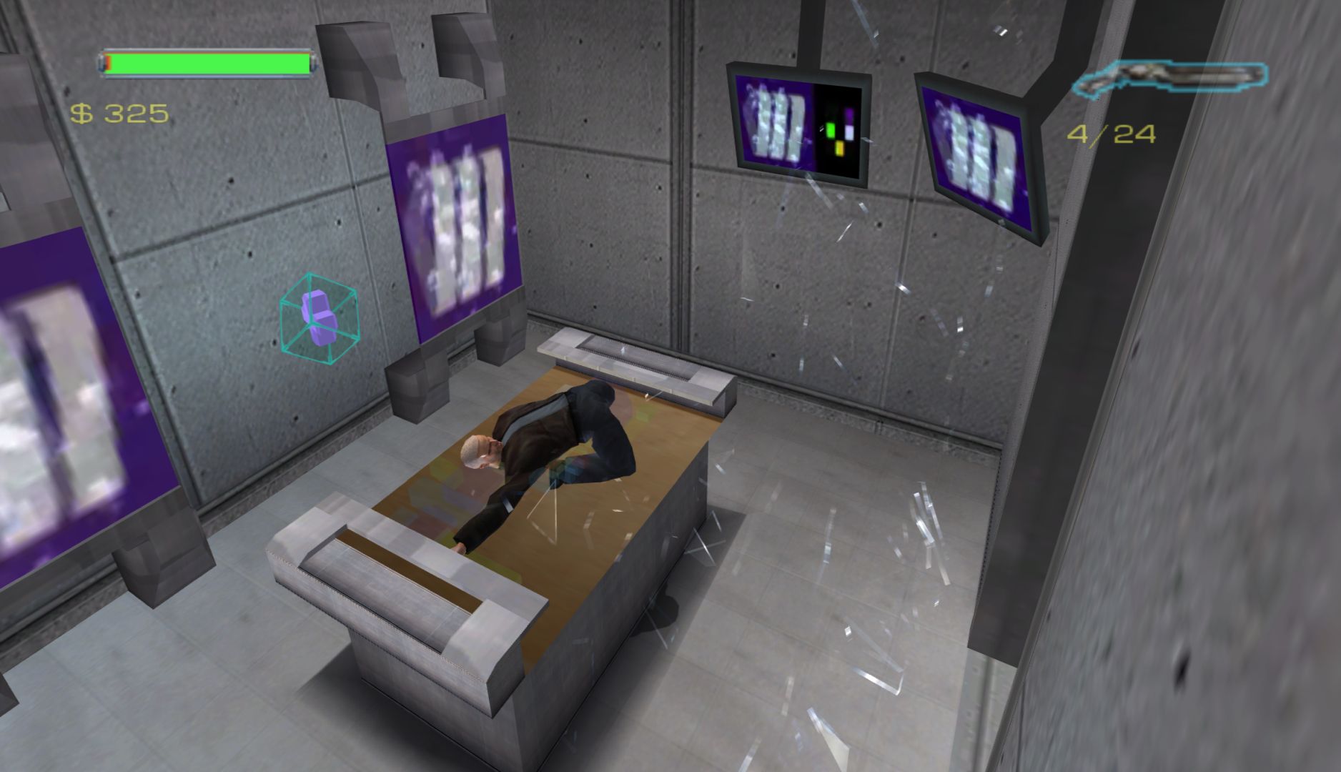 Speaking of ragdoll physics, there’s a cheat that makes Minority Report far more entertaining: one that replaces the crouch button (which is never needed) with a ragdoll button. At any point in the game, you press crouch and the game will make Anderton flop as the physics take over. Playing with this is far more fun than the game itself, especially combined with jumps and destructible scenery. The cheats turn a bog-standard beat-em-up over something silly.