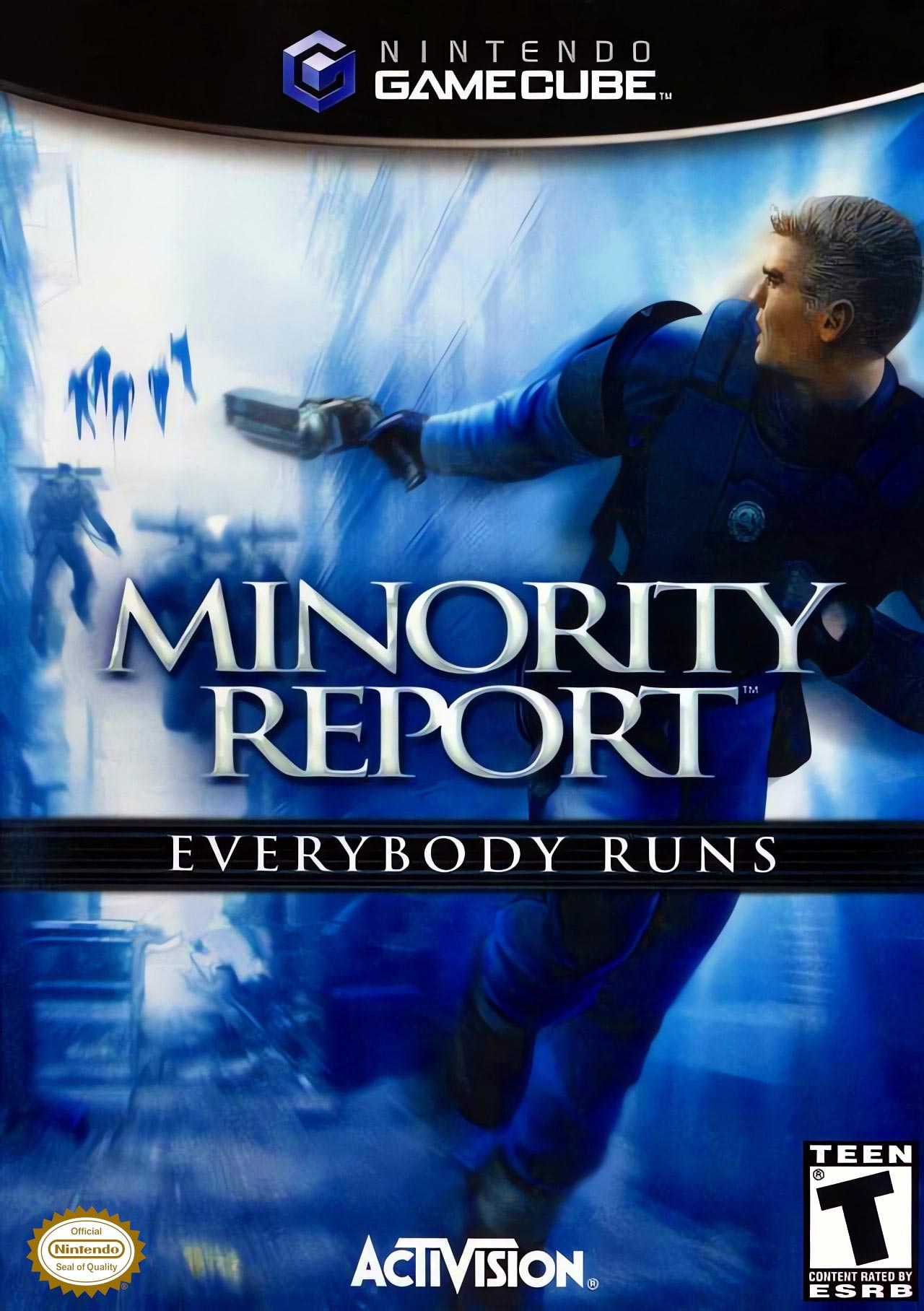 One interesting thing about this game is that almost everywhere online lists it as “Minority Report: Everybody Runs”. However, that just seems to be a tagline on the front of the box. The spine, disc, GameCube menu and the game’s title screen just lists “Minority Report”.