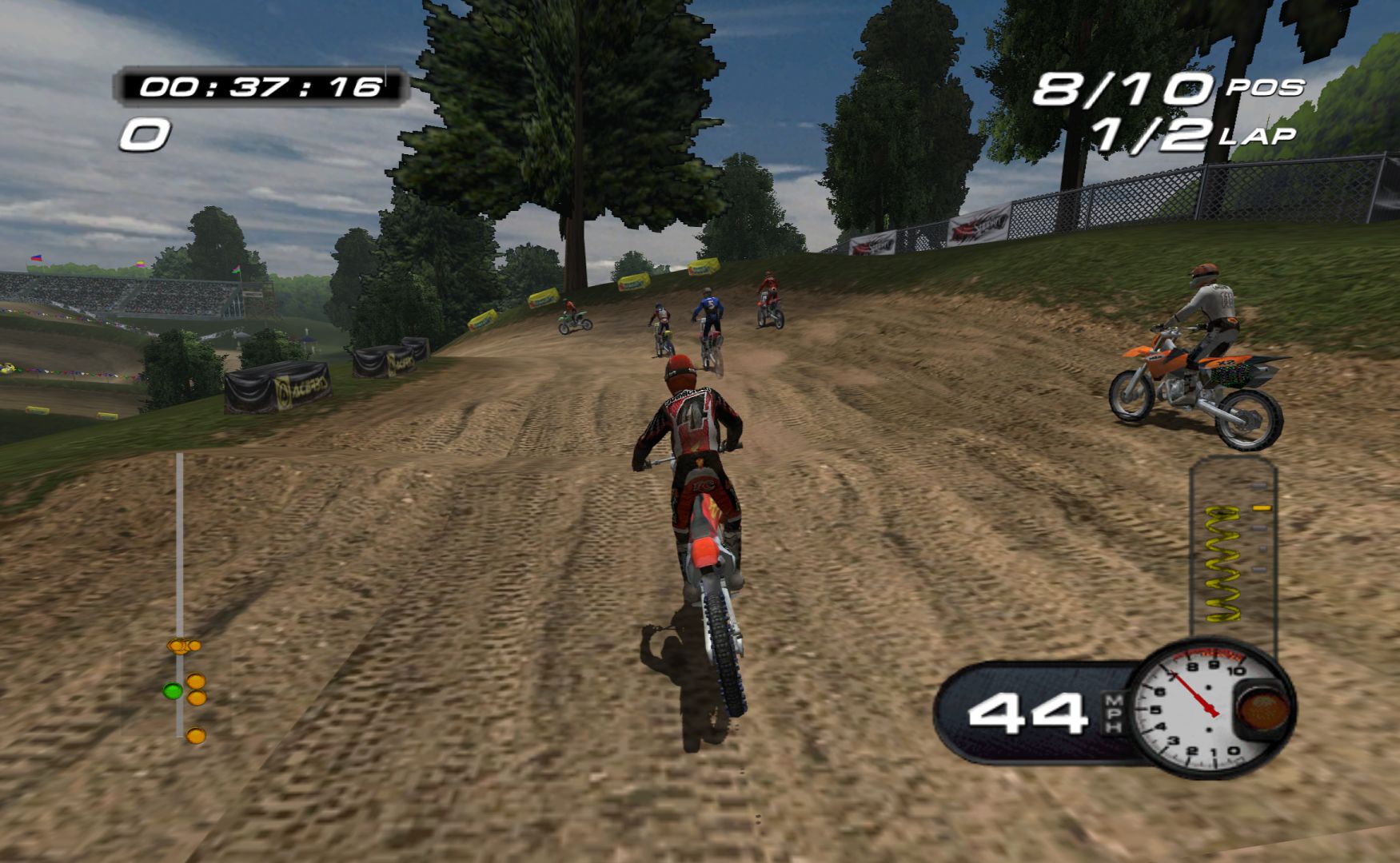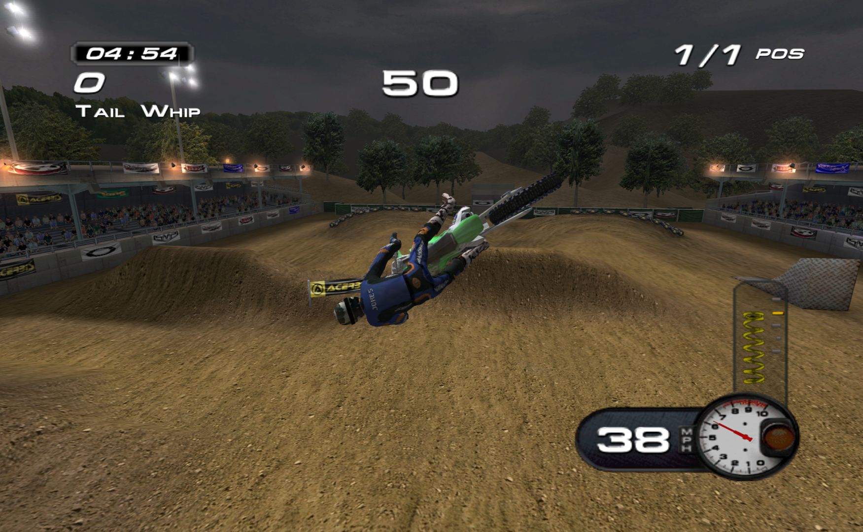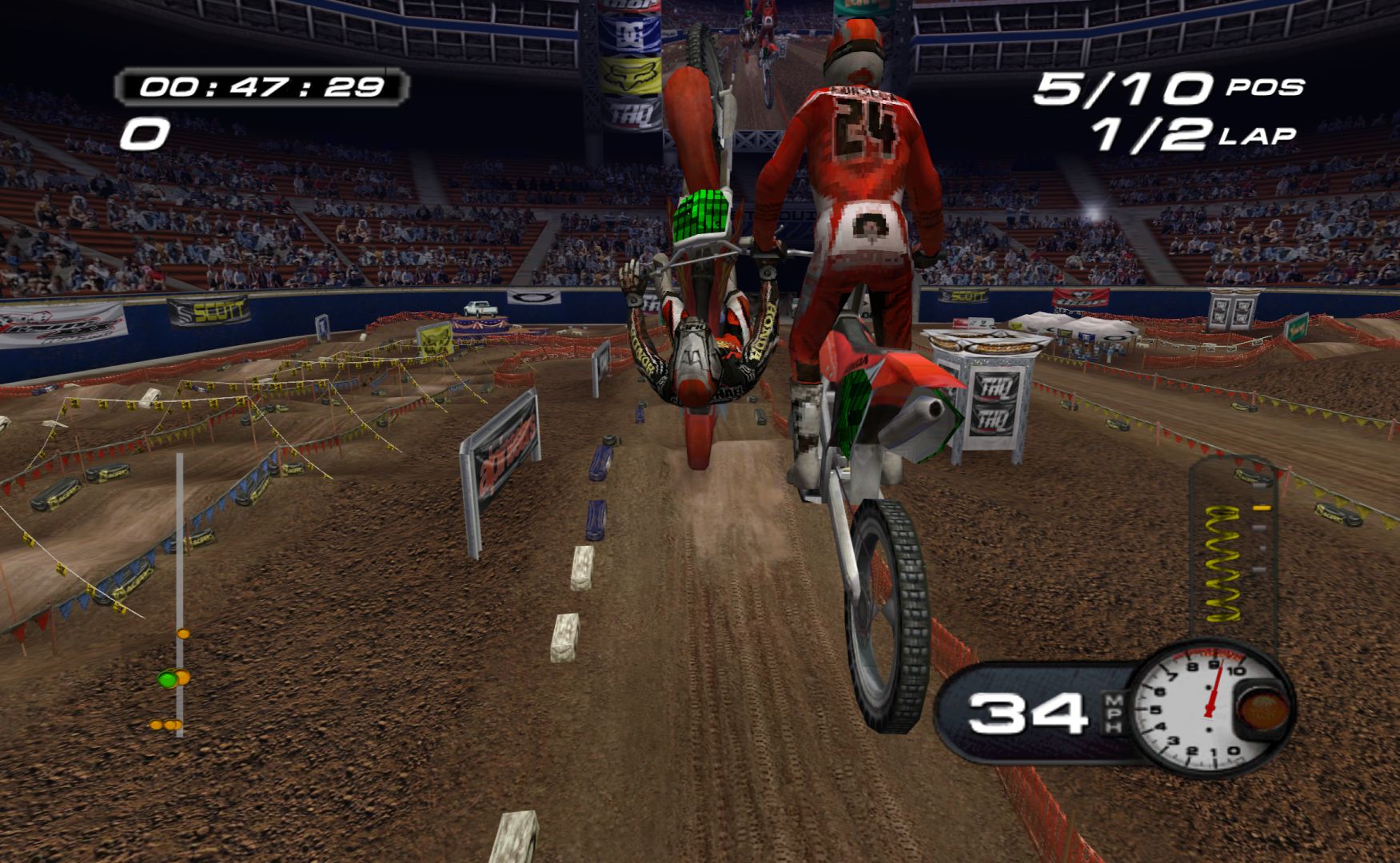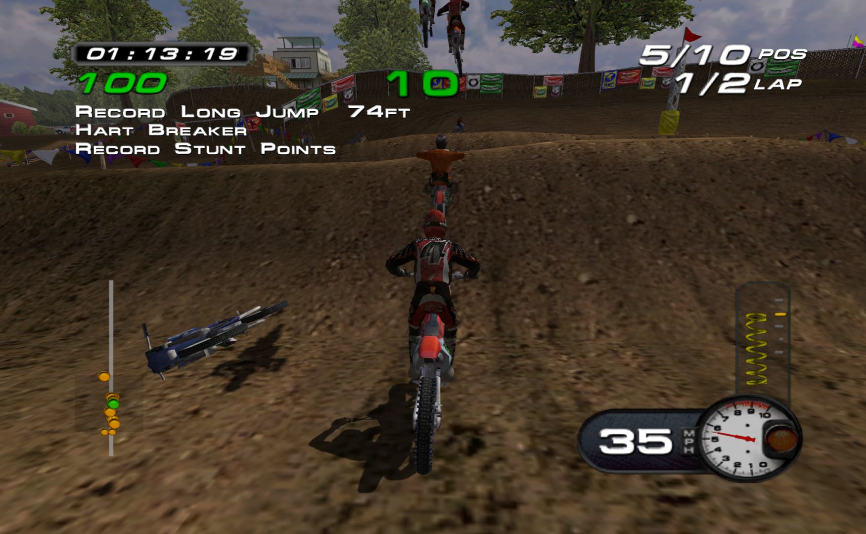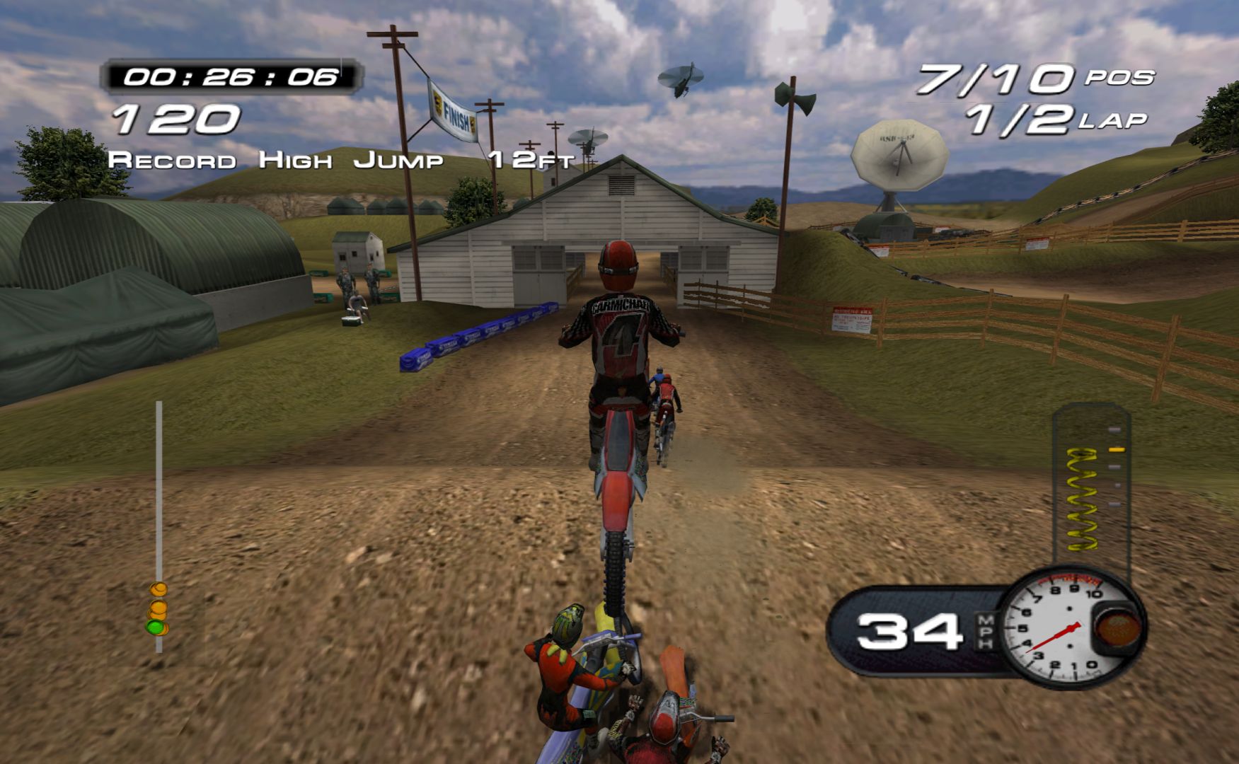 Which is a shame, as MX Superfly features some nice tracks and features. While it never goes as far as Excitebike 64 for track variation, it’s still more than a bunch of compressed stadium tracks, with other modes like freestyle and a host of minigames, like keeping balloons in the air, football, pizza delivery and more.