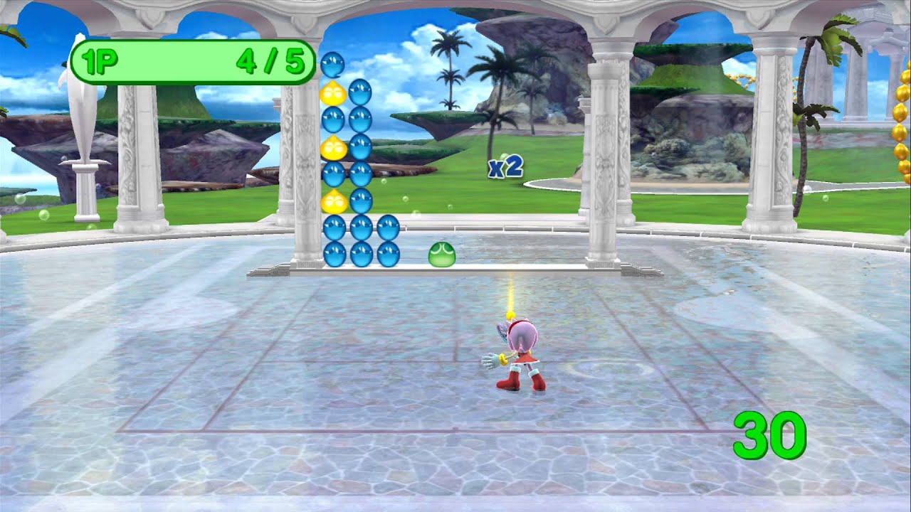 In the Super Monkey Ball missions, you’ll progress through different kinds of hitting monkey balls into holes by hitting them with a tennis ball, before ultimately playing snooker trick shots by hitting a cue ball in a way so it hits another ball into a hole (and you can’t pocket the cue ball). Each mode builds up on its concepts like this until you get to the “main mode”. The Puyo Puyo mini game is incredibly good fun, and you have to hit Poyo pieces to get rid of them (hitting blocks of the same colour will get rid of all of them). House of the Dead and Virtua Cop require you to hit enemies with tennis balls, while Chu Chu Rocket works well as tennis.