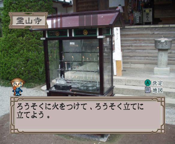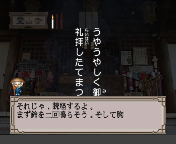 Temples are still a collection of photos, some of them panoramic, and you have to select your next location from a menu. Each section of the temple has tour which lets you know details about the location you’re at. You’ll need to locate a few areas to pray at and the game teaches you the proper etiquette for that particular dojo. There are also occasionally people you can talk to.