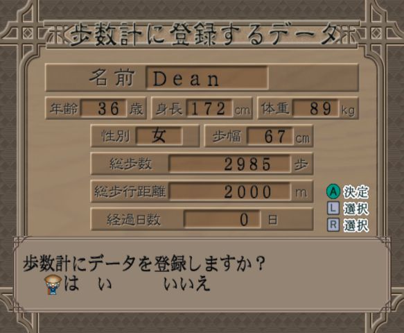 The game offers a few ways to let you walk. Two of these utilise unique GameCube accessories. The first is a pedometer, which enables you to walk around in real life then plug it into controller port 4 to transfer your steps into the game. Another is a walking mat with three big buttons, the main act as L and R while another is the A button. As these were made by Panasonic, all the brochures and advertising show off the lovely Panasonic Q version of the GameCube. If you don’t have these, you can alternate the L and R buttons to walk every step or, if you’re feeling lazy, push the analogue stick forward fast forward through the steps.