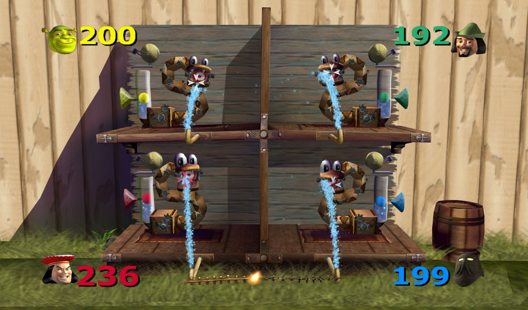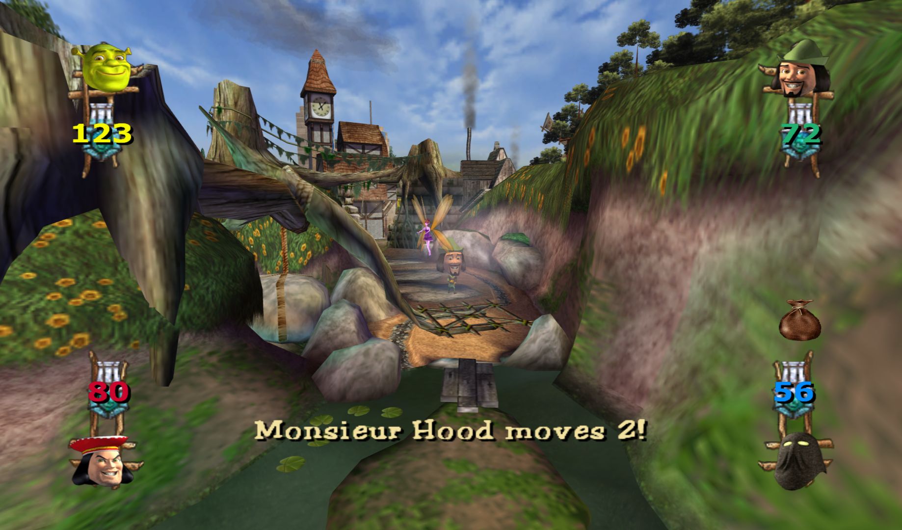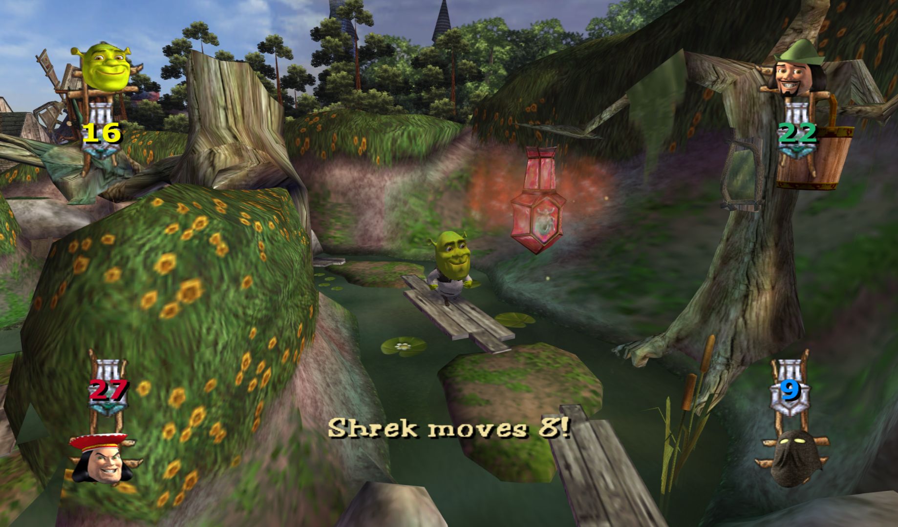 With Shrek 2 still a year away, what sort of video game can you make for Shrek? Another platformer with a unique and well designed cast of characters? Or just a really cheap Mario Party clone? And how do you explain why Shrek, Donkey, Fiona and the gang don’t talk? Well, by playing as bobblehead versions of the characters, of course. And make sure you give them creepy, dead eyes. The Magic Mirror is voiced and does narrate things. I thought it was a sound-alike, but it is the actual voice actor from the film, just very unenthusiastic.