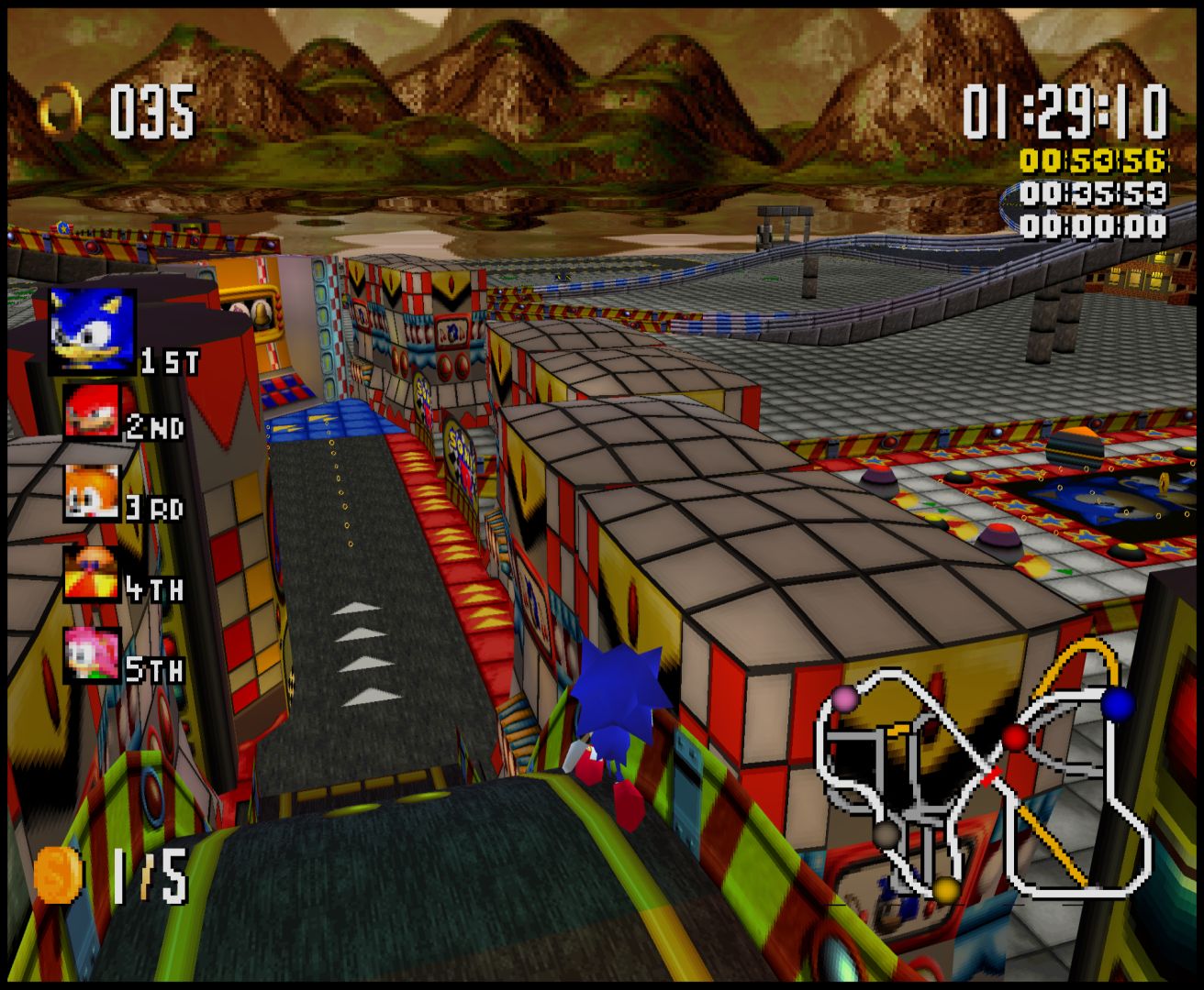 The infamous Sega Saturn racing game. It’s a racing game that consists of only five tracks and some truly terrible controls. You play as Sonic and co on foot (although Amy and Dr Robotnik are in vehicles), dashing around levels with branching paths, and parts where you can just ignore obstacles – there’s a loop in the first level you can just run around.