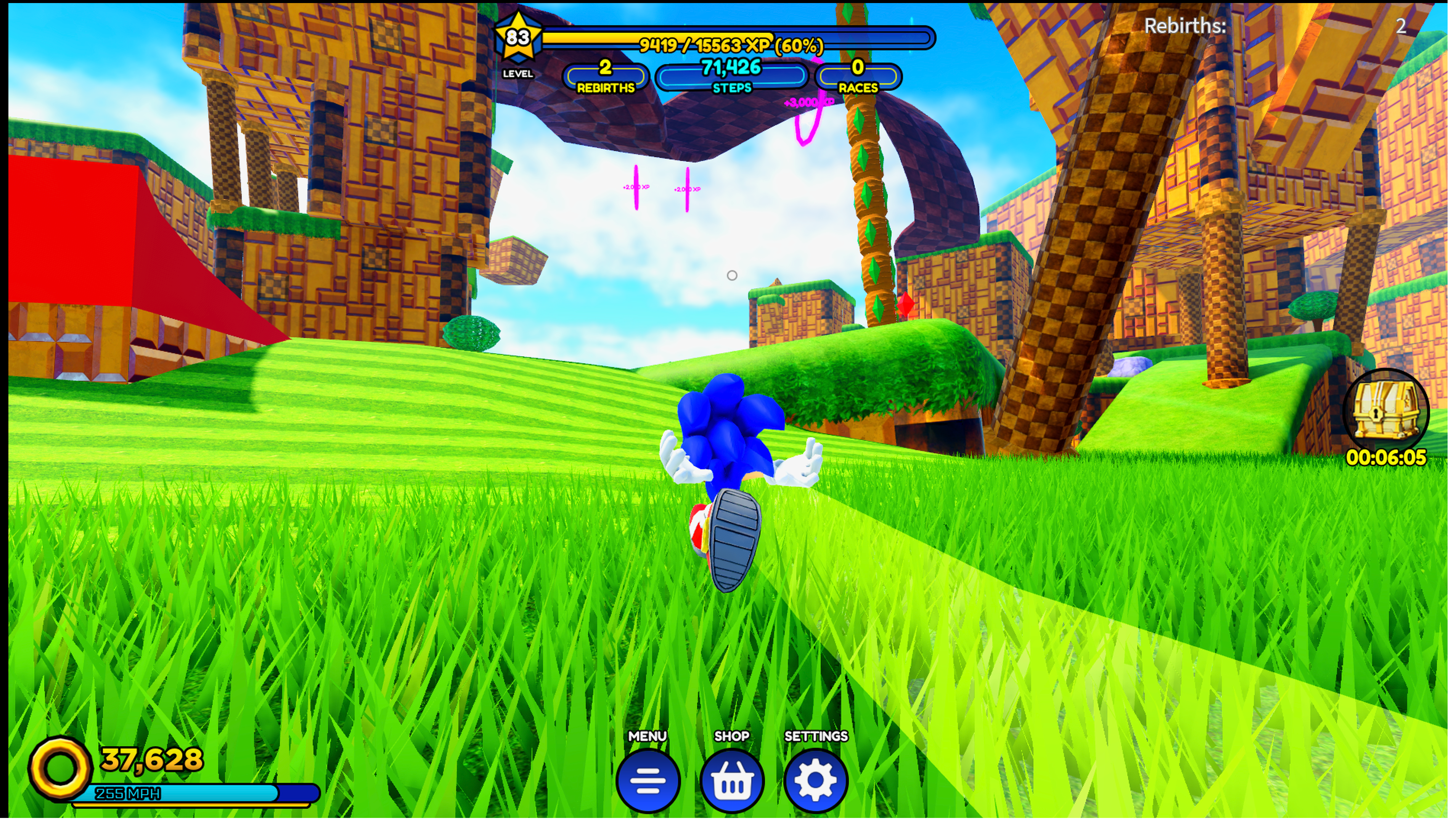 The game starts out super slow. It’s a game of grinding experience orbs. You just run around (or walk around at the beginning) and pick them up. You collect them and level up, which makes you faster so you can collect more to level up. You can find some time trials in the levels (which do set your speed to a certain level) and there are multiple levels to explore. You start off with Green Hill Zone and one level is unlocked by levelling up. The remaining ones are locked behind the “rebirth” system – once you reach max level, you can reset back to zero and gain a higher max level. The benefit (other than accessing new areas if you do it enough times) is that levelling up is quicker.