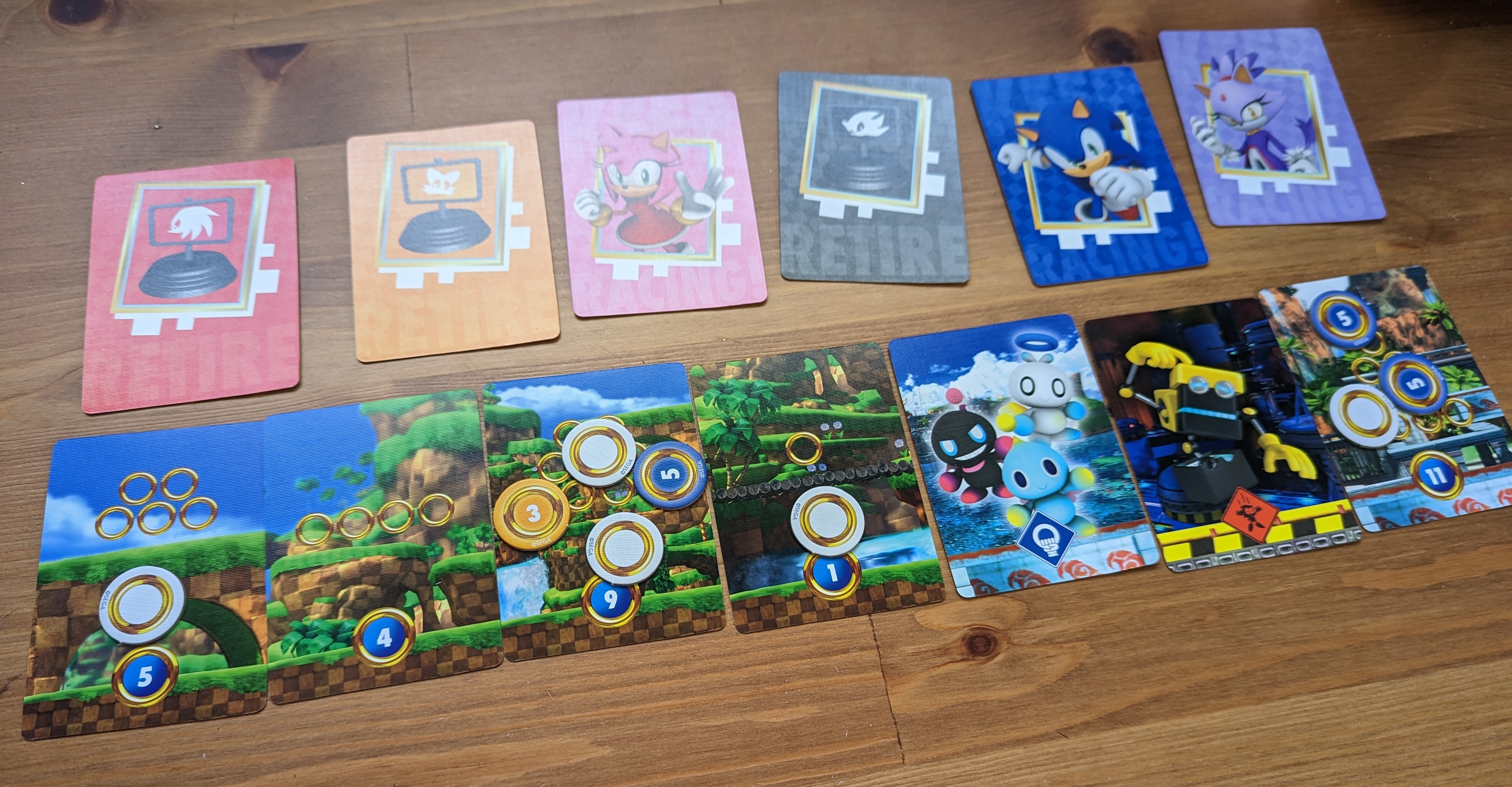 At the end of five rounds, the player with the most rings is the winner. There are also relic cards (bonus cars in this, depicting Cream, Charmy, Big, Cream and four Chao), which are worth 5 points, but can only be collected if only one player decides to retreat in a round.