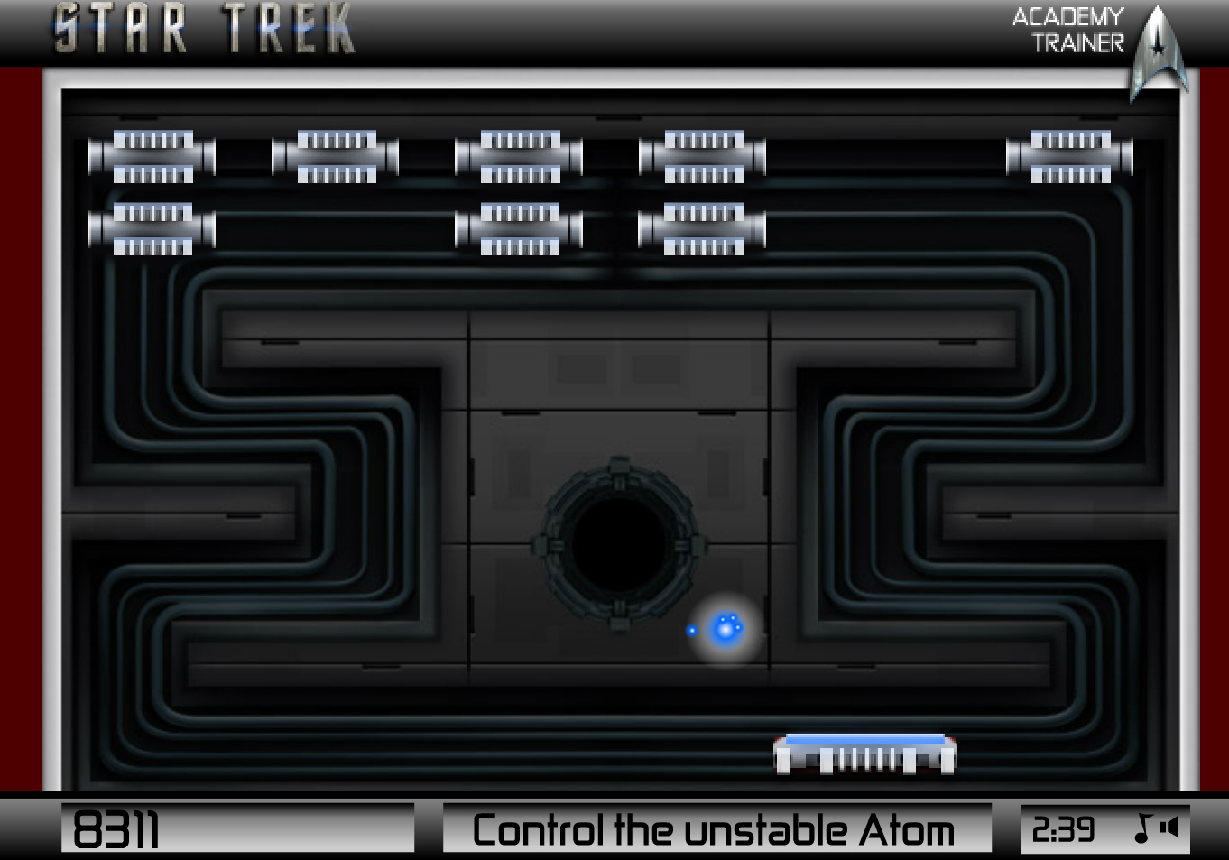 It starts off with a game where you have to match the colours of wires, then spot the difference, then you have to click to stop pulsating bars at the right position. Next is a maze where you have to move an “unstable atom” by dragging discs across the screen, followed by a terrible breakout/Arkanoid clone. Then some simple maths, more spot the difference, the memory game pairs and finally a shooting game where you blow up lots of glowing discs.