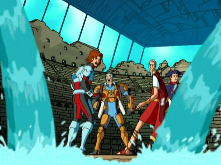 Harrison is brought to the Coliseum (Caesar does say it was after his time at least) and has to flee lions, but Bonner has a plan. He and Draga kidnap Napoleon and force him and Caesar into the Coliseum and, when they refuse to believe that they were robots, start flooding it. They spark when they touch some water and flee to the top of the cage.