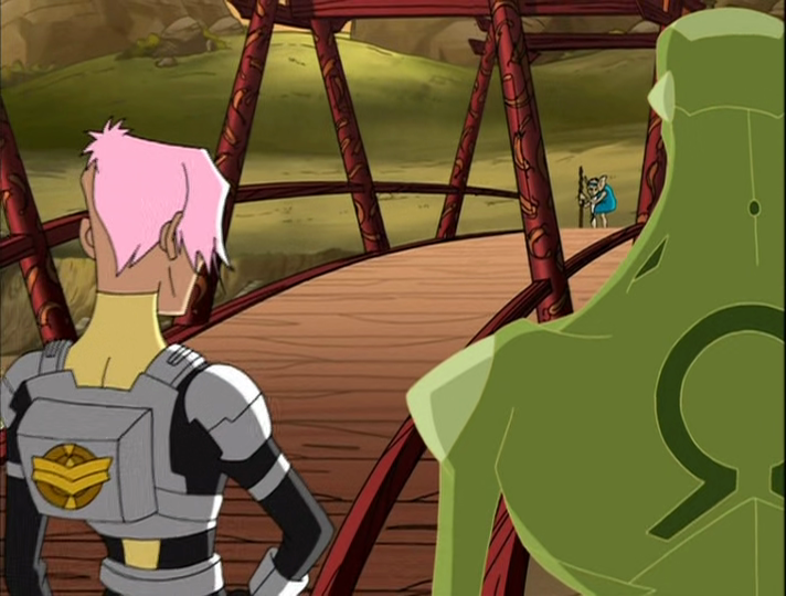The team arrive on a planet and are greeted by an elderly alien on a bridge. He says that for them to pass, they have to fight him. Stacey agrees, expecting it to be easy due to how old he looks. She gets thrashed, but the elder is happy with her determination and invites them for some food. Harrison is told to stand watch (the first time they do it, and it’s a planet where the locals can probably defend themselves).