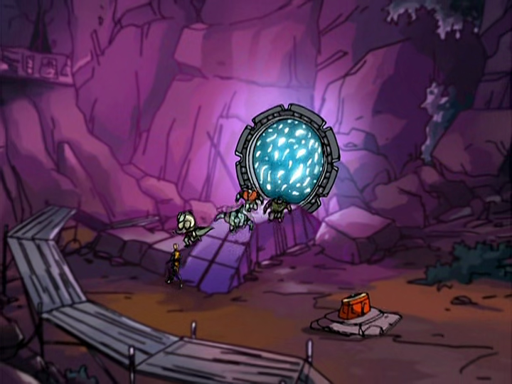 The shapeshifter Nephestis contacts Da’kyll through the stargate to tell them about the situation. He has a plan for getting rid of the team, leaving Bonner and Draga ripe for the taking. The Tlak’kahn come through and hide in the nearby cliffs while everyone is asleep (not like the General could just take the stun device into the tent). Nephestis also speaks to some thugs to set a trap for the cadets.
