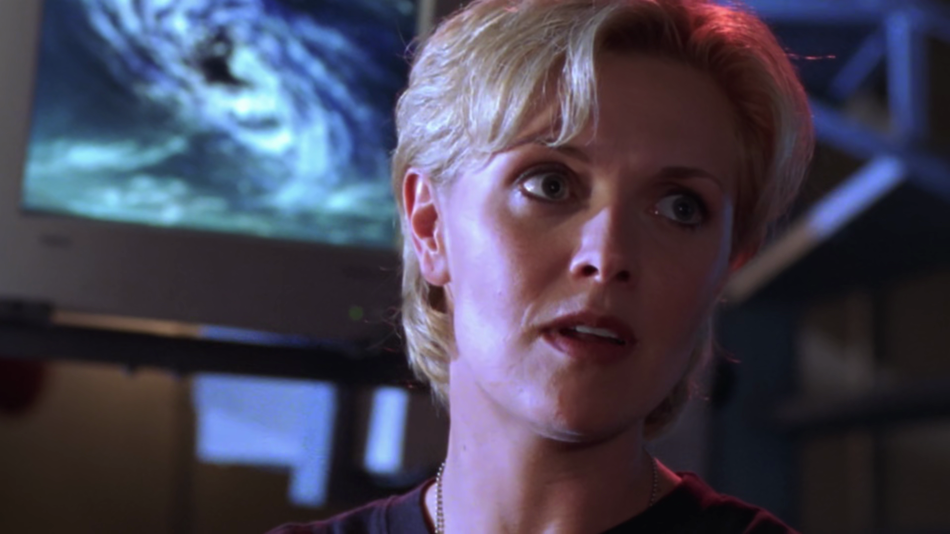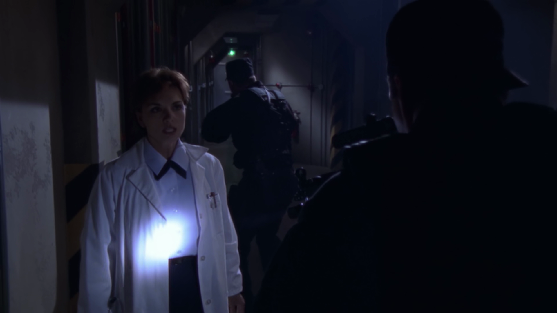 The special forces team arrive at the main level, accosting Dr Fraiser. They believe that it’s an alien invasion, but Jack lets them know what’s going on. They learn that it’s been five hours since they lost contact, a lot longer than they have experienced – they’re being affected by the time dilation. On top of this, gravity on the iris is increasing – eventually, the entire Earth may get sucked through the stargate.