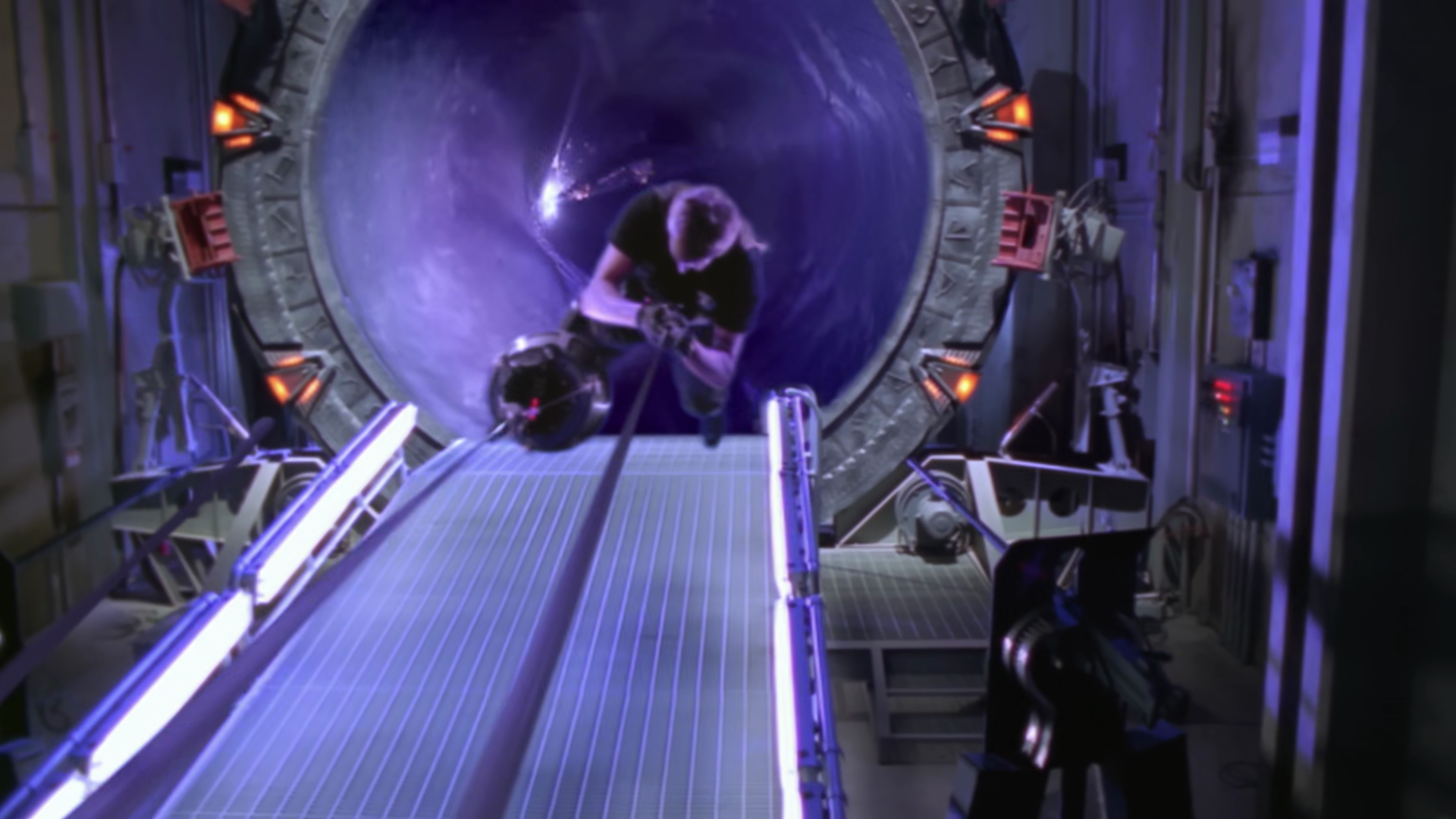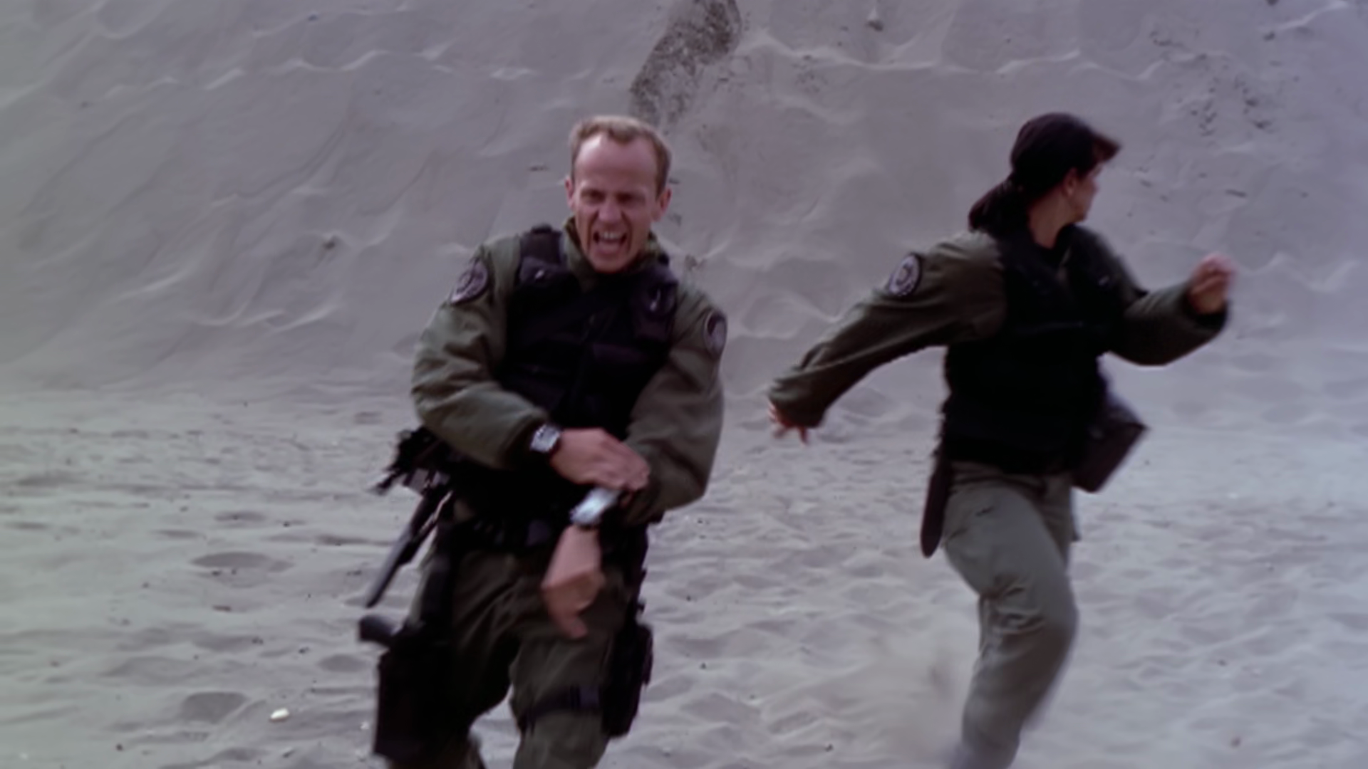 On the surface, Carter calculates that the five minutes will last six hours from their perspective, and thinks that the plan will just bury the gate, not shut it off. Hammond says that he hopes she’s wrong, as if they blow up the stargate, they can set up SGC again with the second stargate. This gives Carter an idea – directing an energy blast directly at the gate would jump the other hand to a nearby gate, where they’d be able to disengage – like when they got to the second stargate but in reverse. They get the equipment needed and rush back.