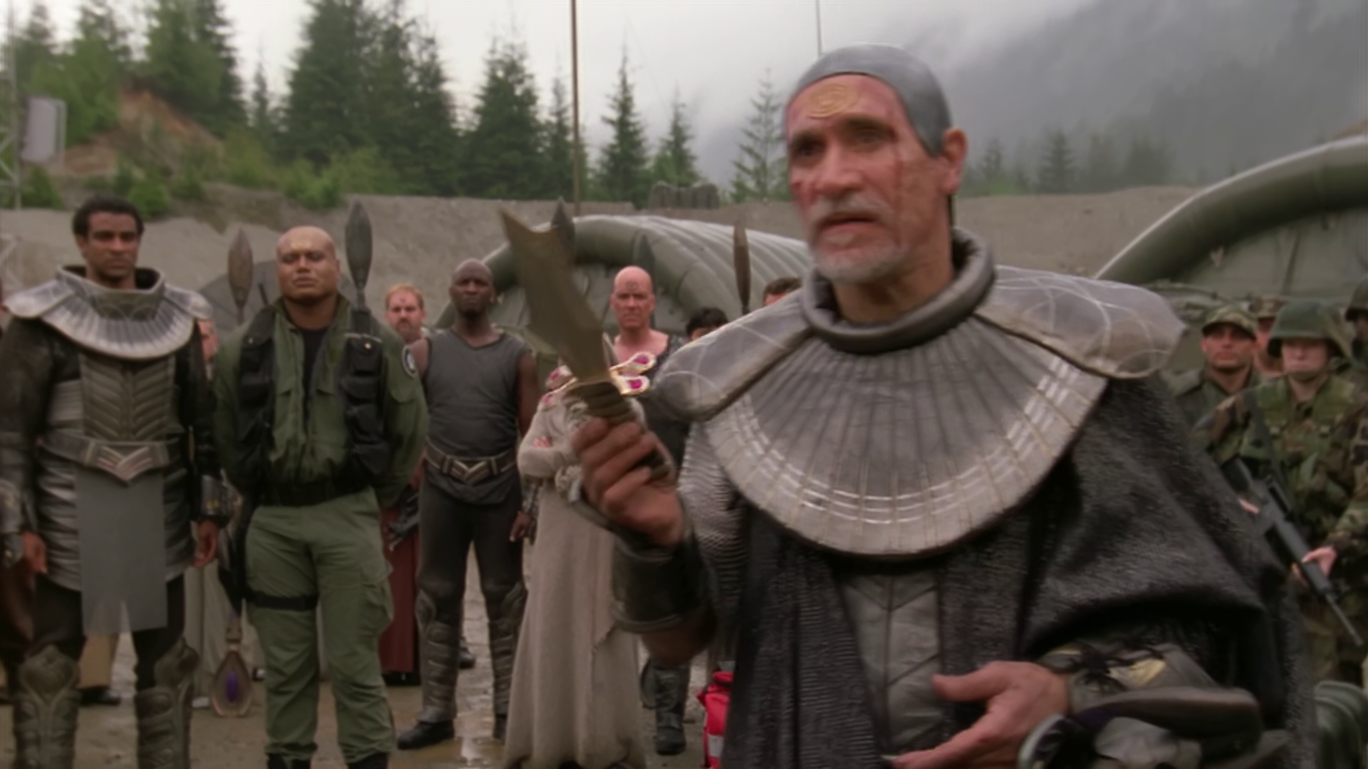 The Ashrak appears again and approaches Jack before it gets killed from behind, Bra’tac has returned and saved the day. Malek tells Bra’tac that he owes him his life twice over, and hopes he can return the favour some day. Bra’tac picks up the blade and makes a speech: the blade has spilt the blood of the three people, it also brought them all together, so it should be a symbol of cooperation. He throws it into the ground.