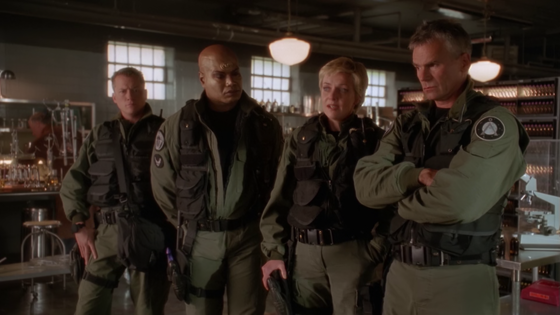 Jonas and Teal’c decide to investigate where the Tetronin is being made. They sneak in and find a place filled with vats of water – and inside are Gou’ald. They get spotted by security and in the scuffle, Jonas and a guard fall into the water. Jonas escapes unscaved, but the guard is taken over by a Gou’ald, except that he is just unconscious.