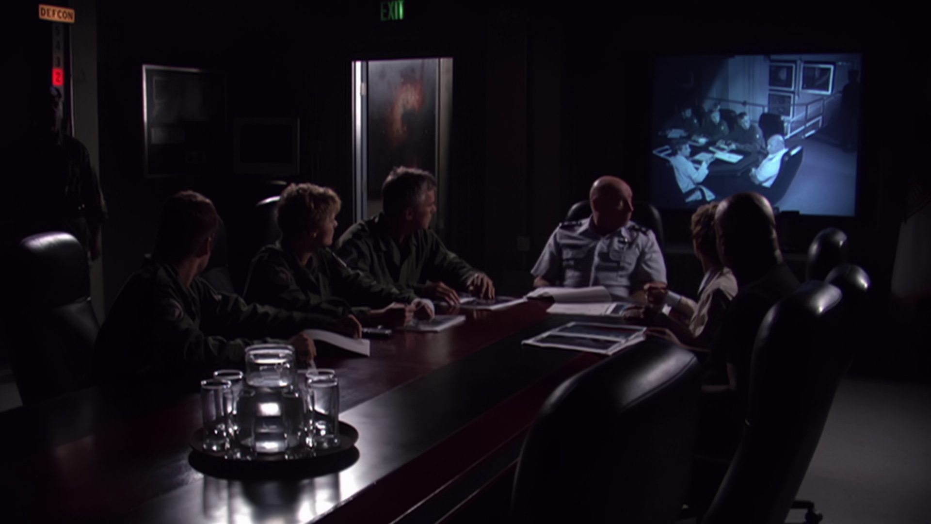 They have a briefing about the situation, with Daniel speculating that the program in their computers might be a probe, trying to gain knowledge similar to the MALP. The lights flicker and a screen starts showing a view from a camera in the briefing room. It zooms in on Jack and shows him his personnel file. It seems to understand that they’re people and it wants to communicate. Hammond is unnerved by it having access to its systems, so he orders it to be removed.