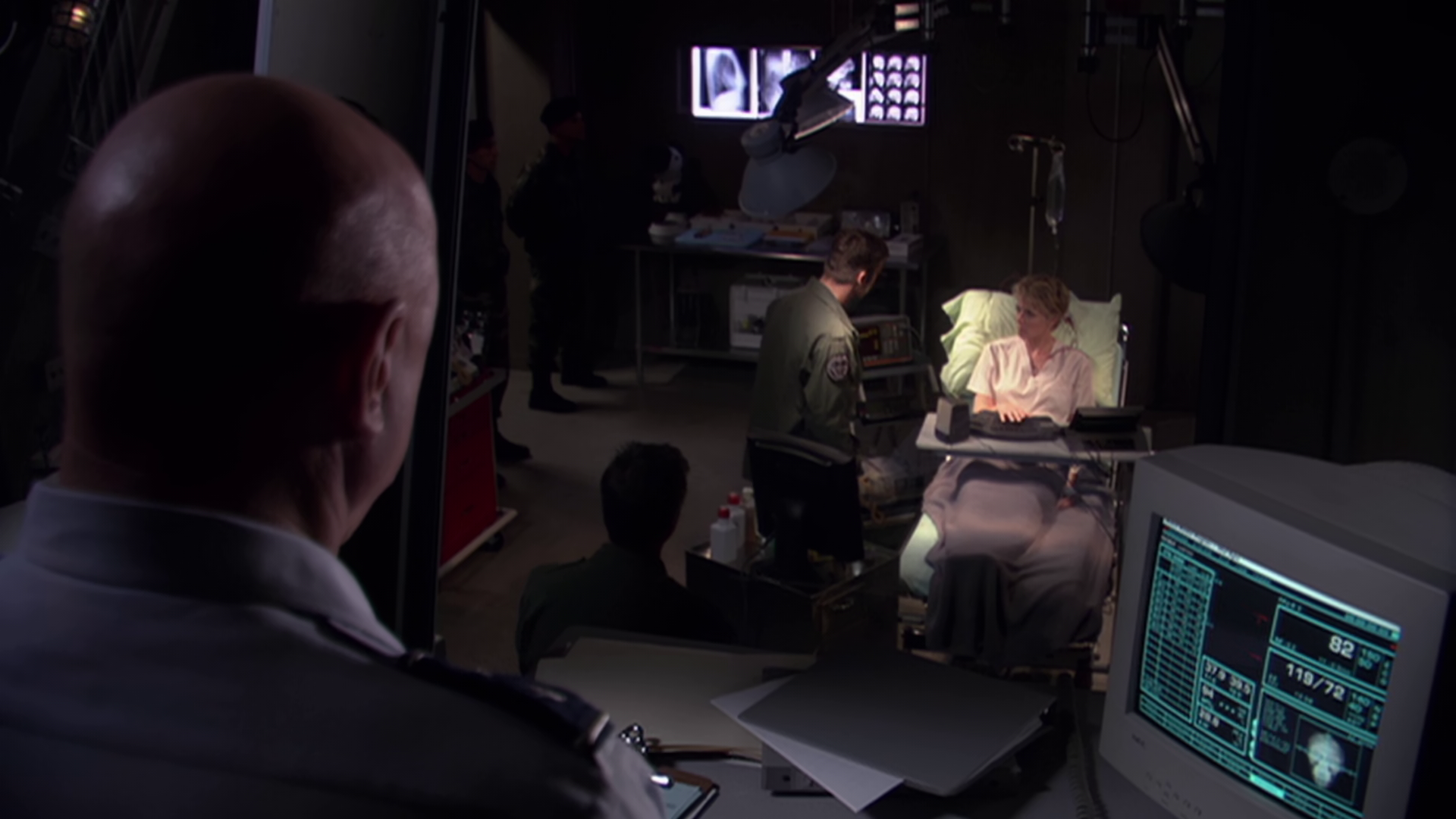 With the entity getting some knowledge (but not speech), Fraiser sets up a speech synthesiser. Jack speaks to it and it says it did it out of self-preservation – it doesn’t believe that they’ll kill Carter. They have a meeting to work out if it’s telling the truth about Sam’s mind being intact and possible actions. Daniel asks to talk to it. Hammonds tells Jack that they may have to make difficult decisions, and heavily implies he knows about Jack and Sam’s feelings for each other.