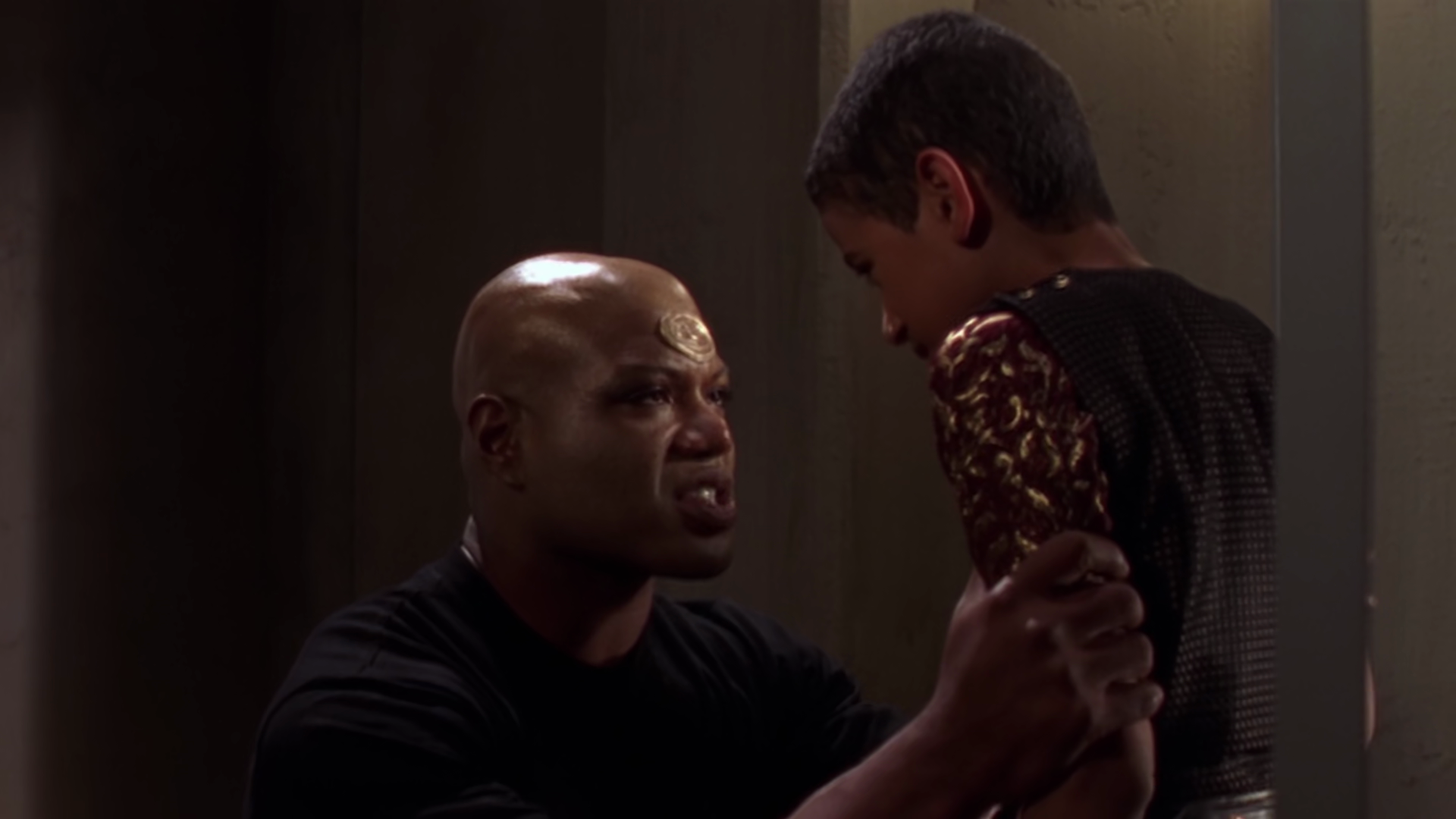 During the night, Drey’auc speaks to Teal’c and reveals she only married to give their son a better life, she still loves Teal’c. They kiss and Fro’tak sees them, who immediately sets out for the palace. A suspicious Jack sees him leaving and follows. Fro’tak goes to the palace and says he can lead Apophis to the traitor. Jack shoots the guard and gives Fro’tak a chance, but when he calls out for the guards, Jack kills and vaporises him.
