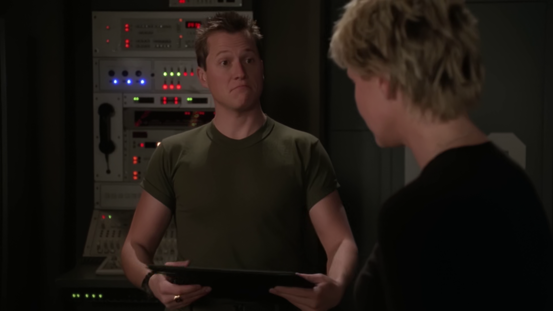 Carter visits Jonas, who is pretty much just moping around Daniel’s lab, having been cooped up in the base since he left his homeworld three months earlier when Daniel ascended. He’s read all of Daniel’s notes and seems fascinated in how Earth can predict the weather. Carter says that they’re going to head to Nevada. He questions how SG-1 always know what colour uniform to wear, and Carter says that they message each other each morning.