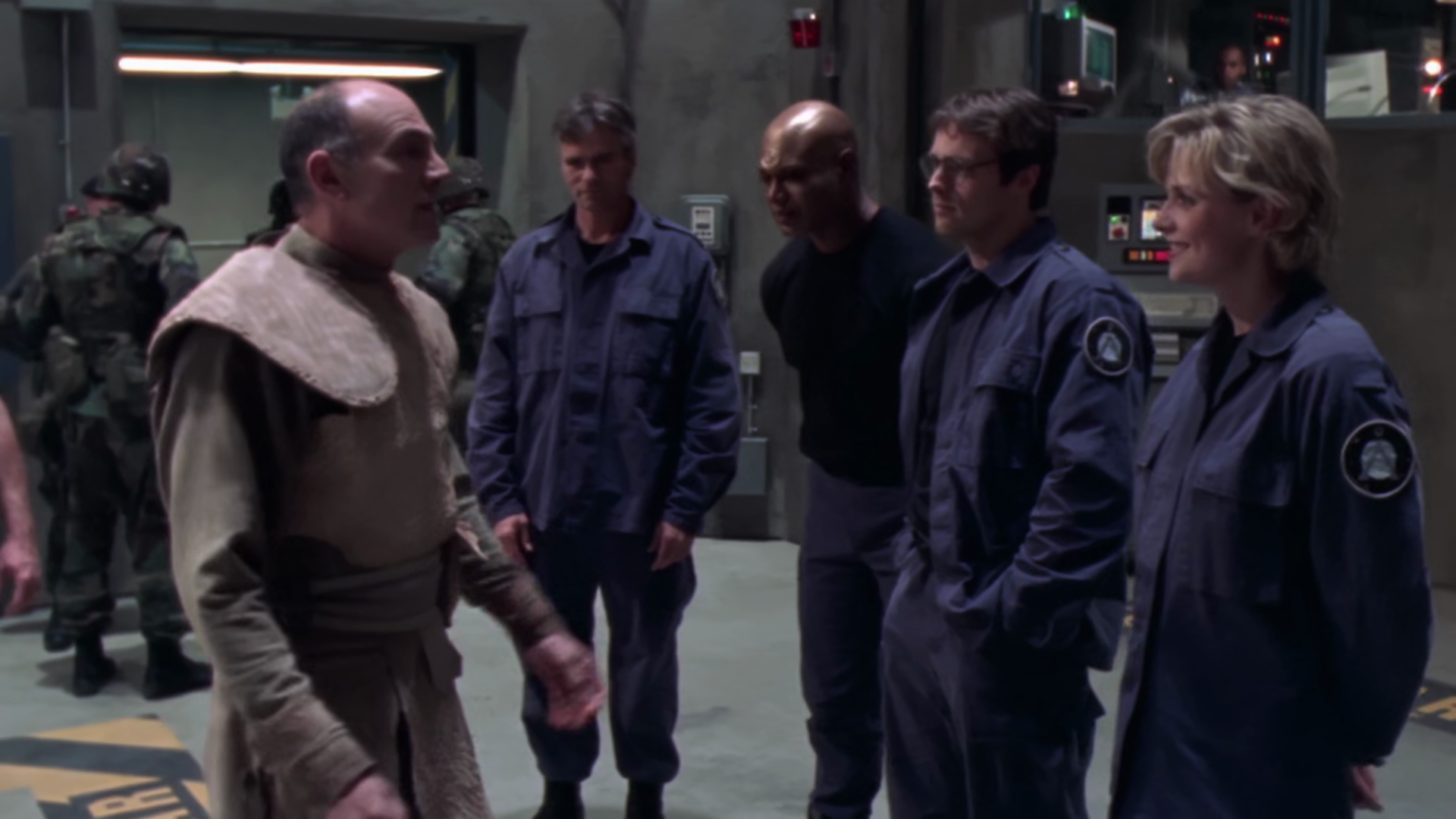 They head through the tunnel and find an empty circular room. They get brought up with a Gou’ald ring teleporter with Seth using the magic dust on them. They wake up later and get brought to Seth – the electric shock can’t be done too quickly or else the organism in the dust can “hide” in unaffected cells. It turns out the whole of SG-1 forgot that Sam had naquadah in her system from Jolanar so she instantly gets discovered by Seth, who wants to know if the System Lords or Tok’ra sent them. They get taken away to be killed.