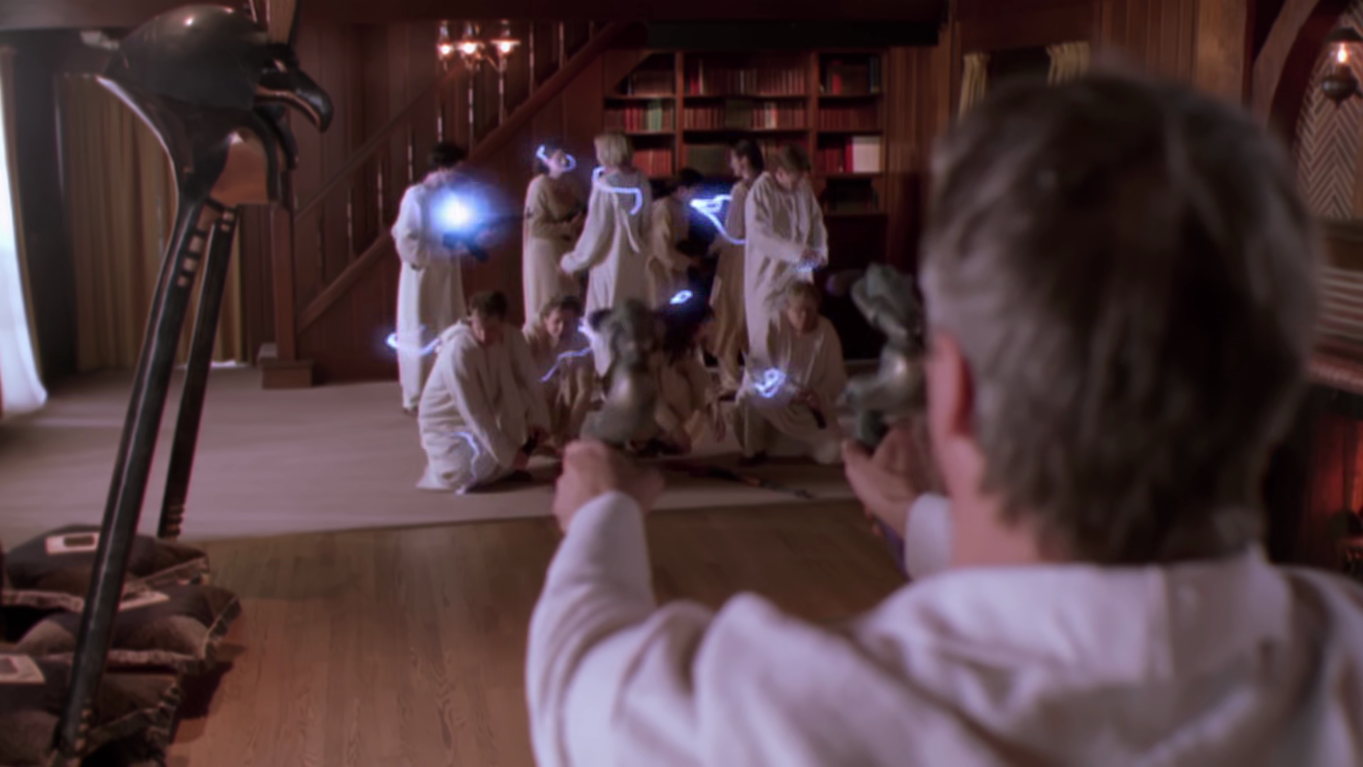 They knock out the one cult member escorting them and Zat him. He doesn’t even get knocked out, just dazed for a second, and snaps out of it. They realise he’s the son of the person they spoke to earlier. The father also manages to sneak into the tent where Jacob and Teal’c are looking after the mission, and tells them that they stopped talking after an argument months earlier with Teal’c being disturbed with how a father can not speak to his son in so long (somehow completely forgetting about his own situation with his son).