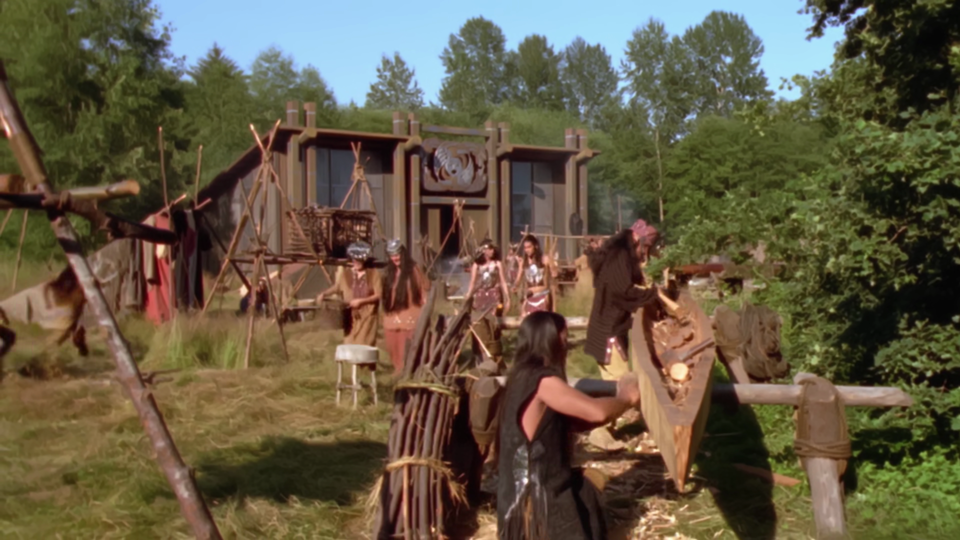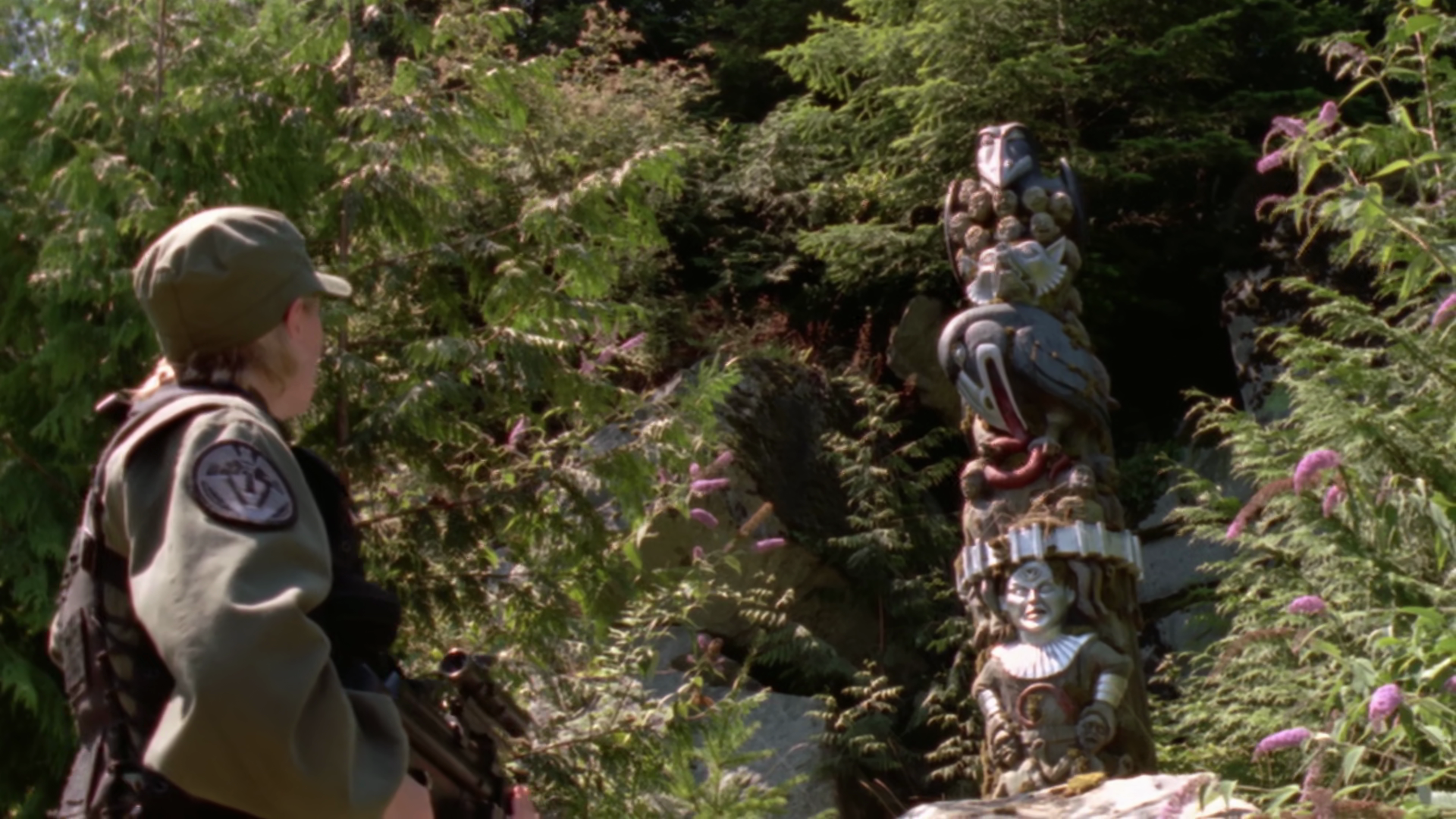 Daniel identifies the arrow as a native American design, so he expects descendants to be on the planet. As Sam, Teal’c and Daniel arrive, they find an abandoned camp, then a totem pole which tells the story of their gods conquering the Gou’ald. Teal’c keeps noticing something following them – a wolf of some kind. The three of them are then hit with tranq darts.