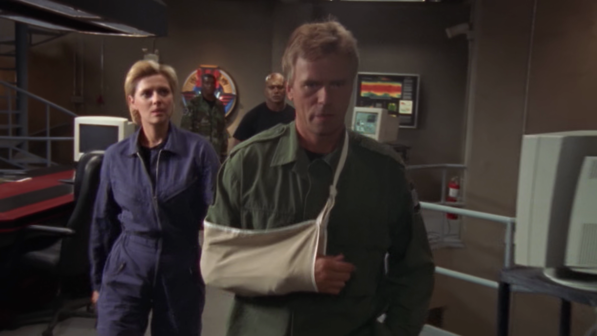 At the Stargate Command briefing table, Hammond is informing SG-1 about the current mission of SG-11 – they discovered a substance called Trinium, a very strong metal, and are currently mining some on a planet. However, they’re two days late for their check-in. SG-1 is going to be sent to investigate. However, SG-11 dial the gate – but they don’t come back through. Instead, a metal arrow flies through, goes straight through the window and into Jack’s arm. He’s going to have to sit out of this one, so it’s Carter’s first command.