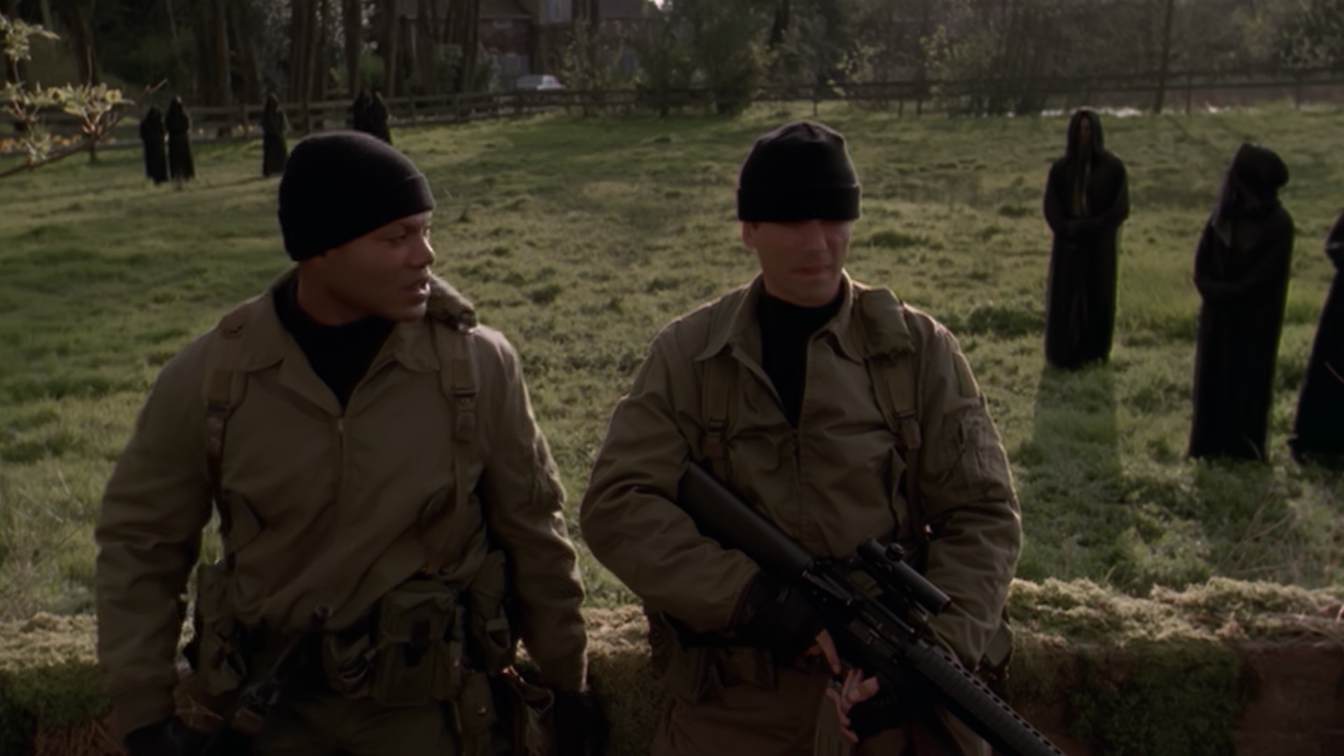 It cuts to Jack and Teal’c sitting next to a wall when an army truck appears with Kowalski and his former commander, and this is a mission from the 80s that went horribly wrong. Jack and Teal’c wonder if someone has sent them back in time to fix things. Jack and Teal’c try multiple times to keep the commander alive, with the events resetting, but the enemies seem to appear in new locations each time, they get round one obstacle and a new one appears.